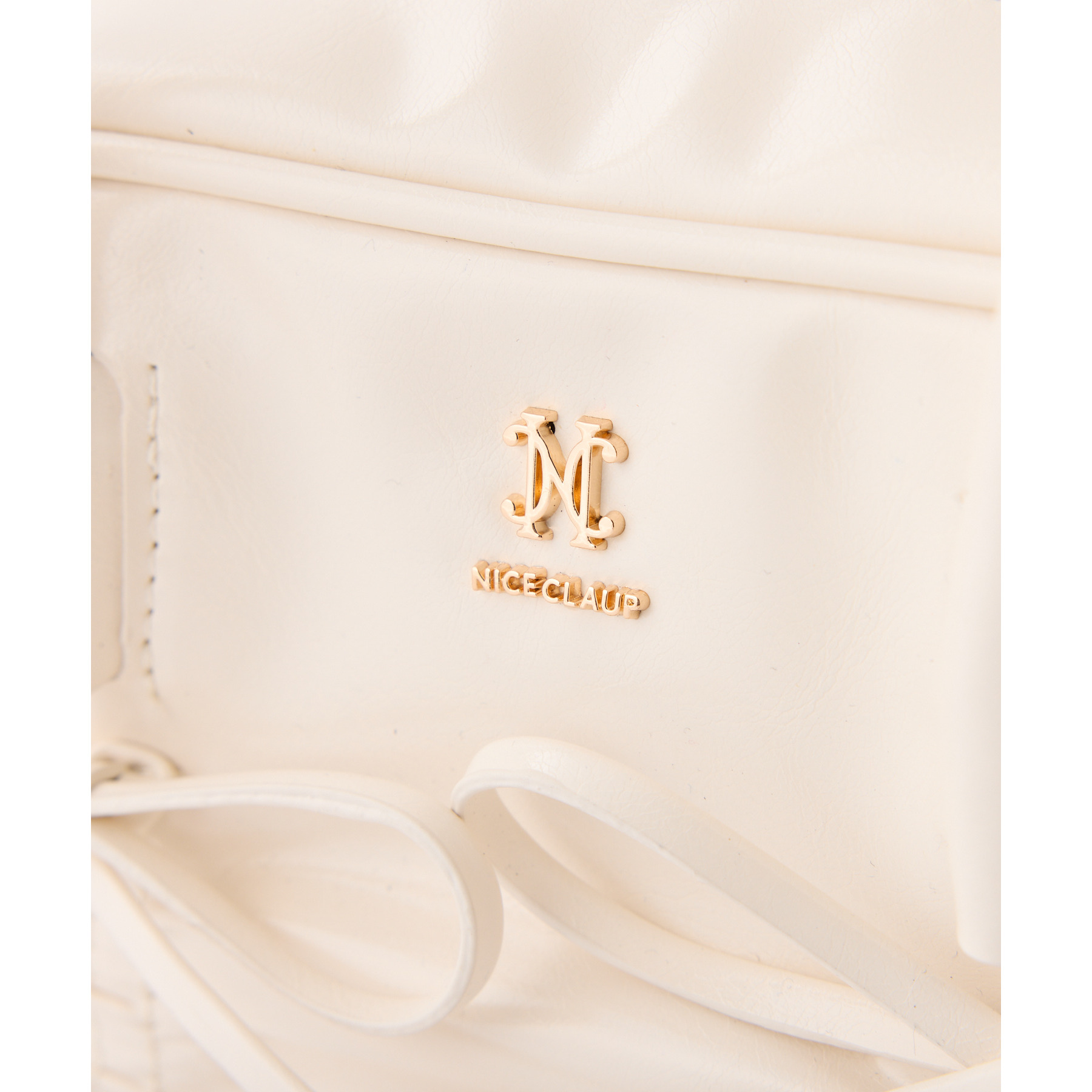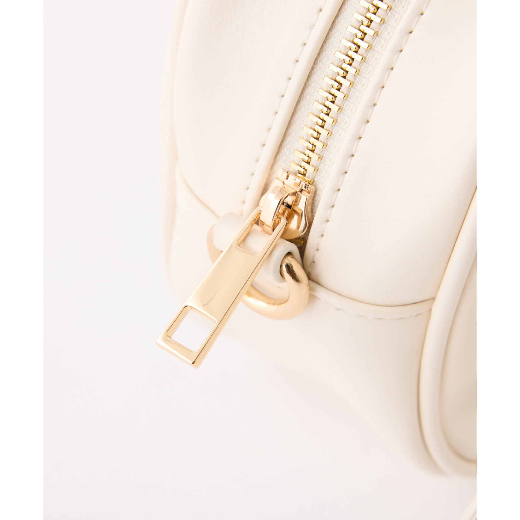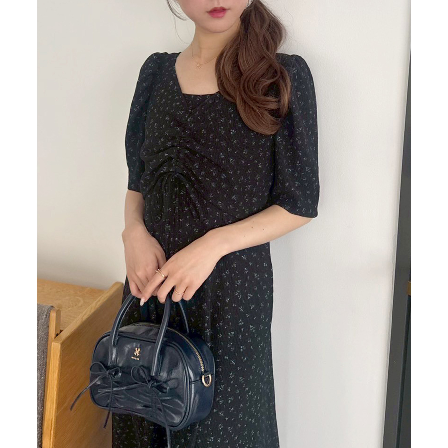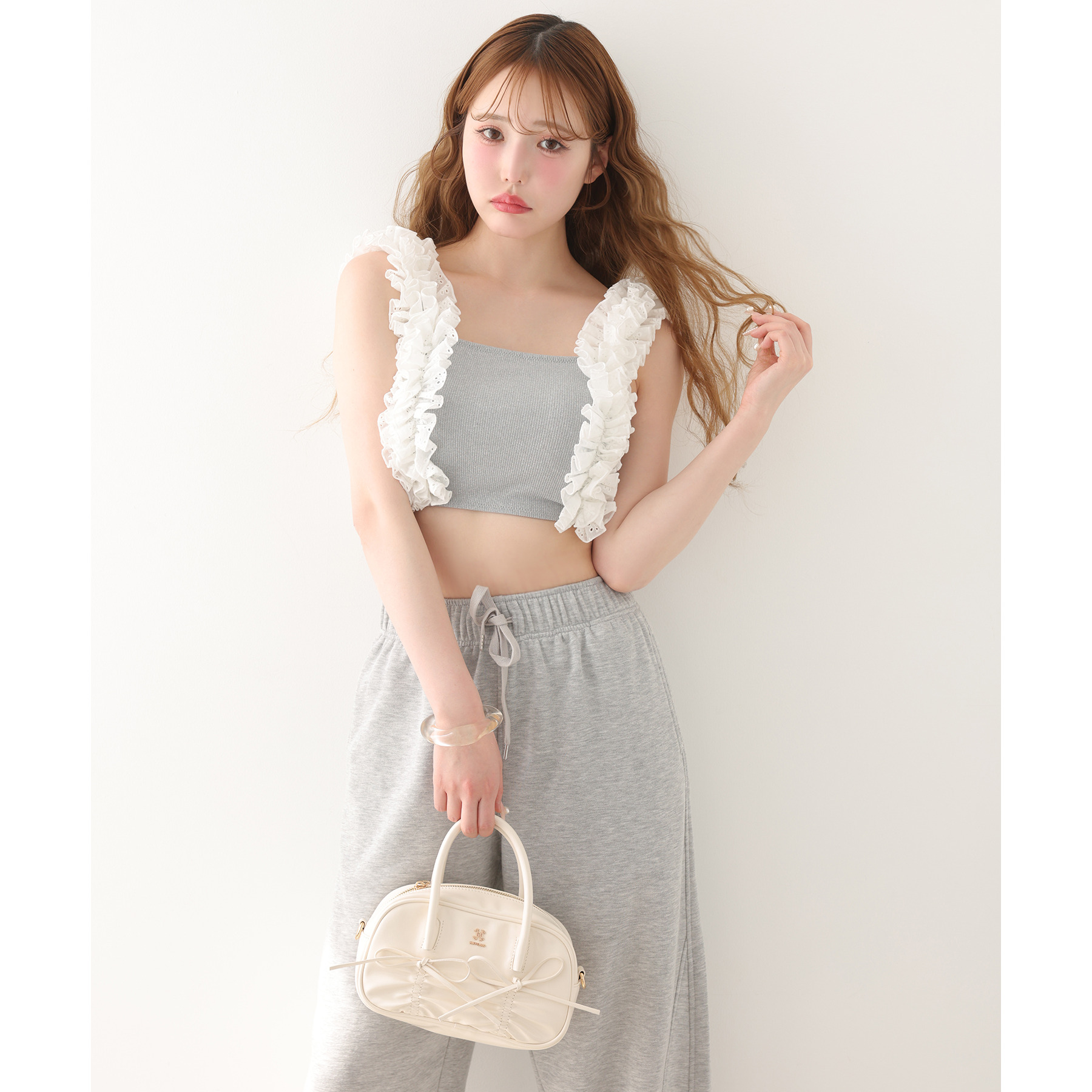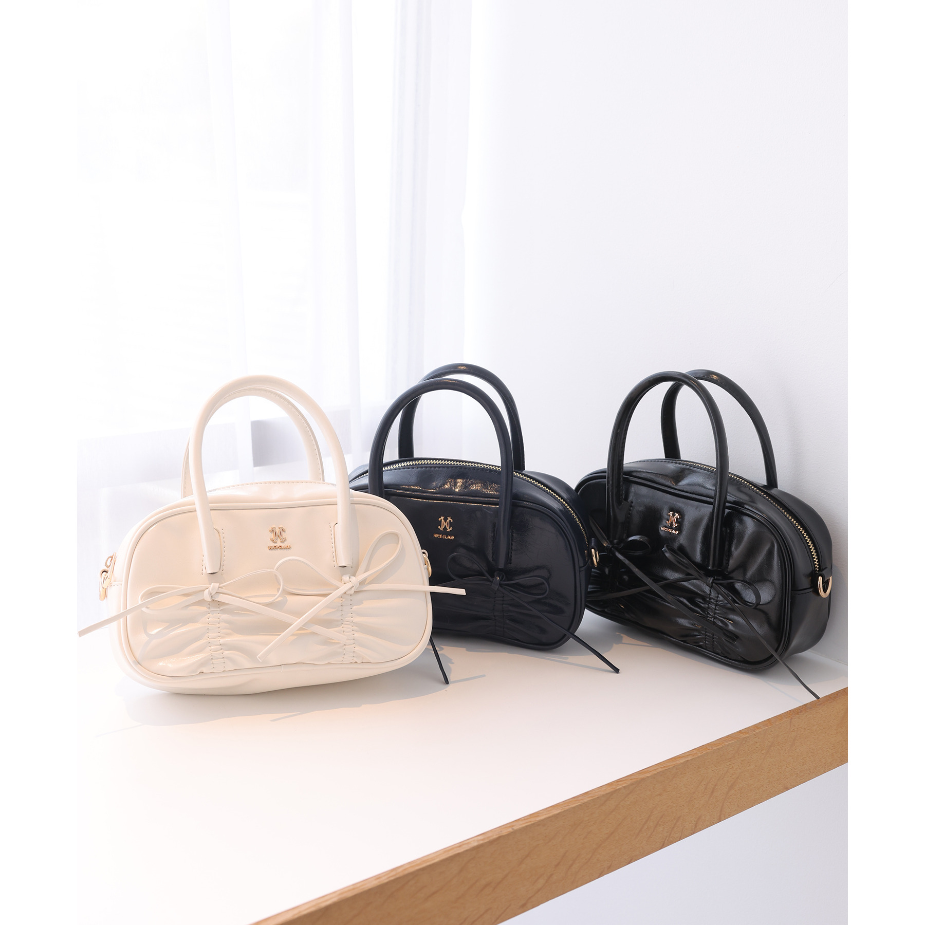 フロントにあしらわれたドロストデザインの2つのリボンが可愛さを引き立てるミニバッグ。
