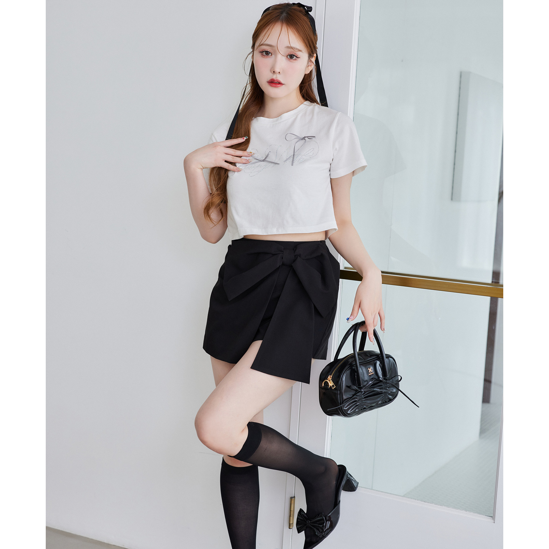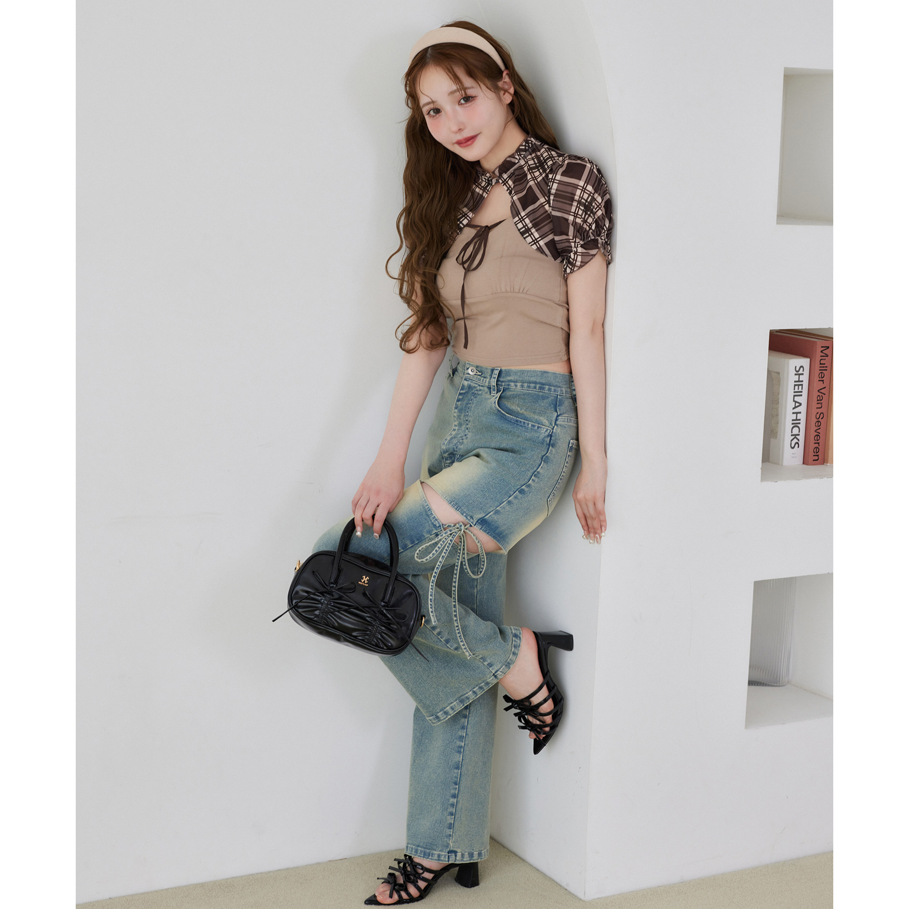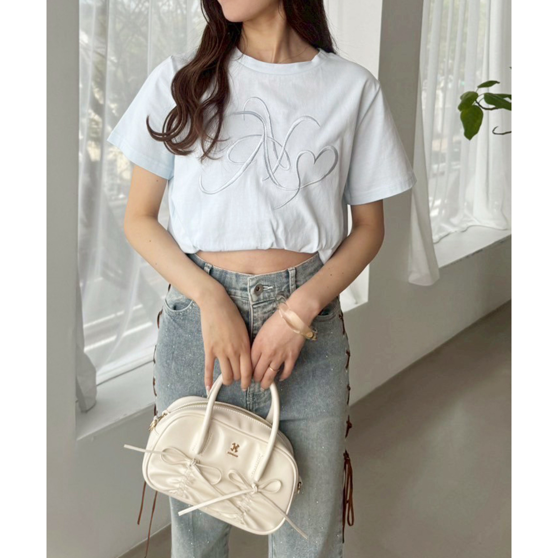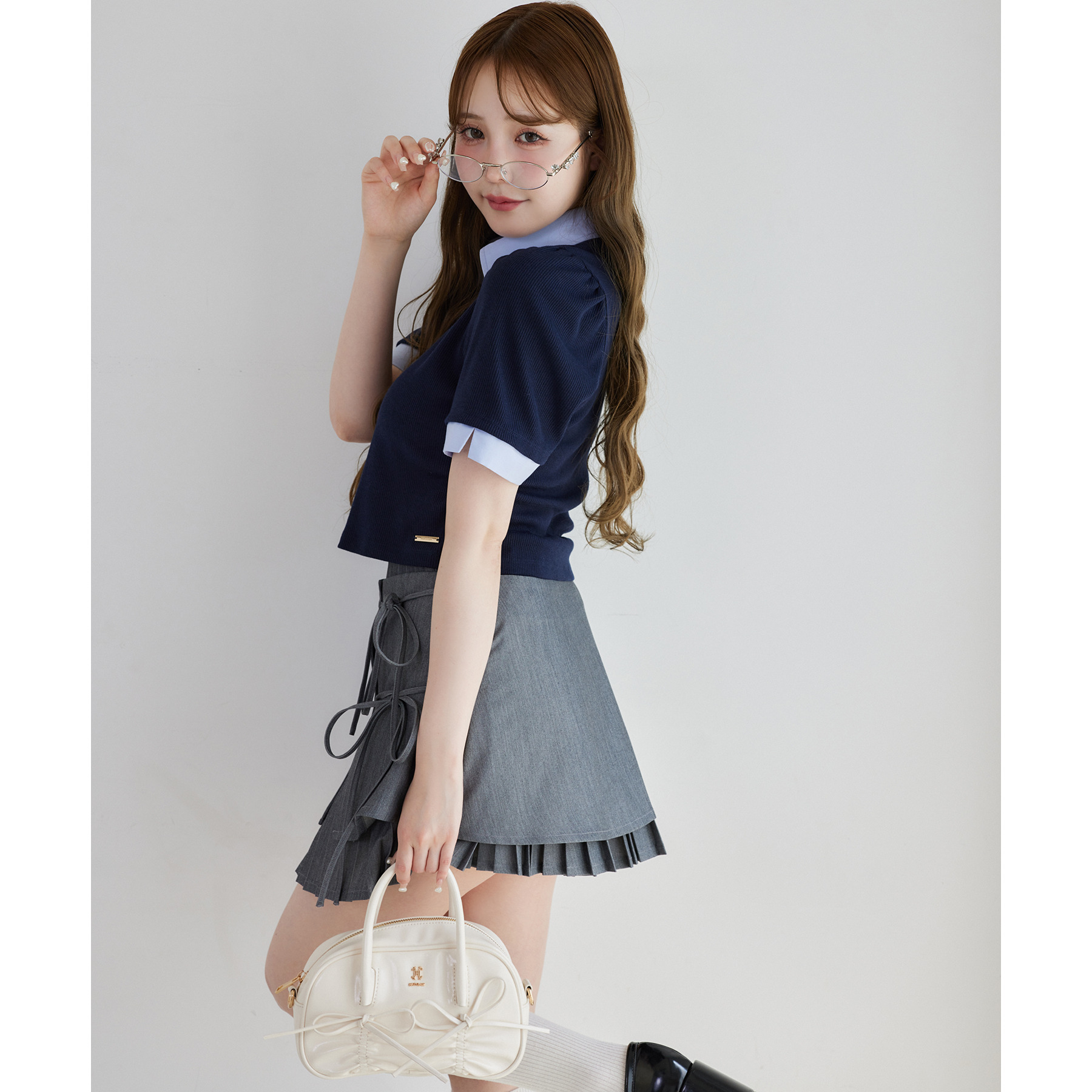フロントにあしらわれたドロストデザインの2つのリボンが可愛さを引き立てるミニバッグ。