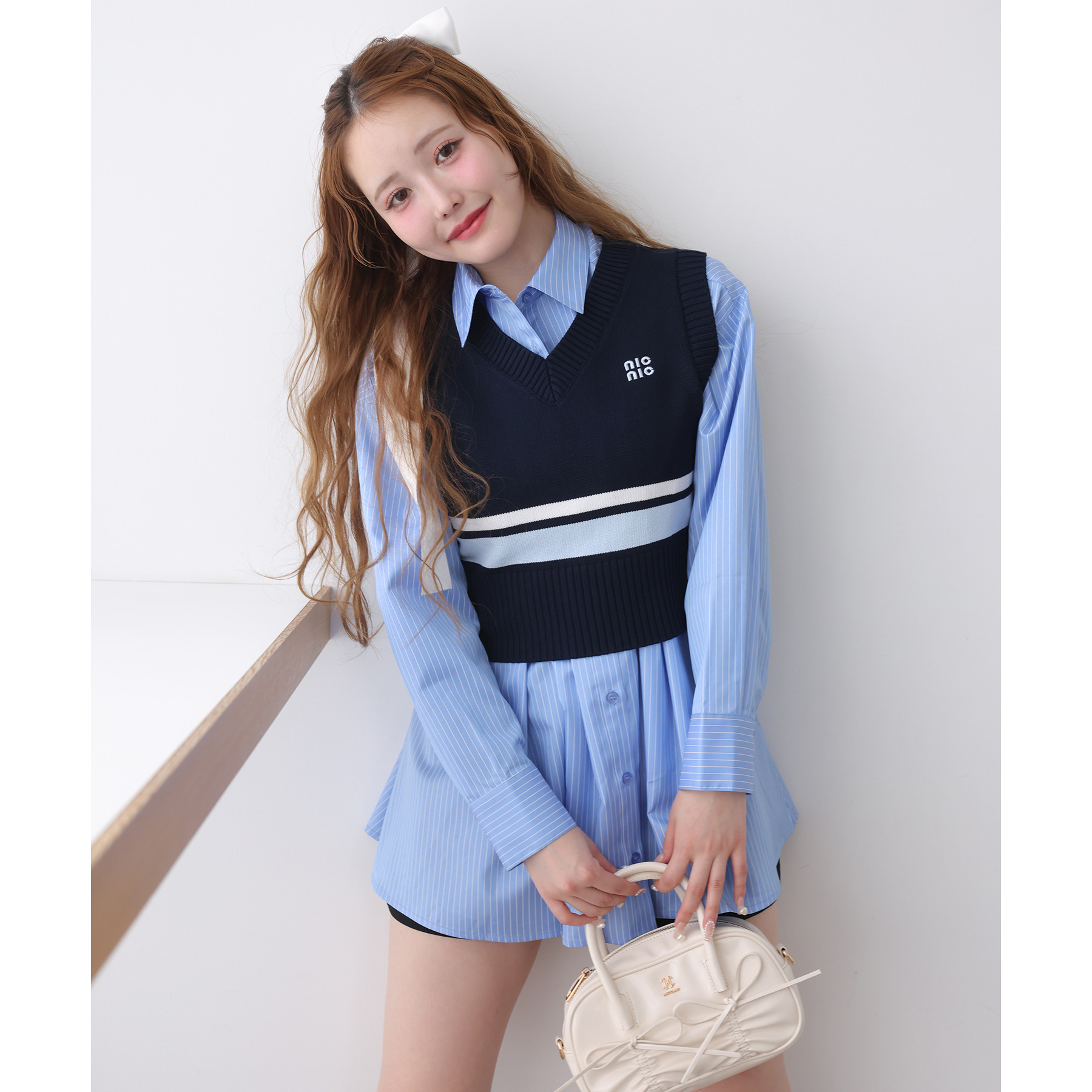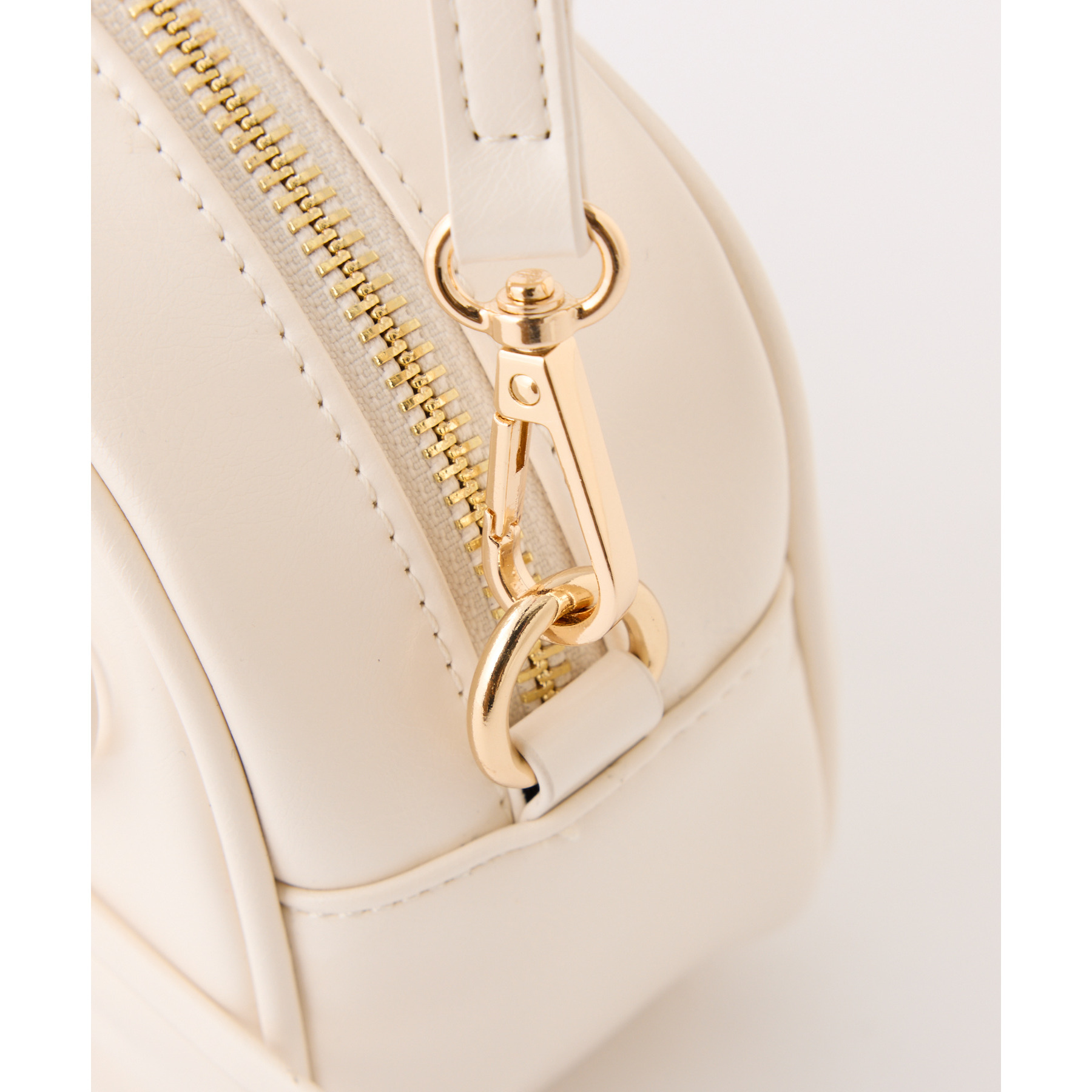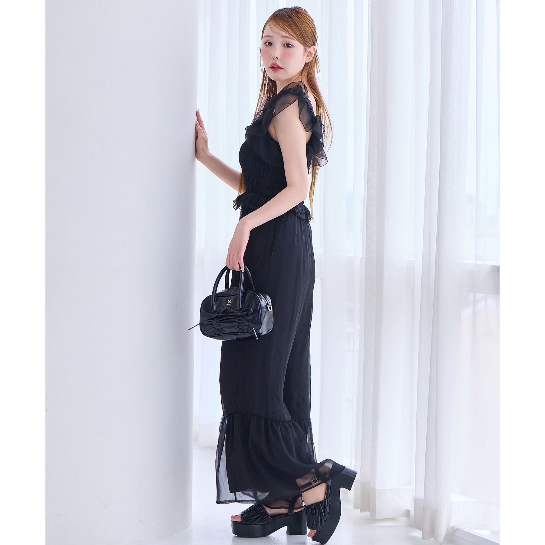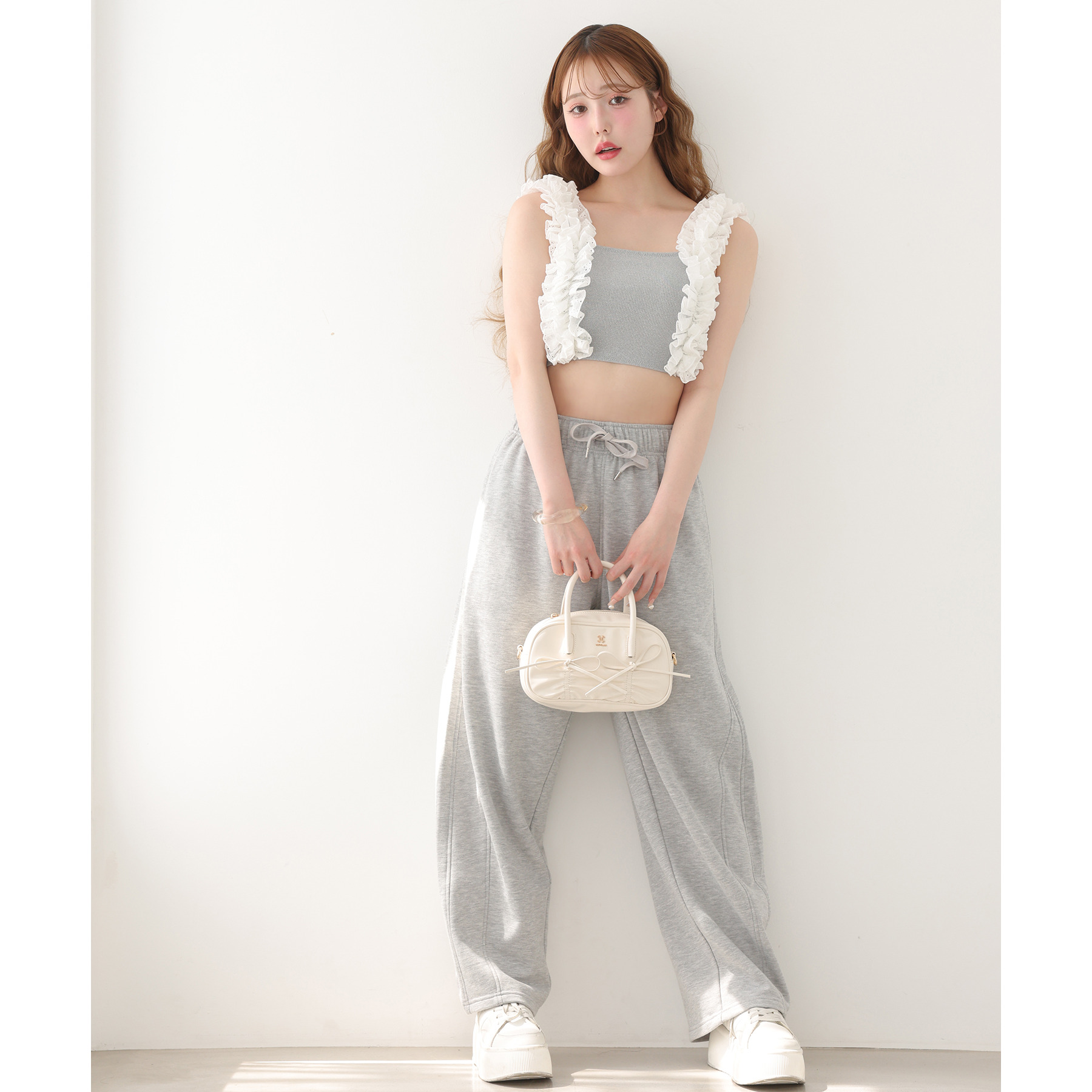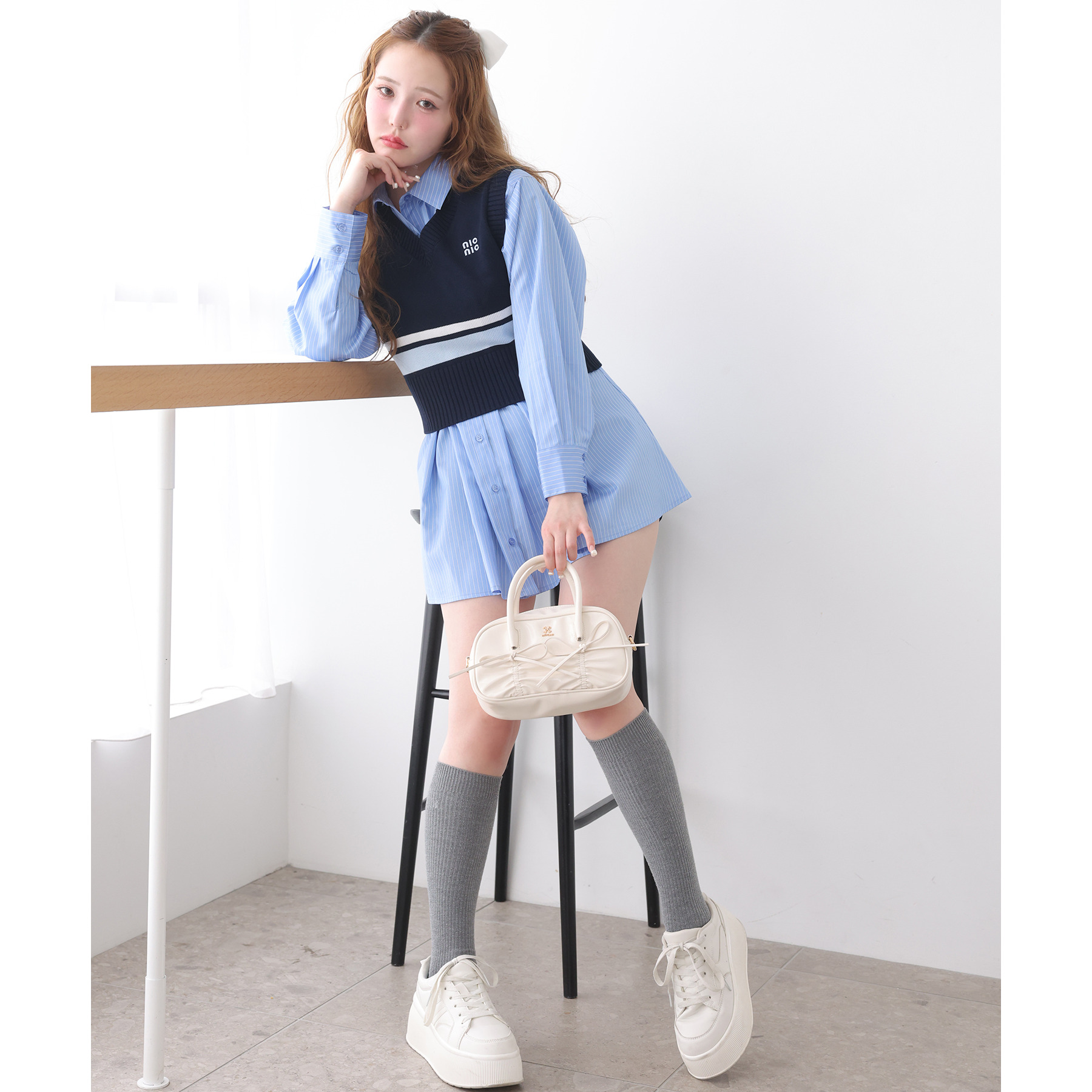 フロントにあしらわれたドロストデザインの2つのリボンが可愛さを引き立てるミニバッグ。