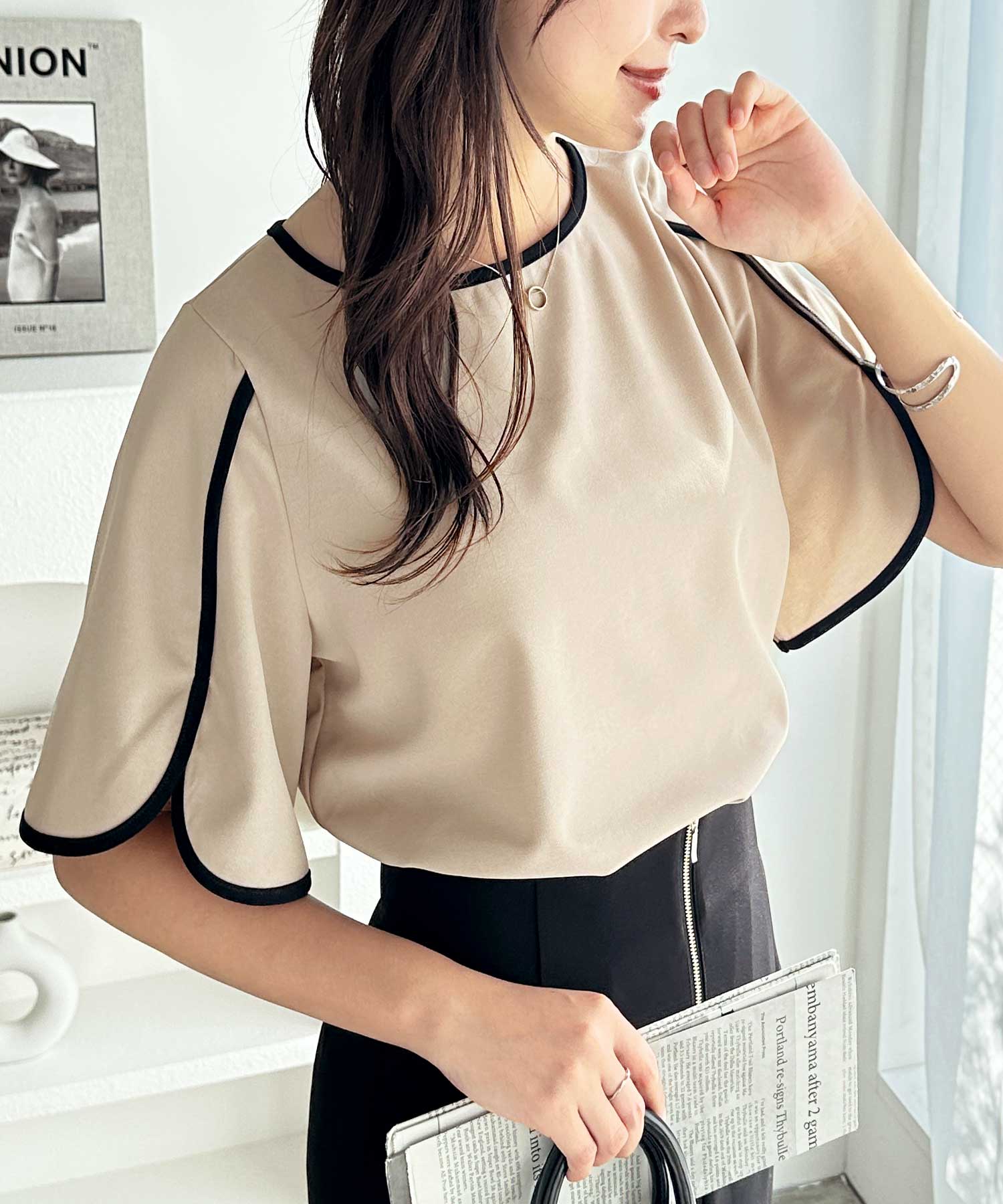 袖のスリットデザインが目を惹くTブラウス。