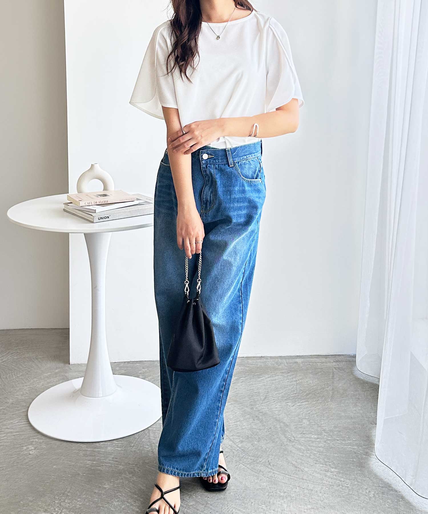 トレンドのカーブデニムやシンプルなデニムと合わせてカジュアルダウンをしても◎