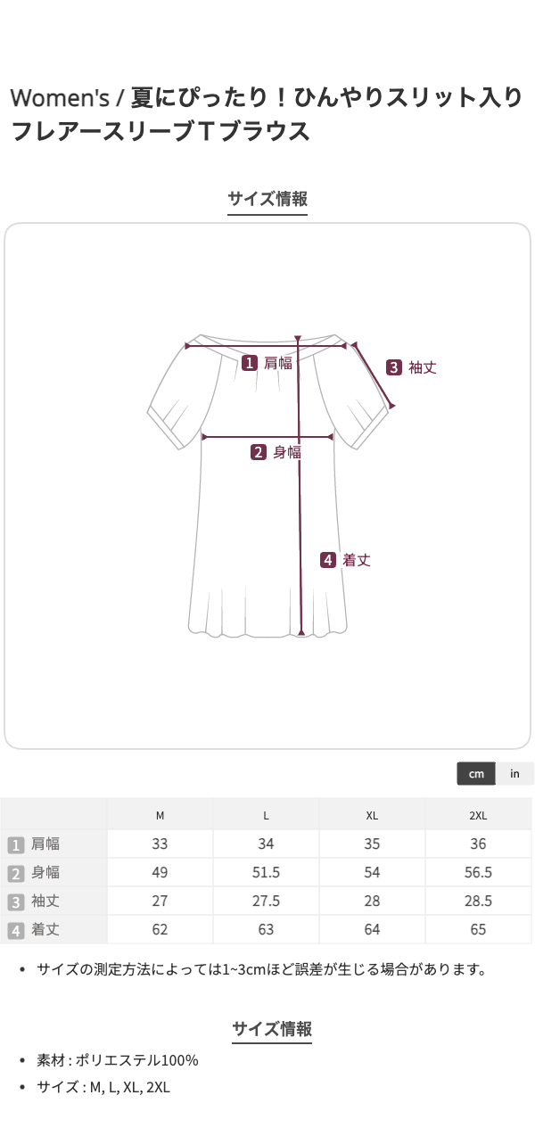 M:バスト98、肩幅33、前身丈62、袖丈27