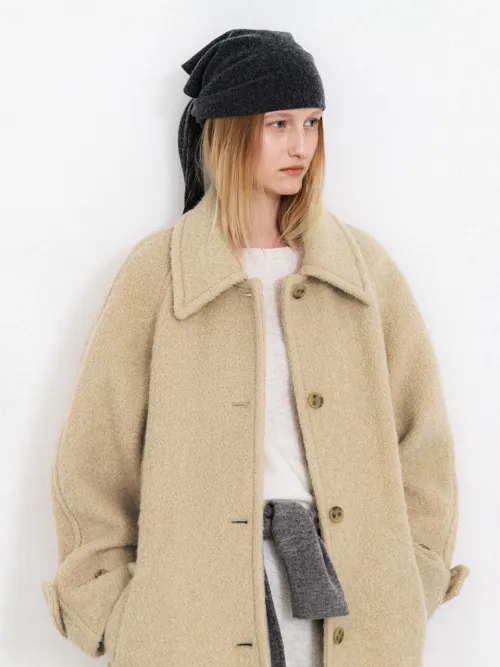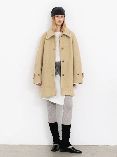柔らかく暖かいウール混紡素材で、ブークレの表面感が際立つコートです。