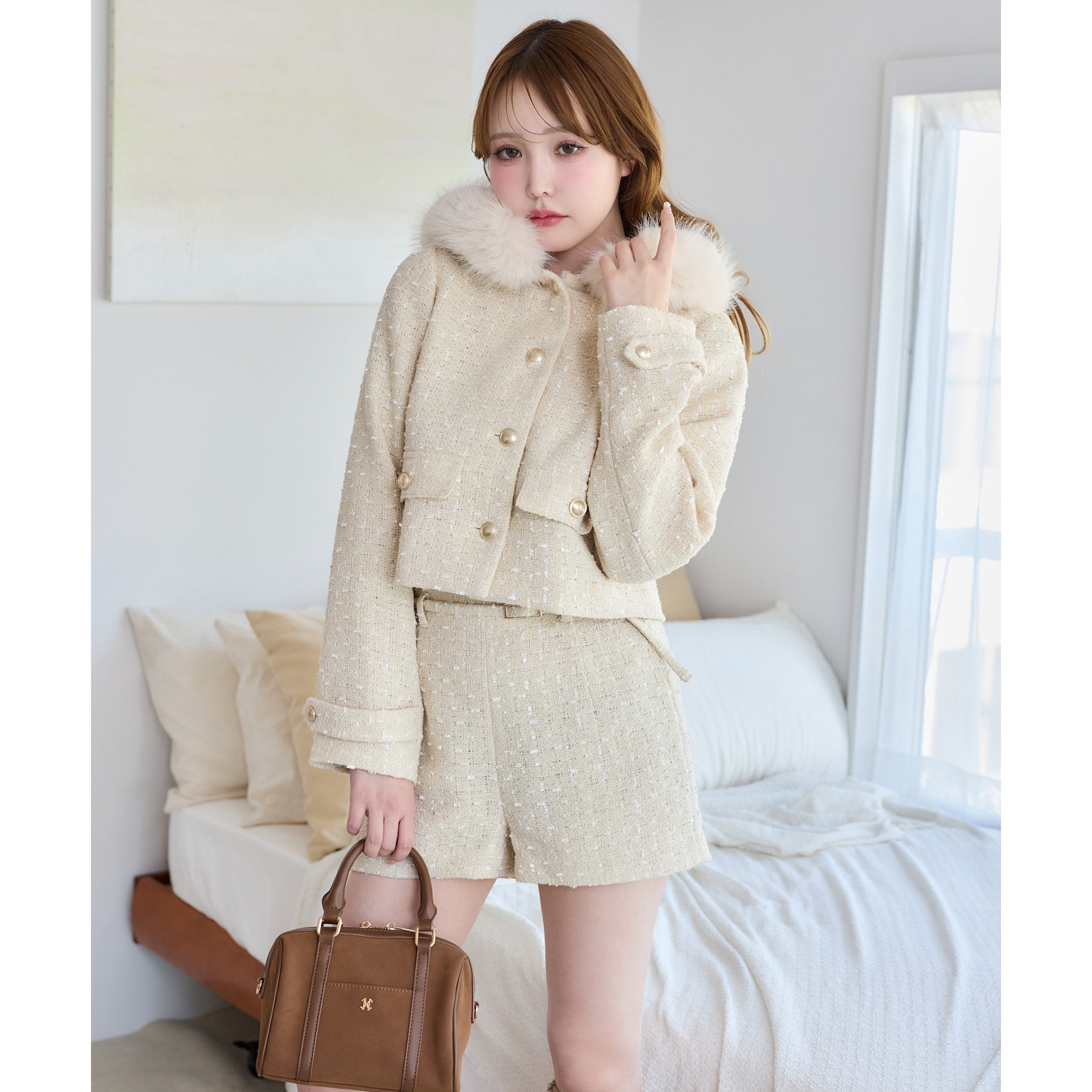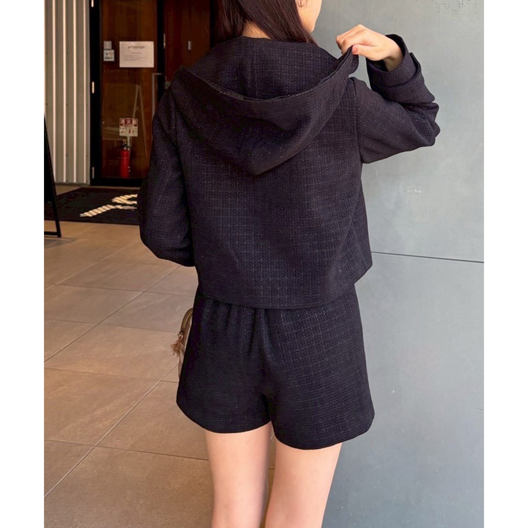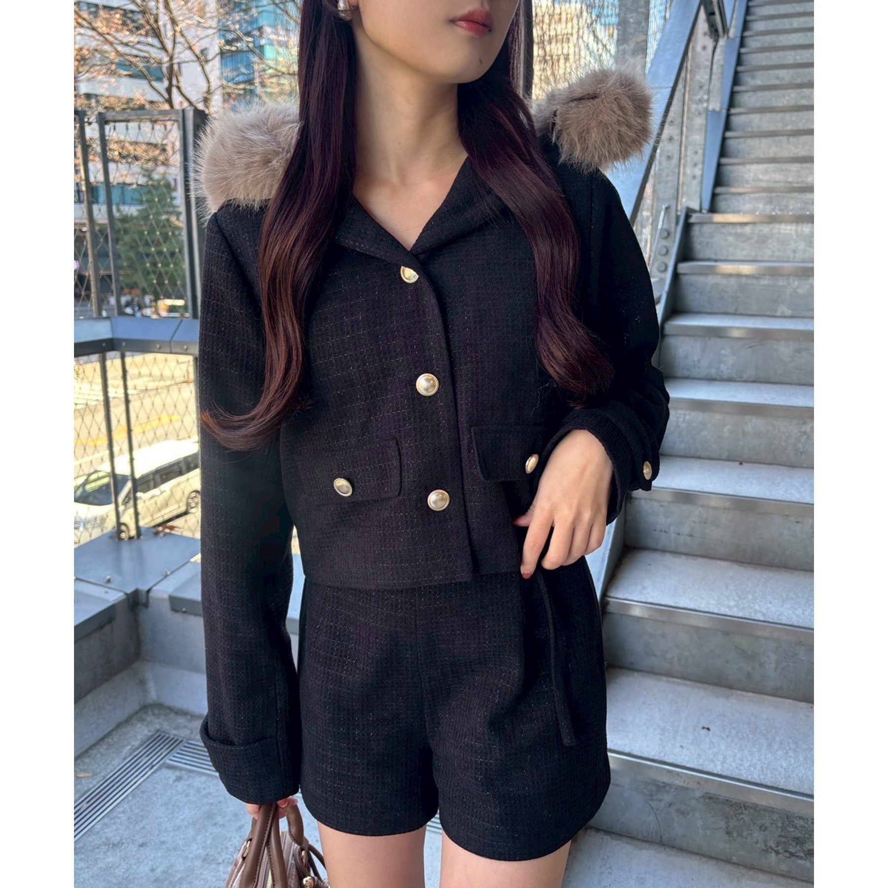 フェイクファーフード付きツイードジャケット【セットアップ可能】