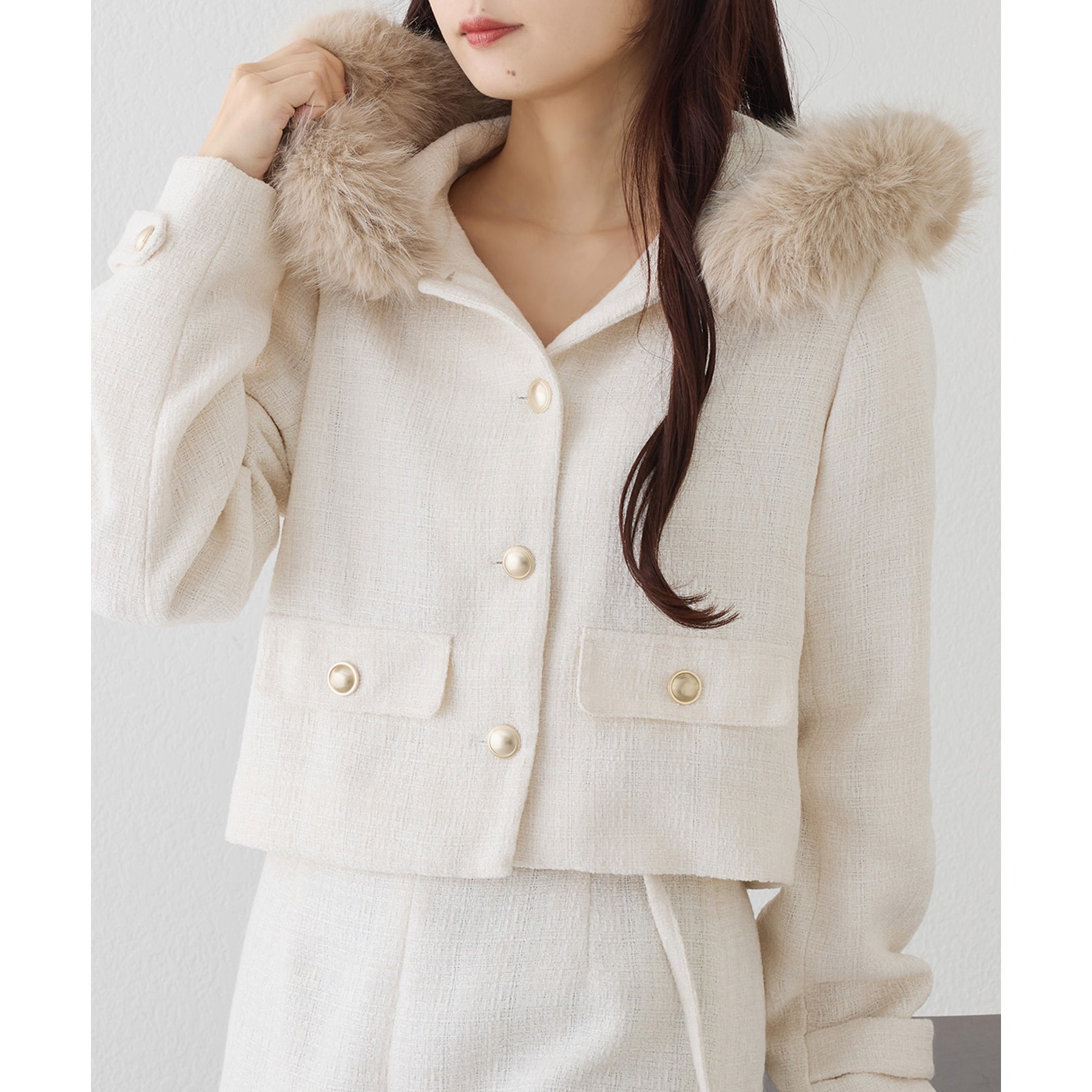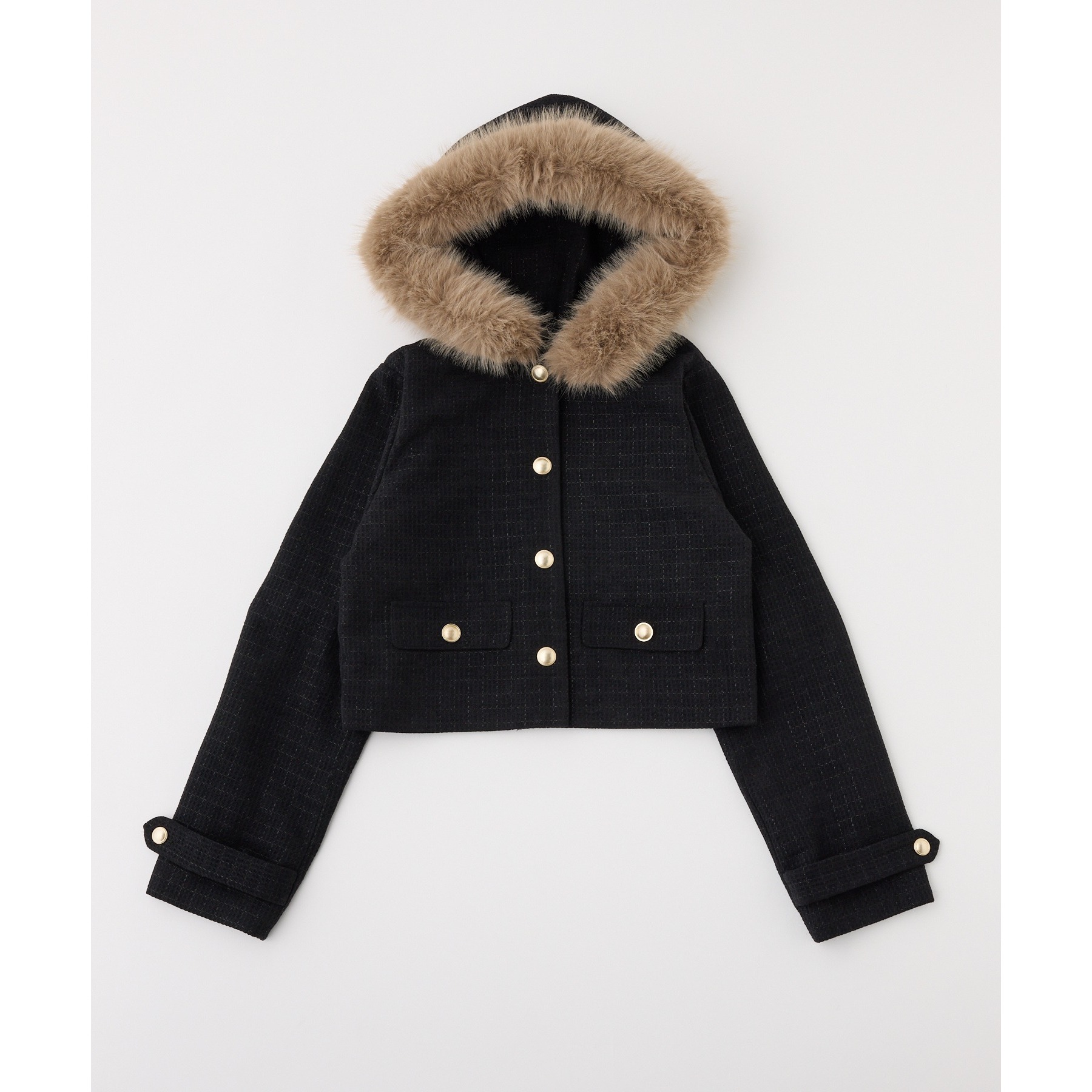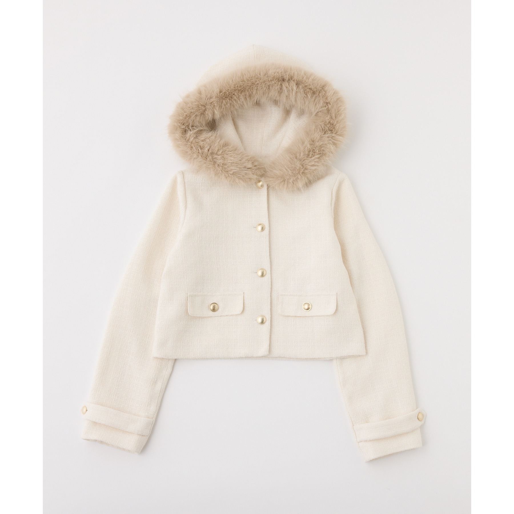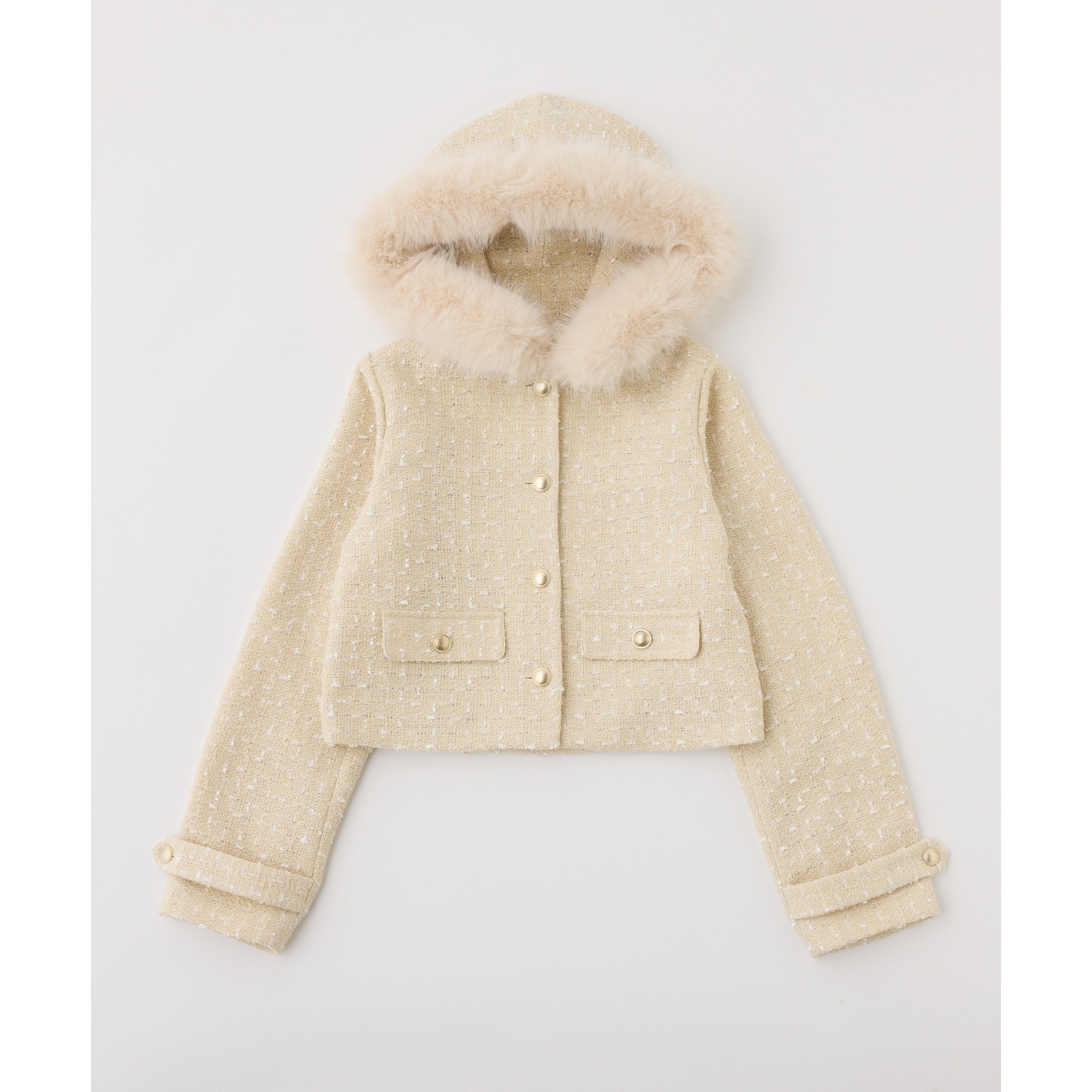 上品なツイード素材に、カジュアルなフードとふわふわファーを組み合わせた主役級アウター。