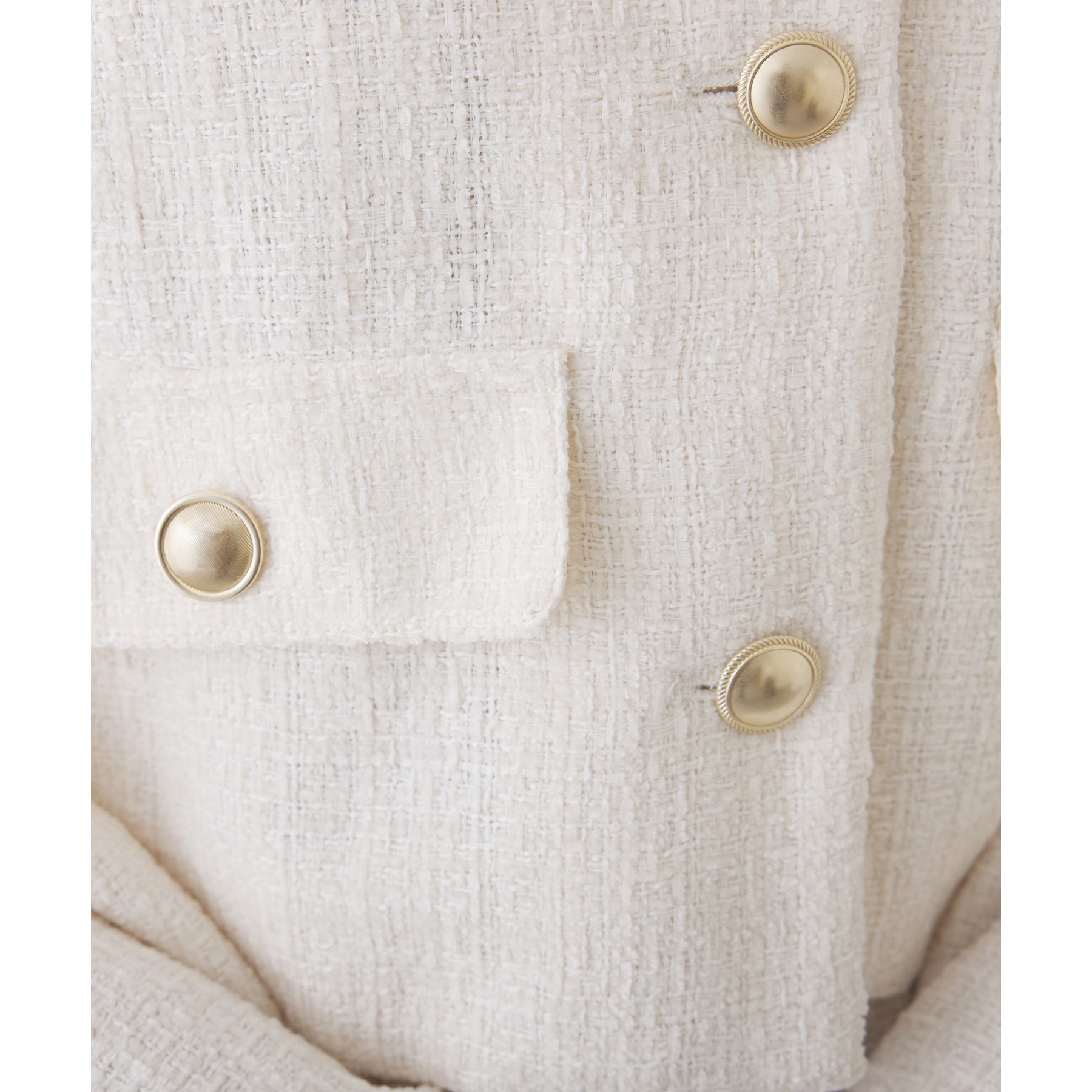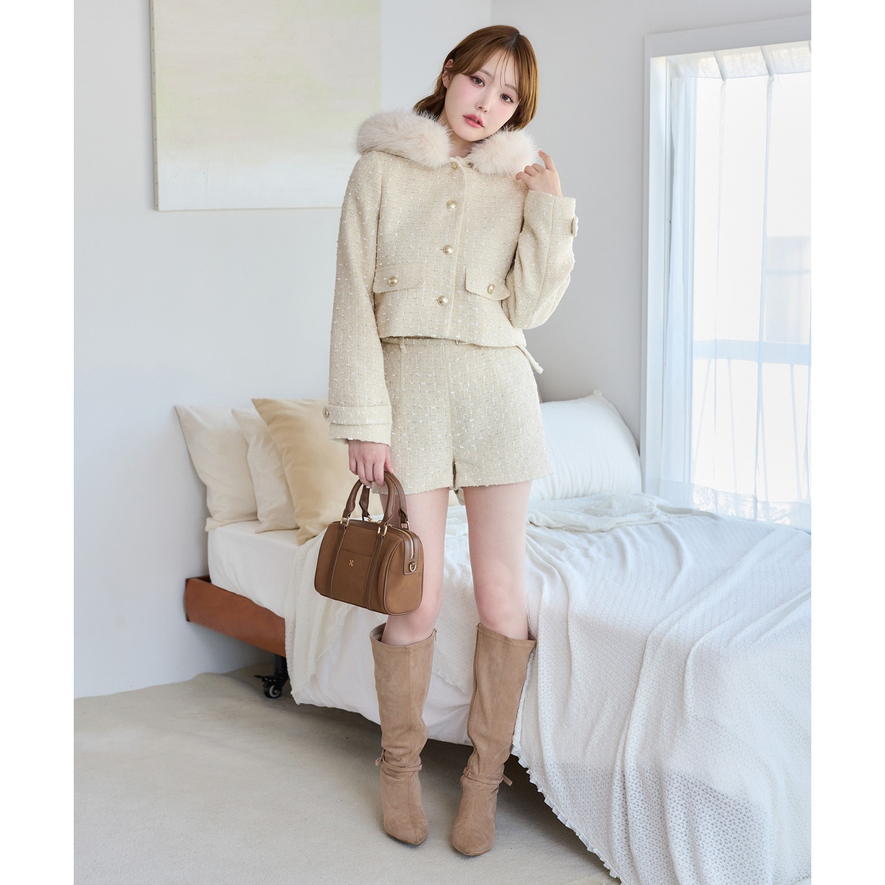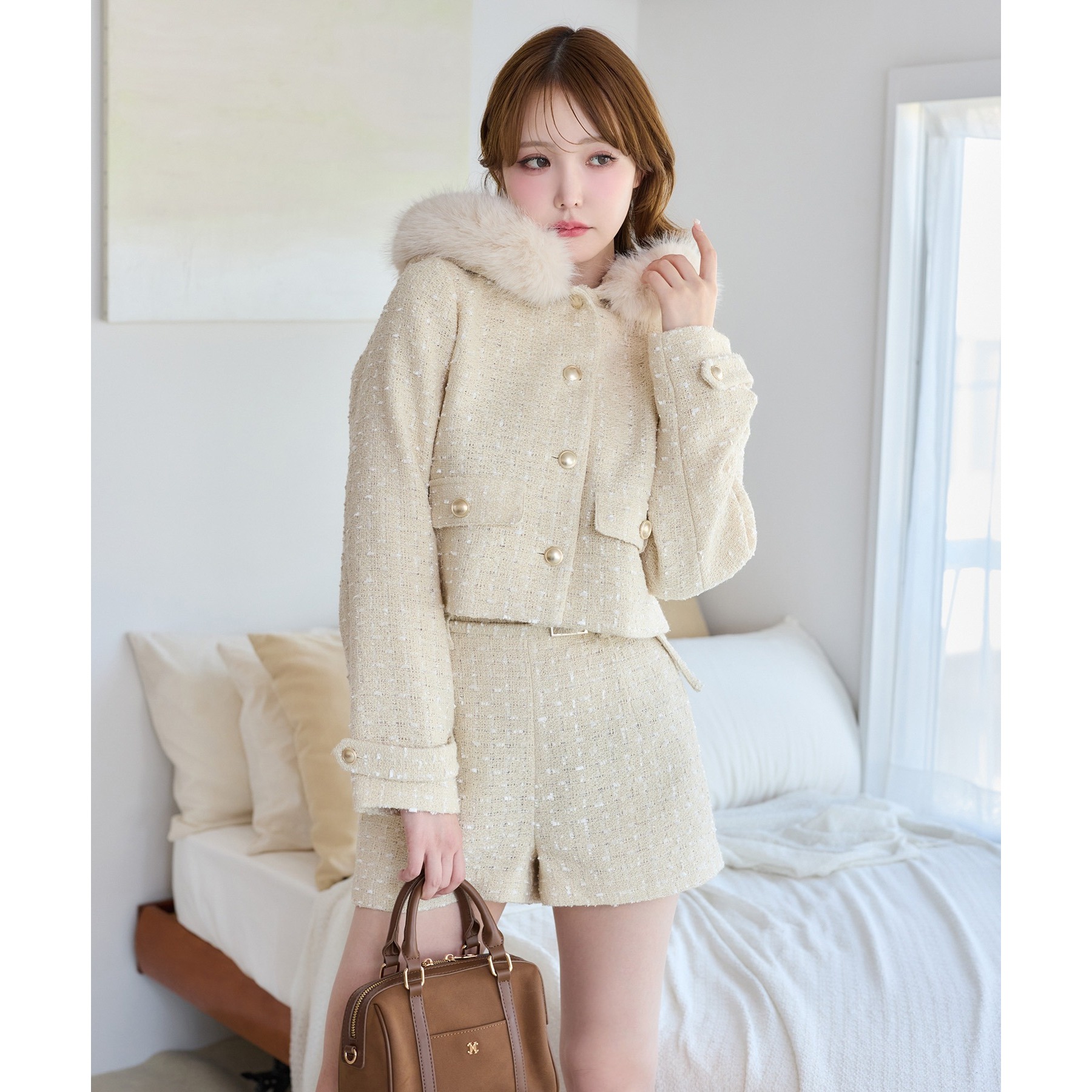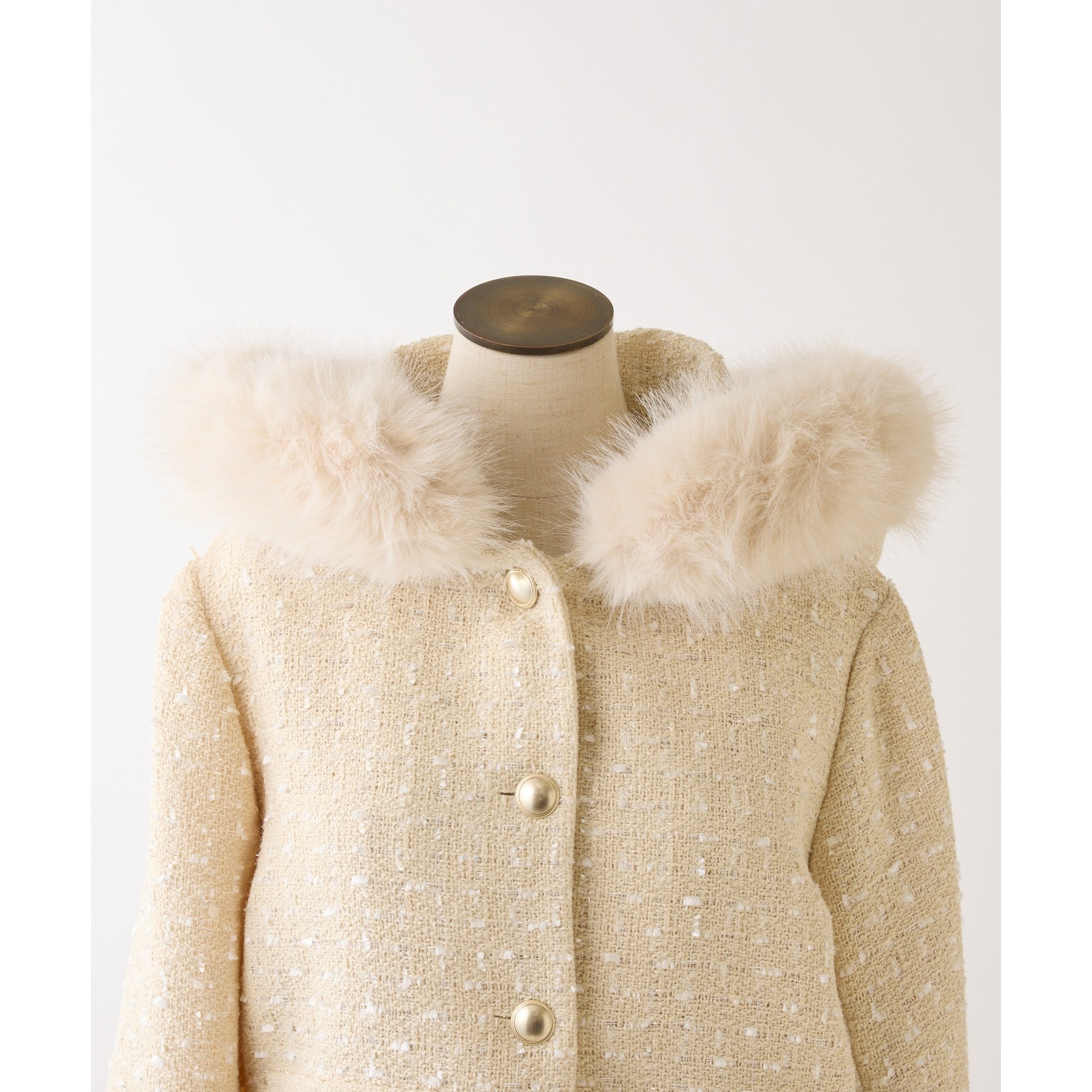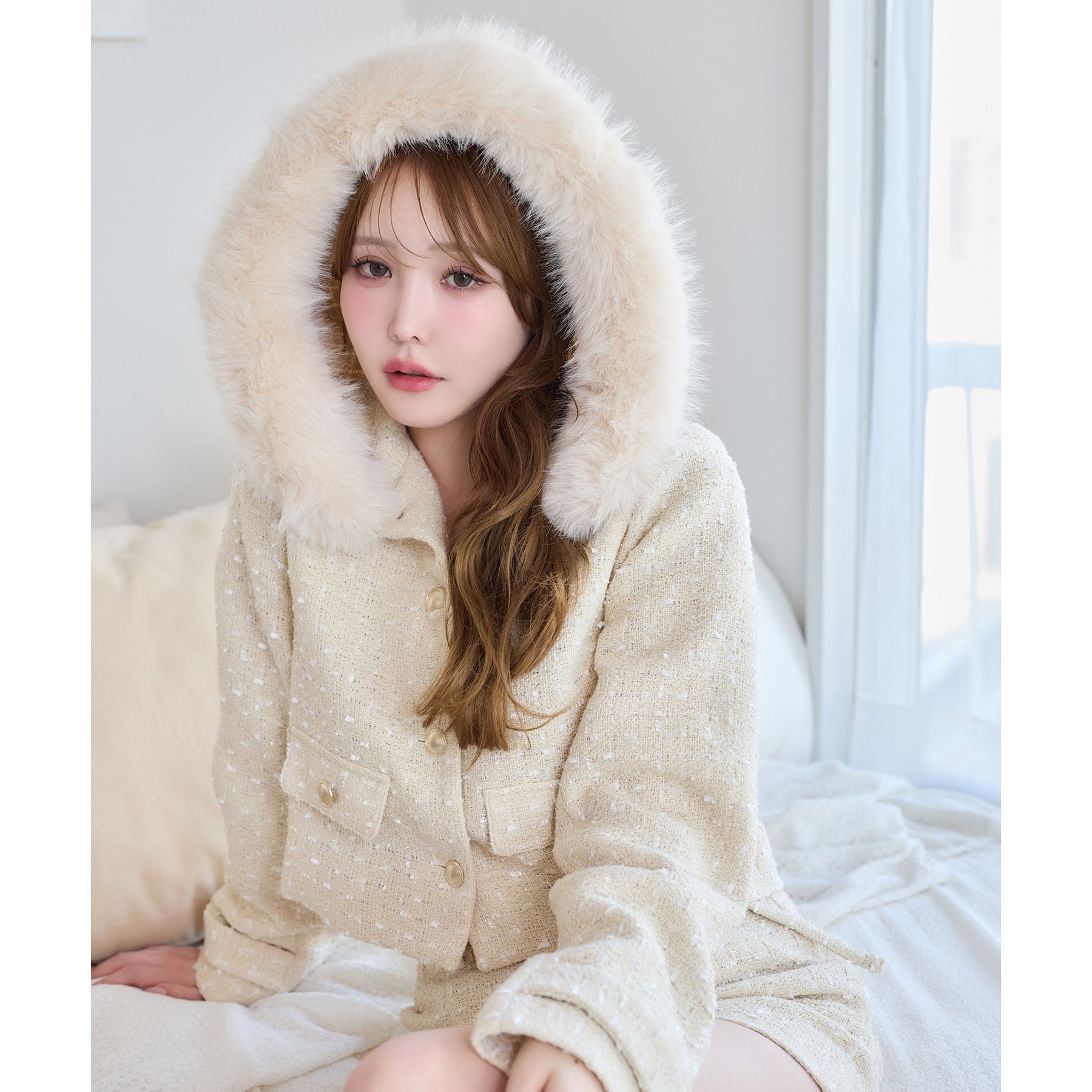 上品なツイード素材に、カジュアルなフードとふわふわファーを組み合わせた主役級アウター。