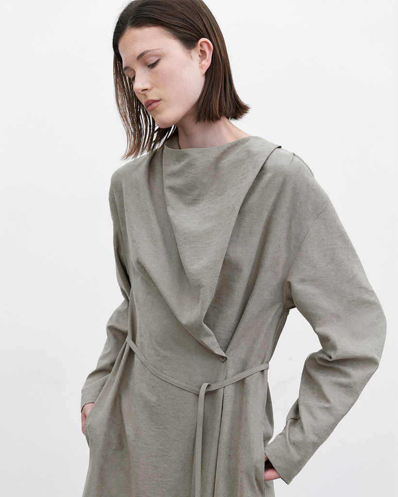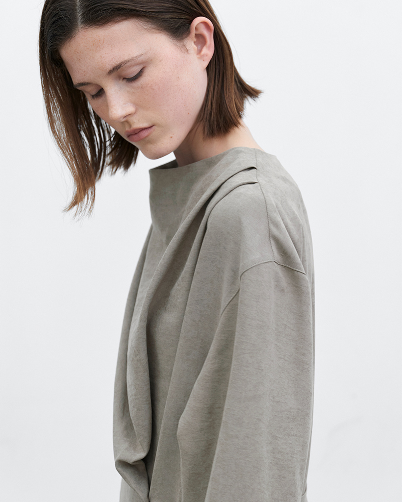 斜めに施されたタックディテールがユニークなシルエットを作り、