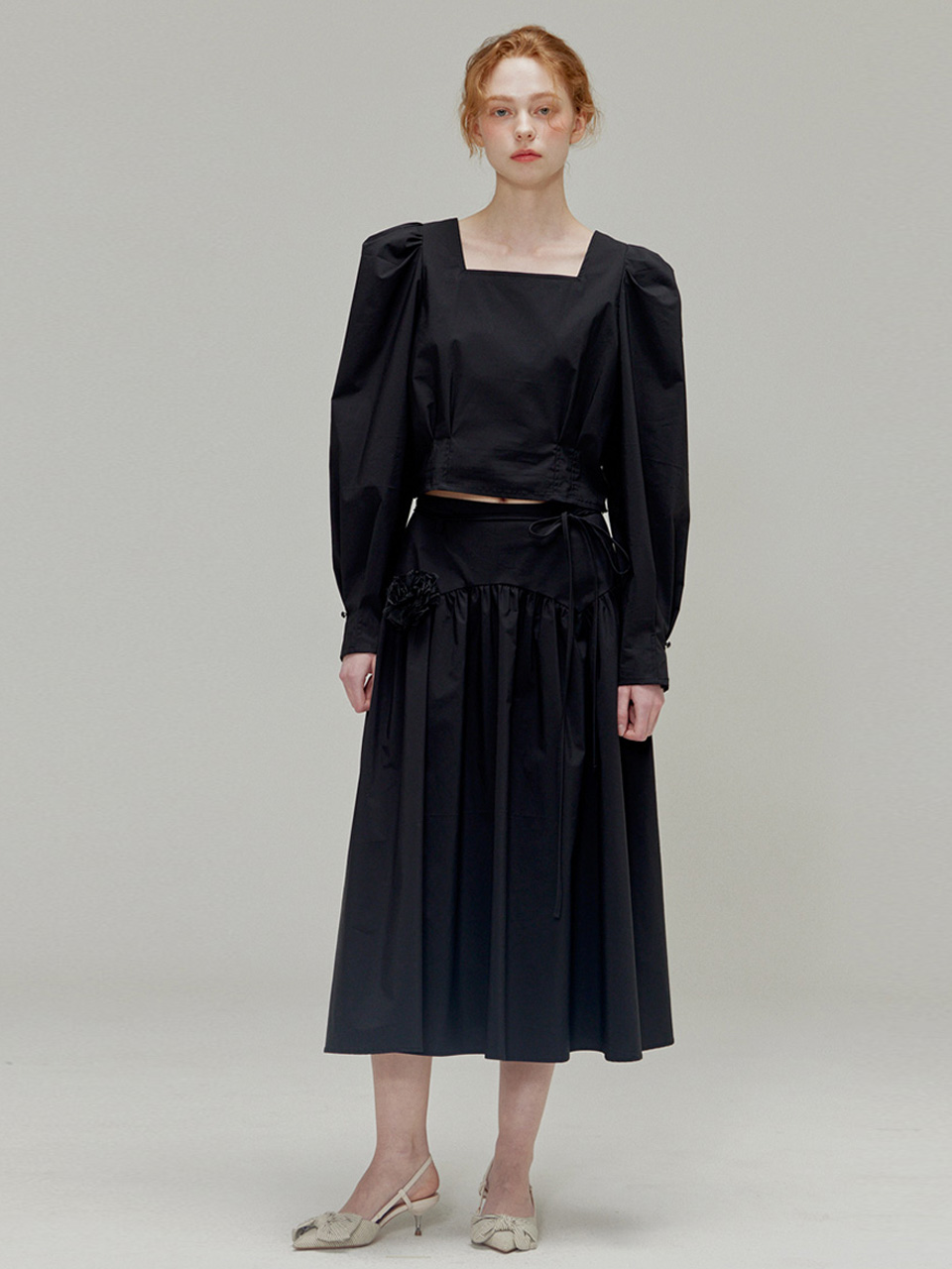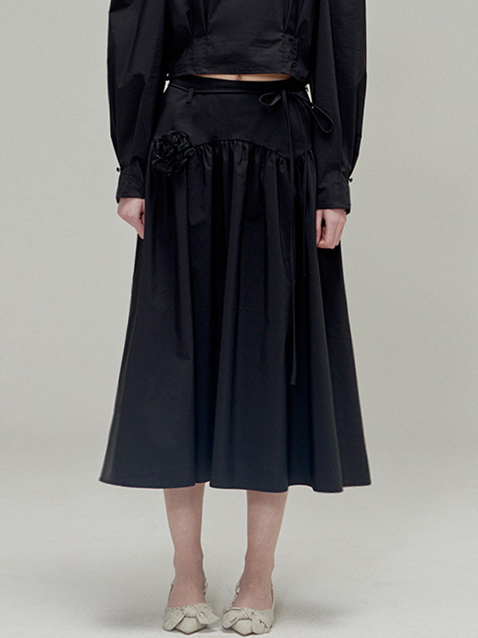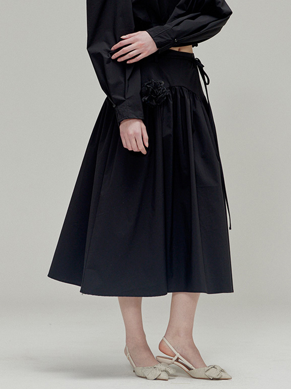 Rose brooch ribbon shirring skirt_Black
