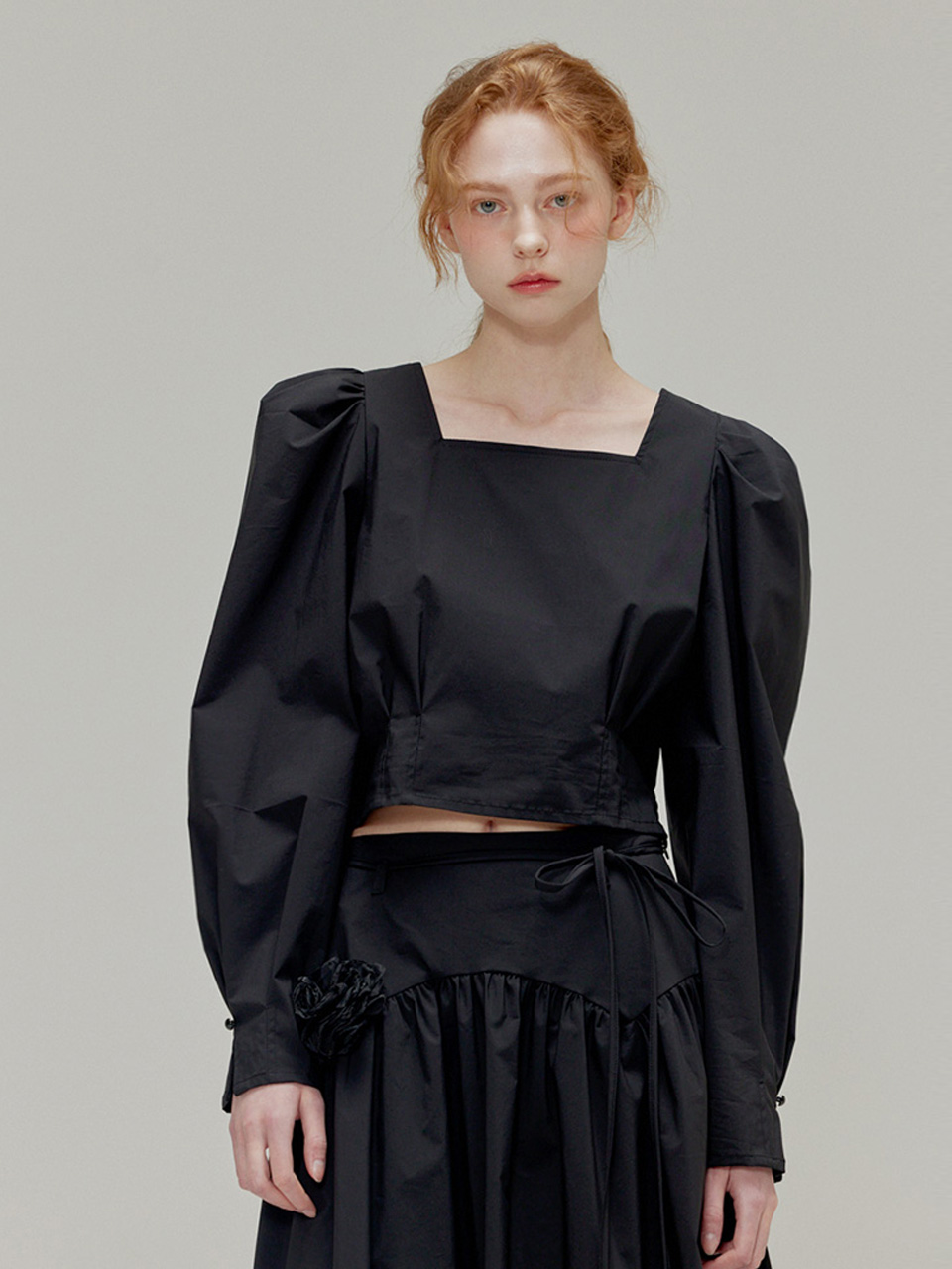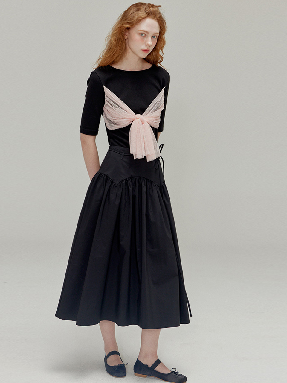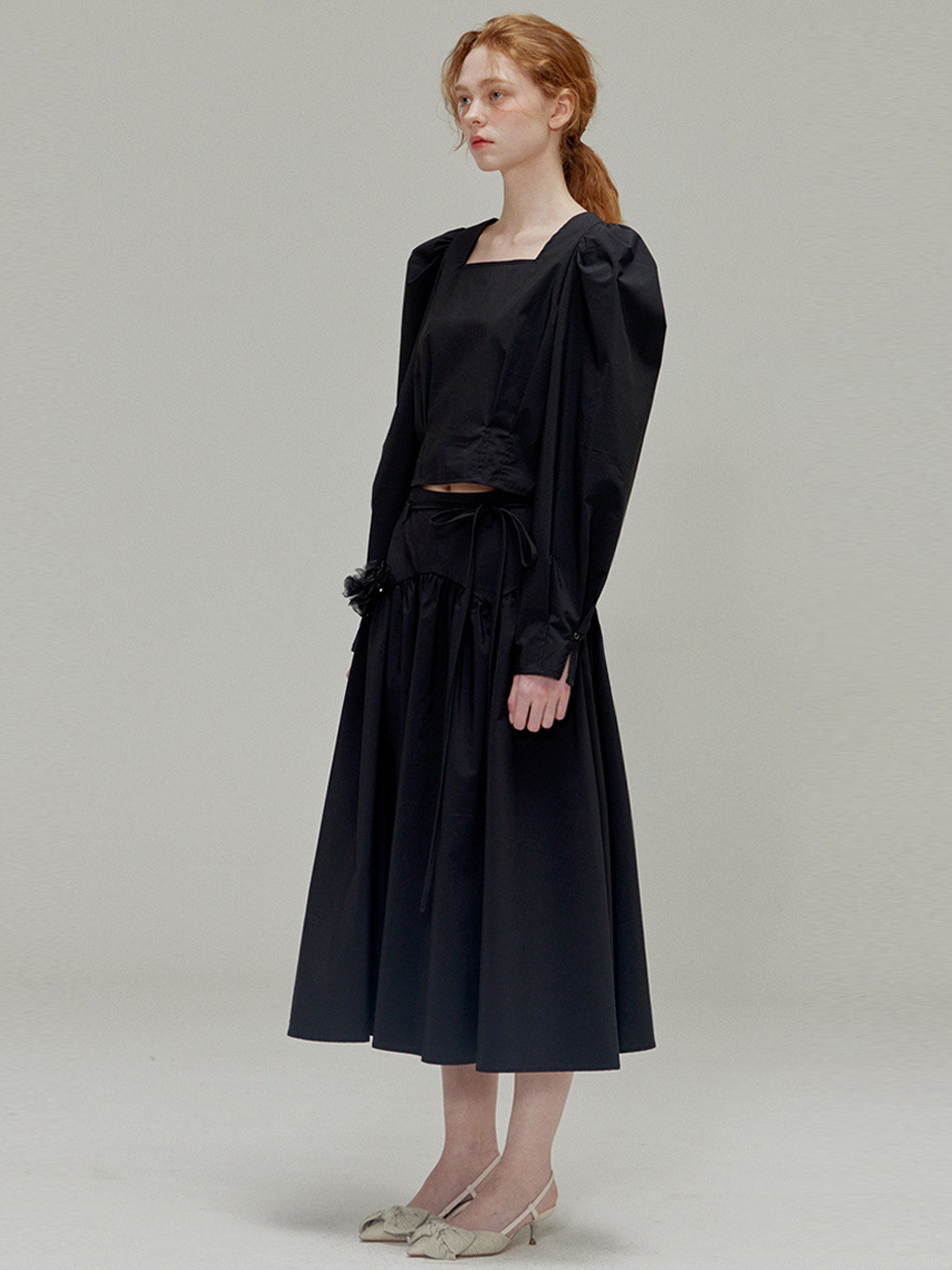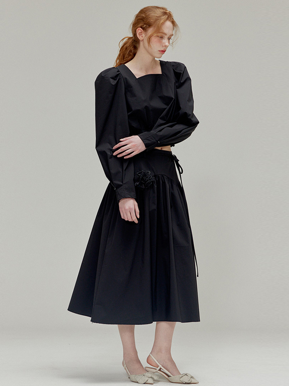 Rose brooch ribbon shirring skirt_Black