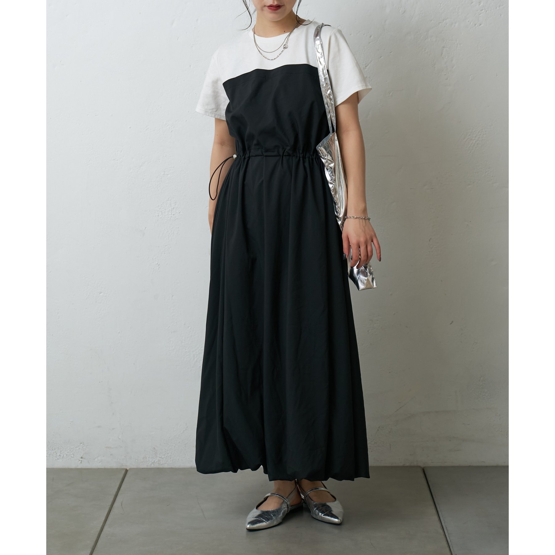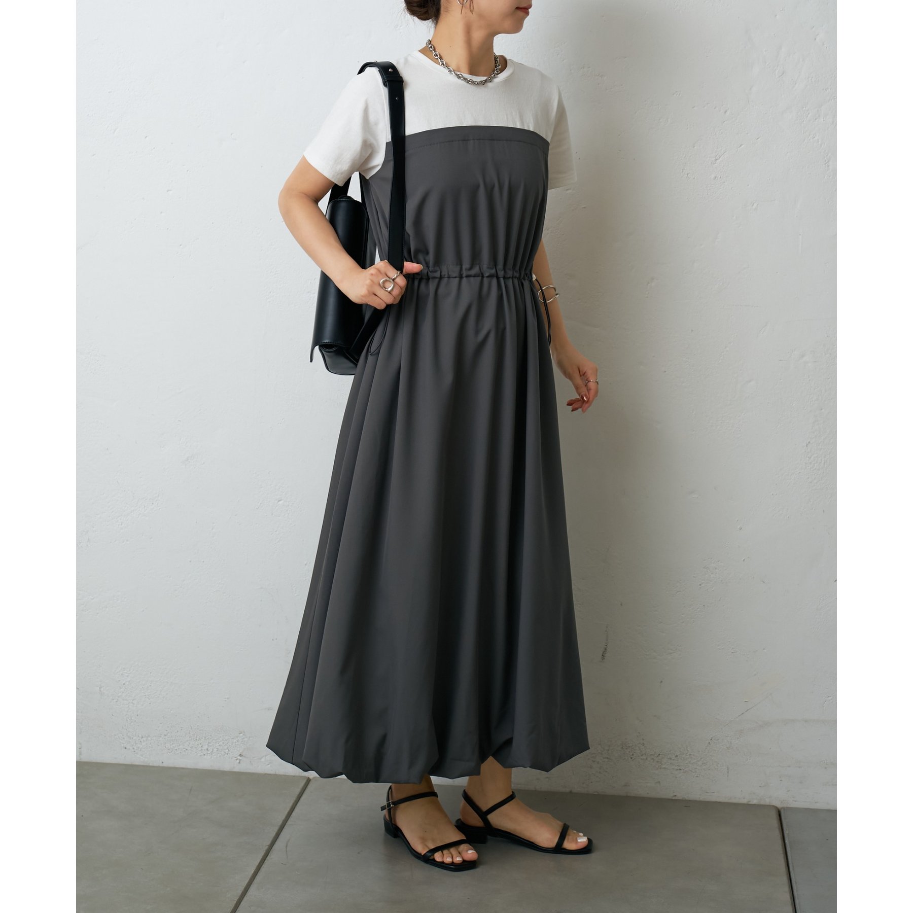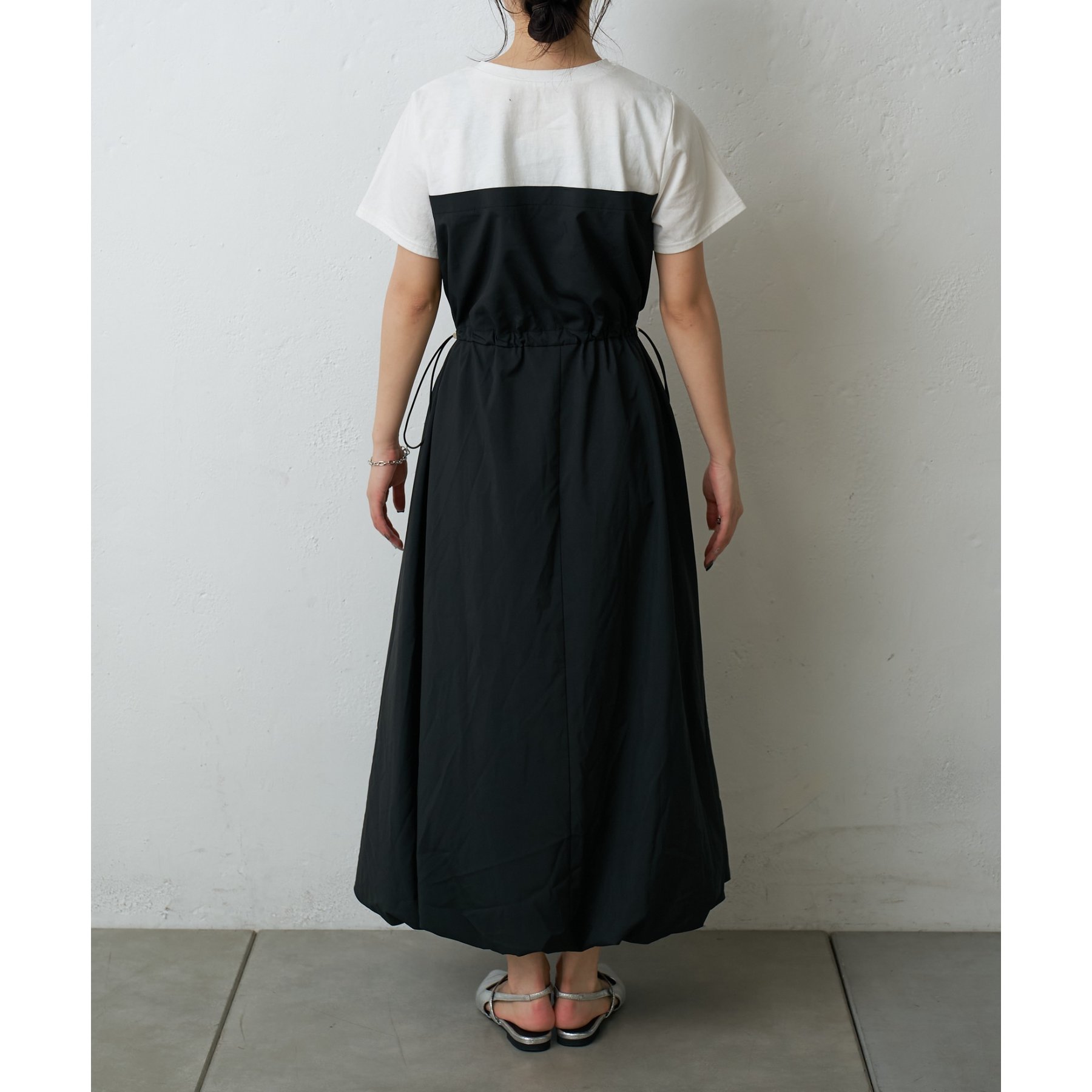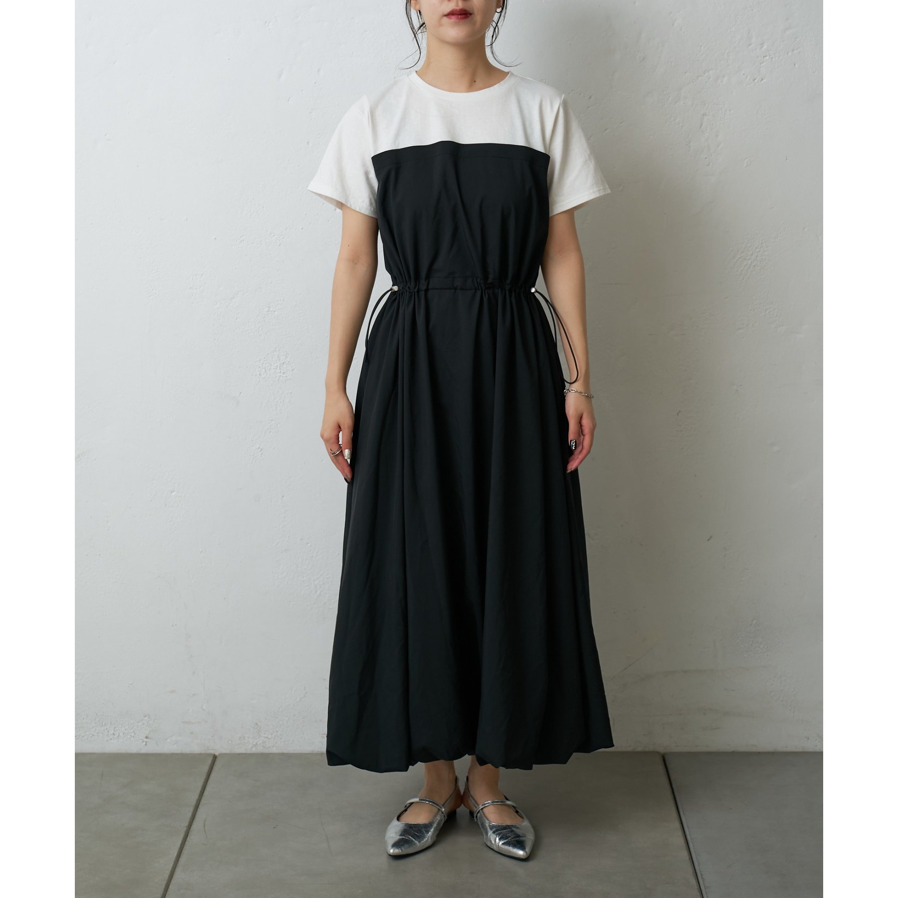 カジュアルなトップス部分と、ふんわりと広がるバルーンシルエットのスカート部分とのコントラストが、シンプルながらもデザイン性の高い一枚です。