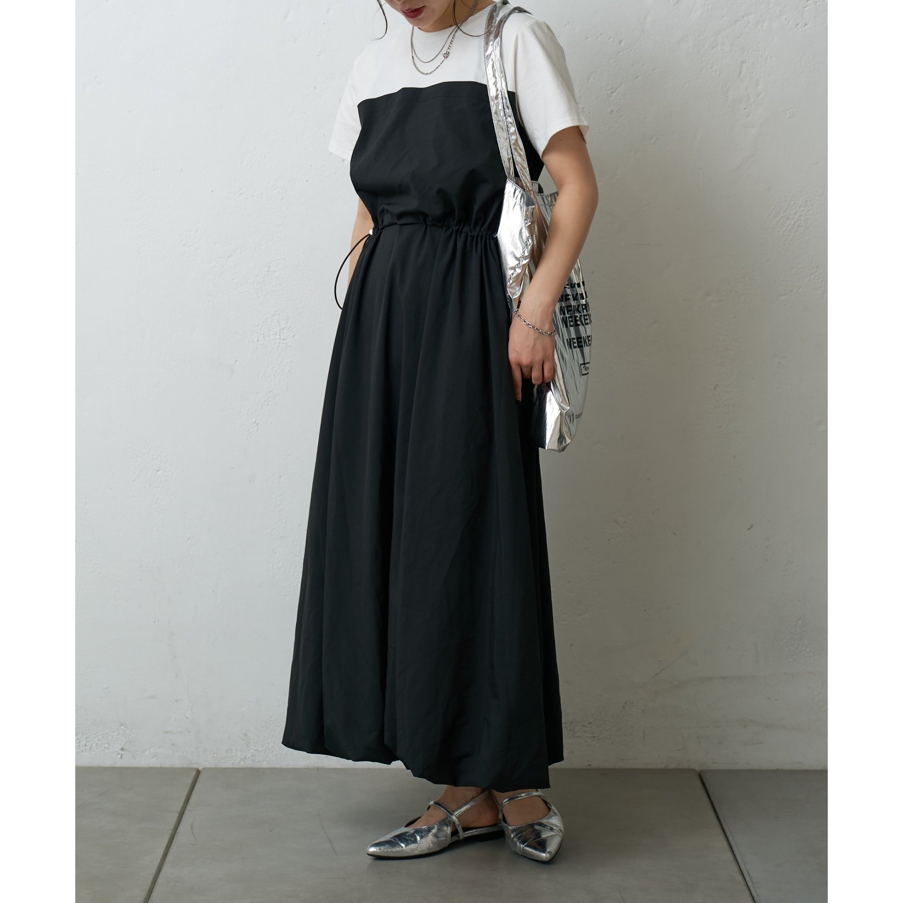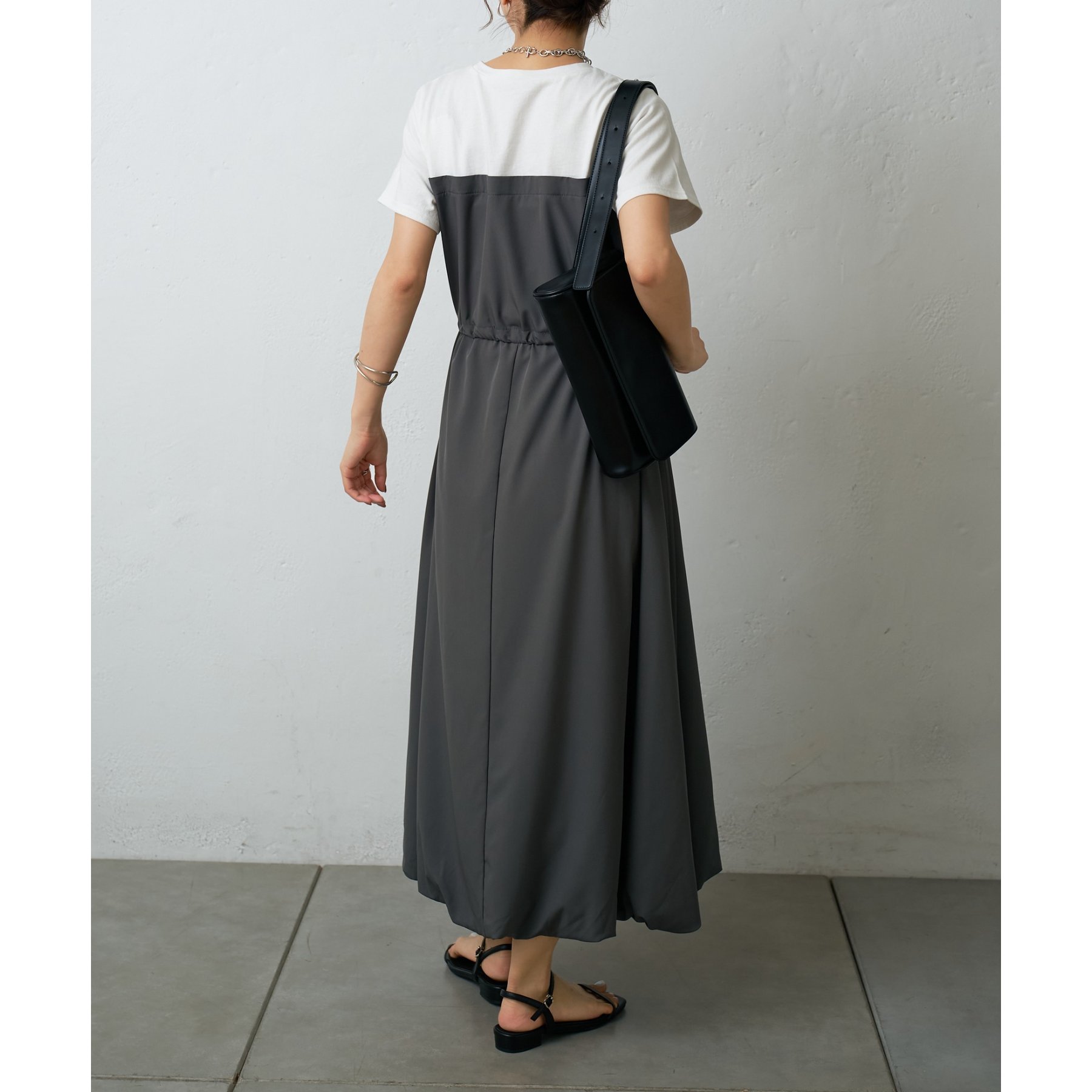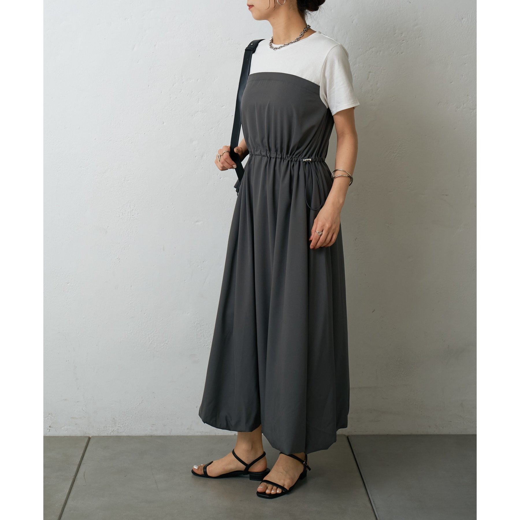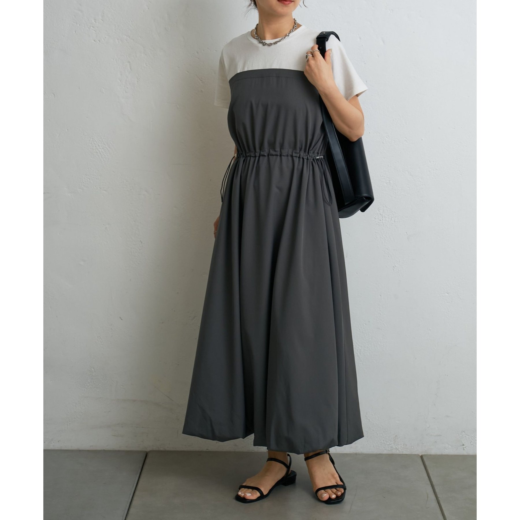 カジュアルなトップス部分と、ふんわりと広がるバルーンシルエットのスカート部分とのコントラストが、シンプルながらもデザイン性の高い一枚です。