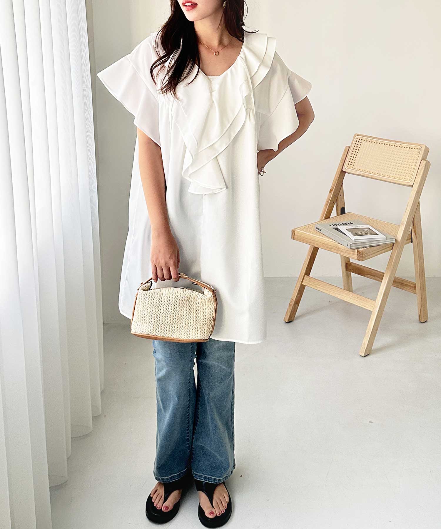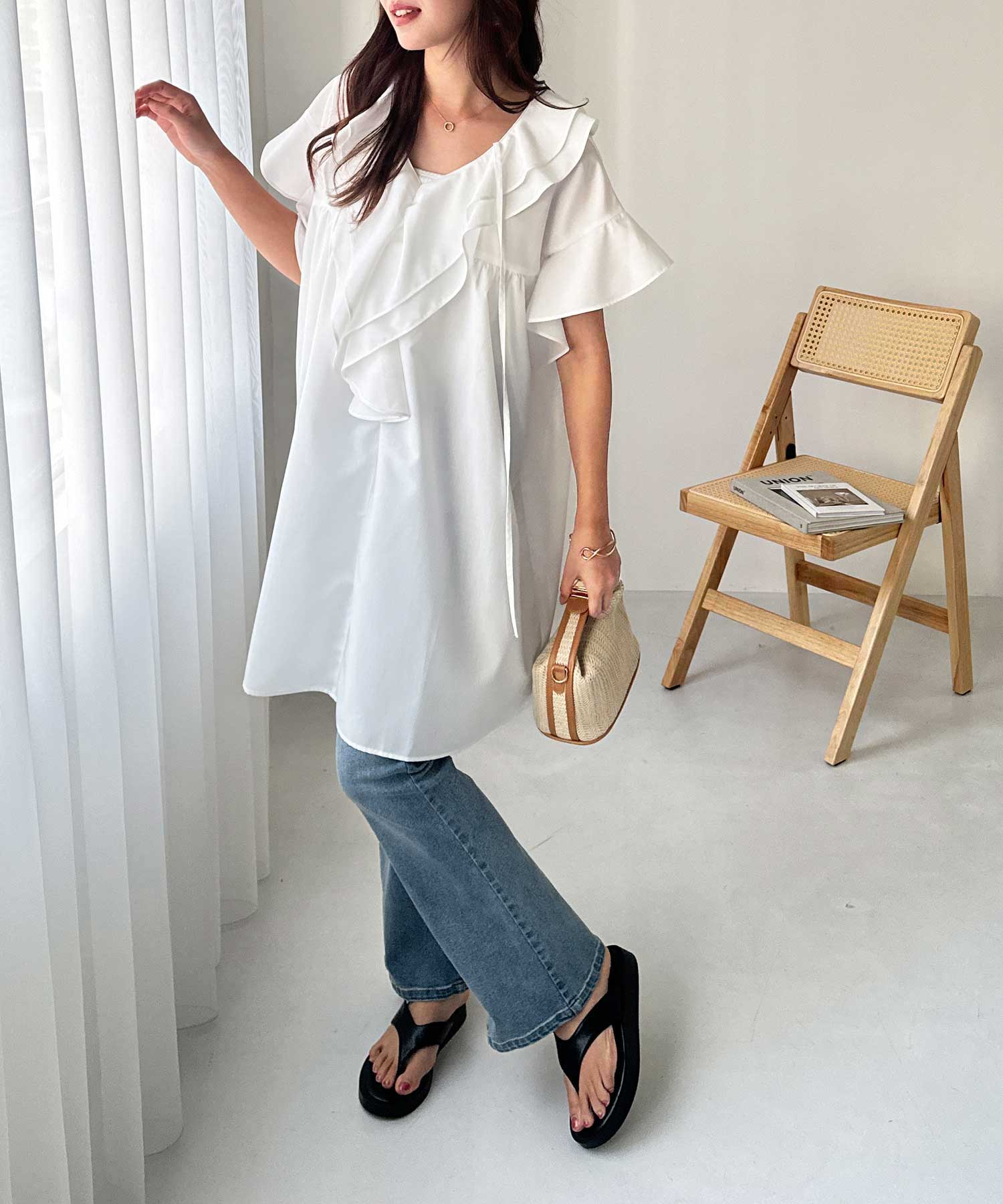ダメージデニムでフリルの甘さをカジュアルダウンするコーデも◎