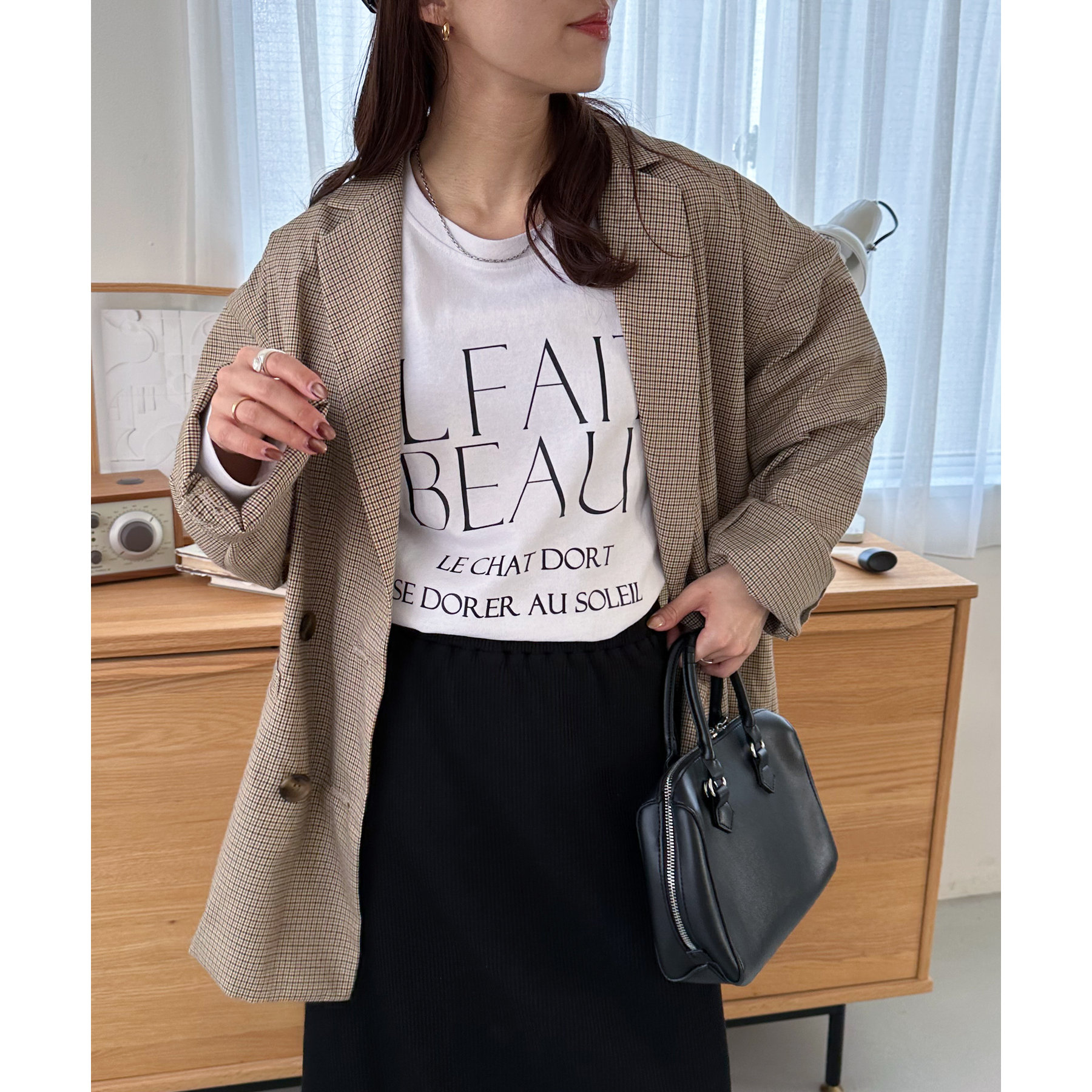 ・153cmスタッフ(Mサイズ着用): 着丈はヒップに少しかかるくらいで、インでもアウトでもバランスよく着られます。