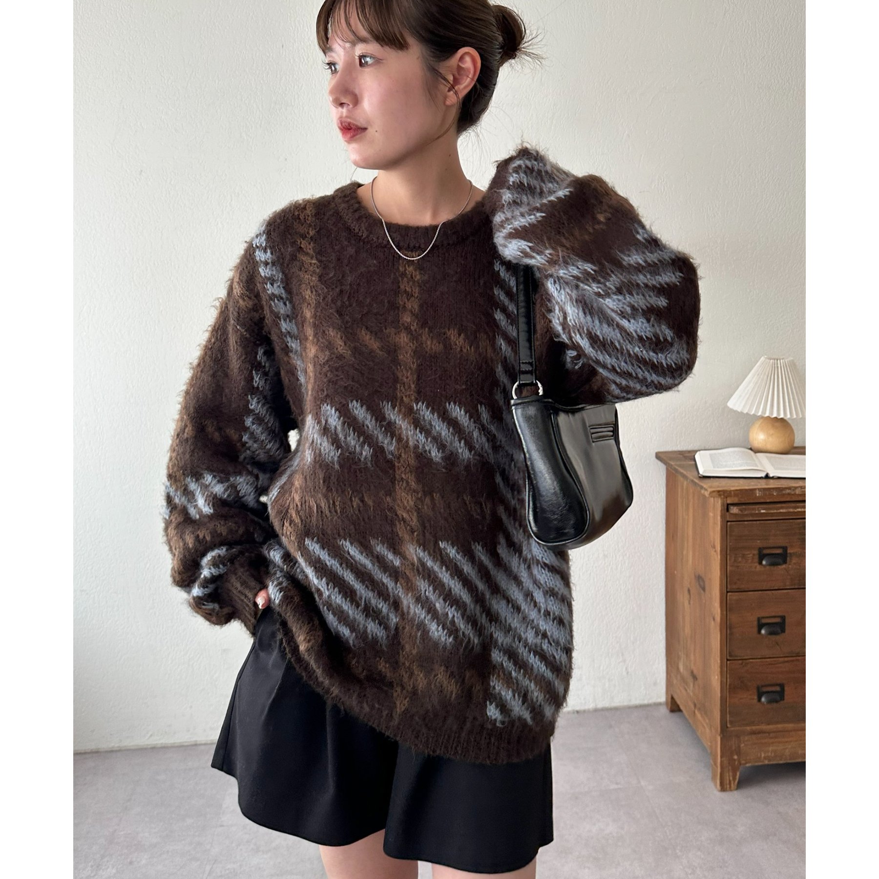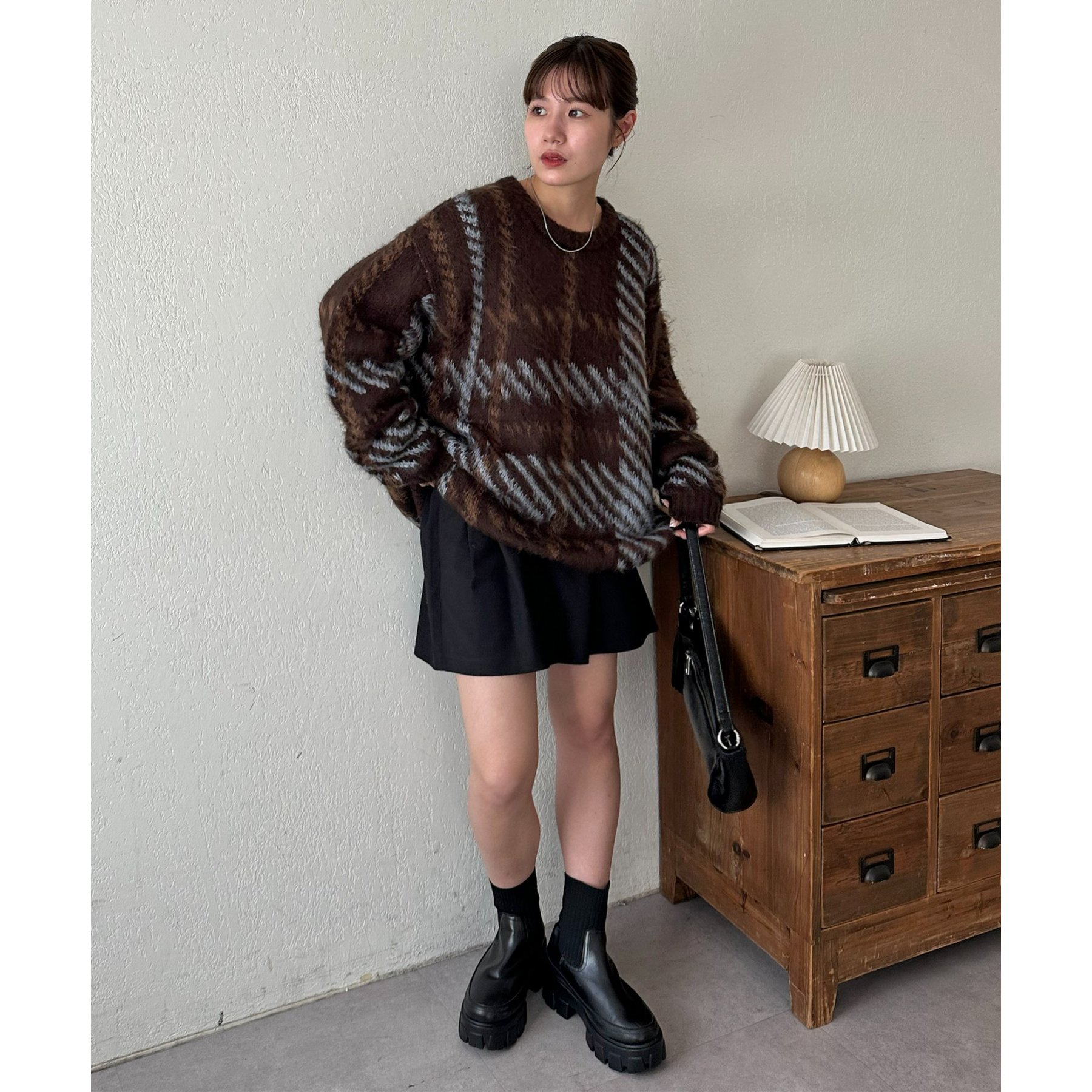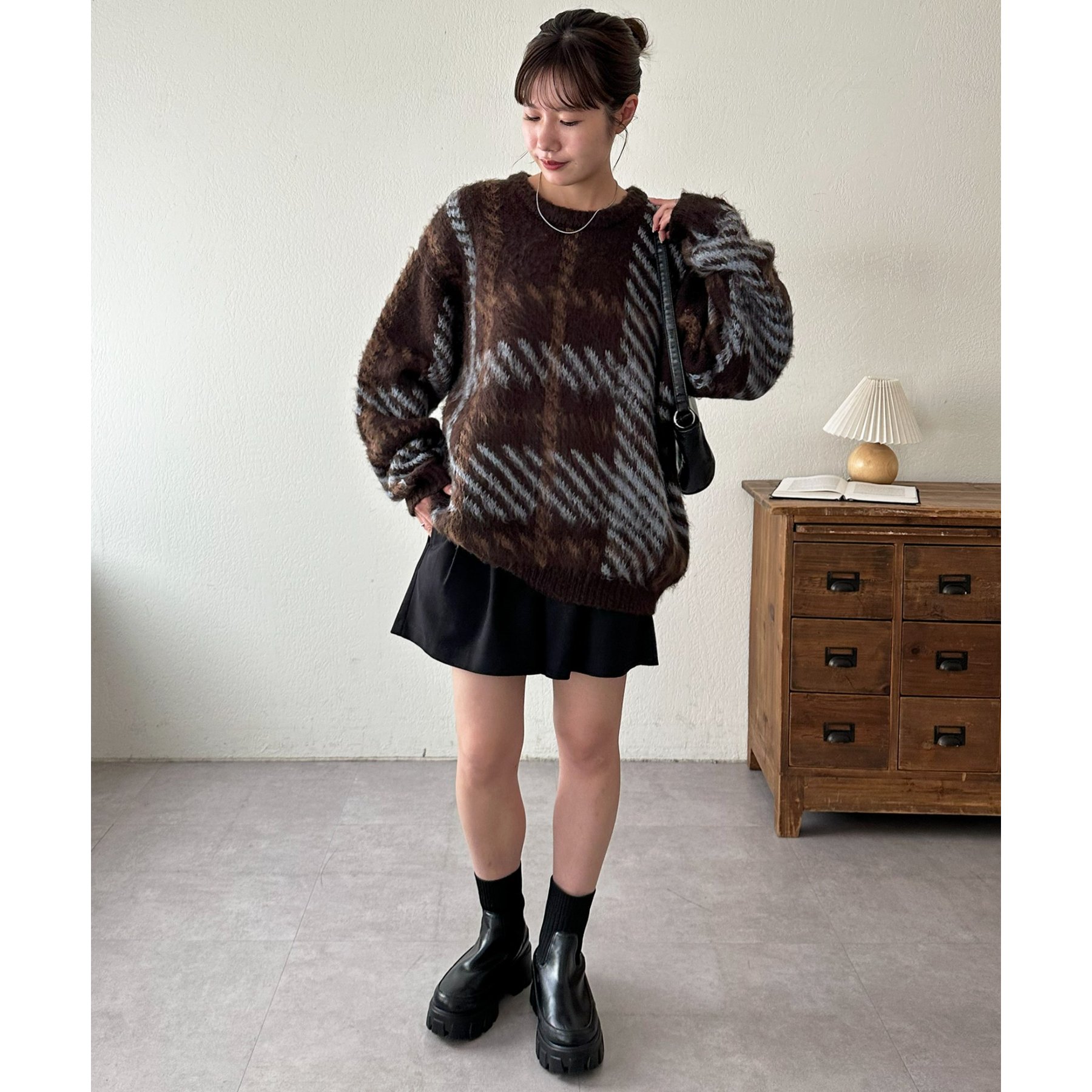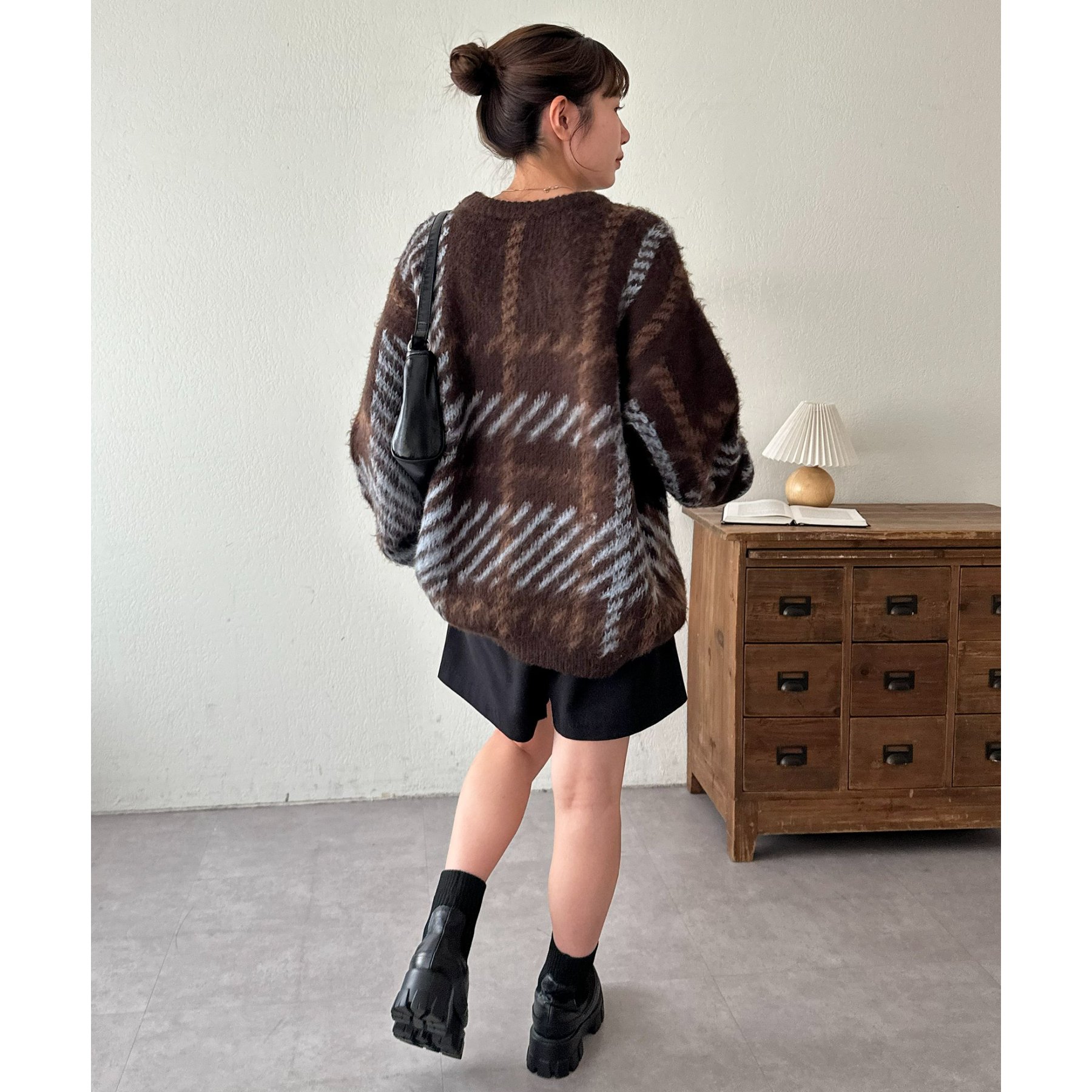 オーバーサイズですが、毛足のある素材とチェック柄が柔らかいイメージになるので、女性も着やすい〇