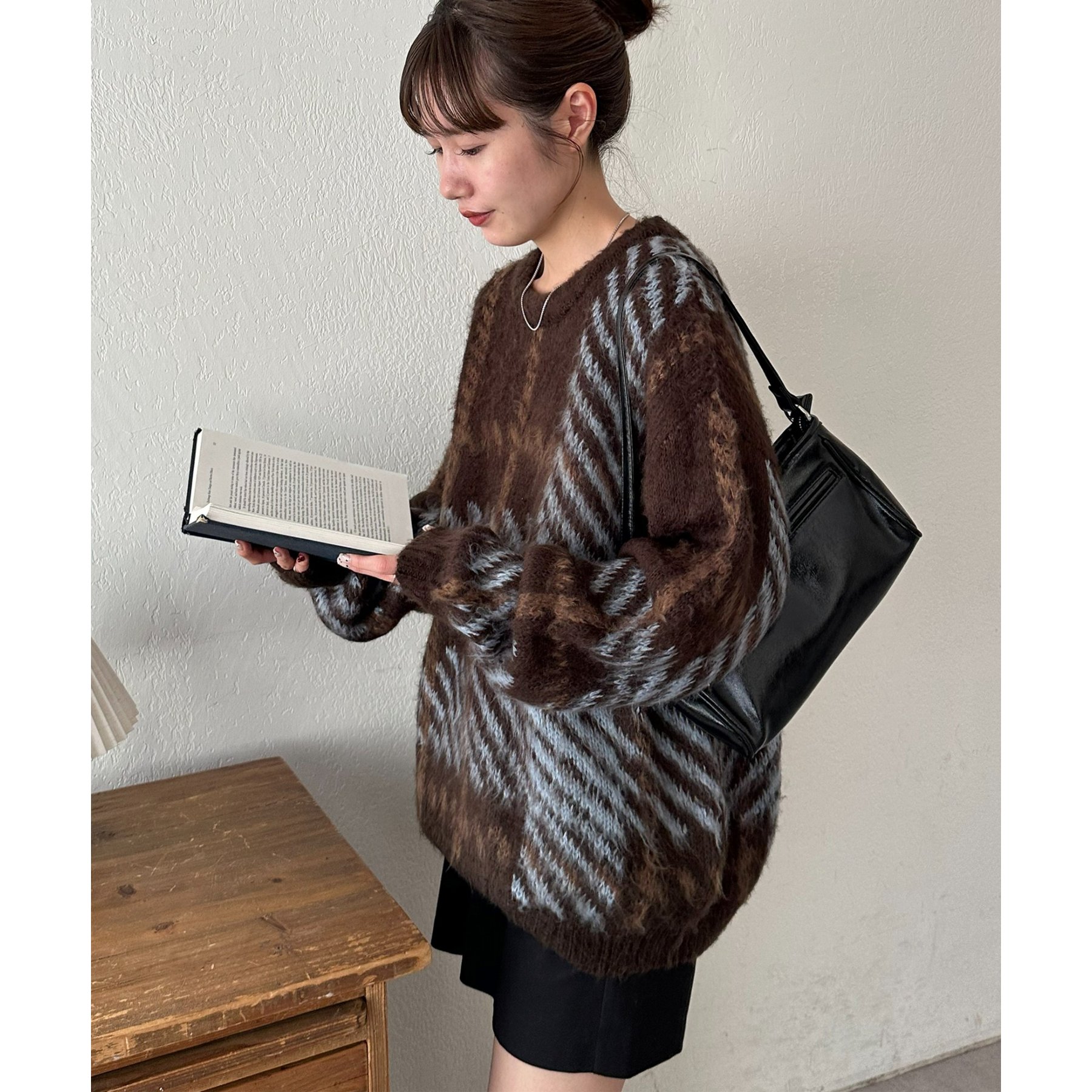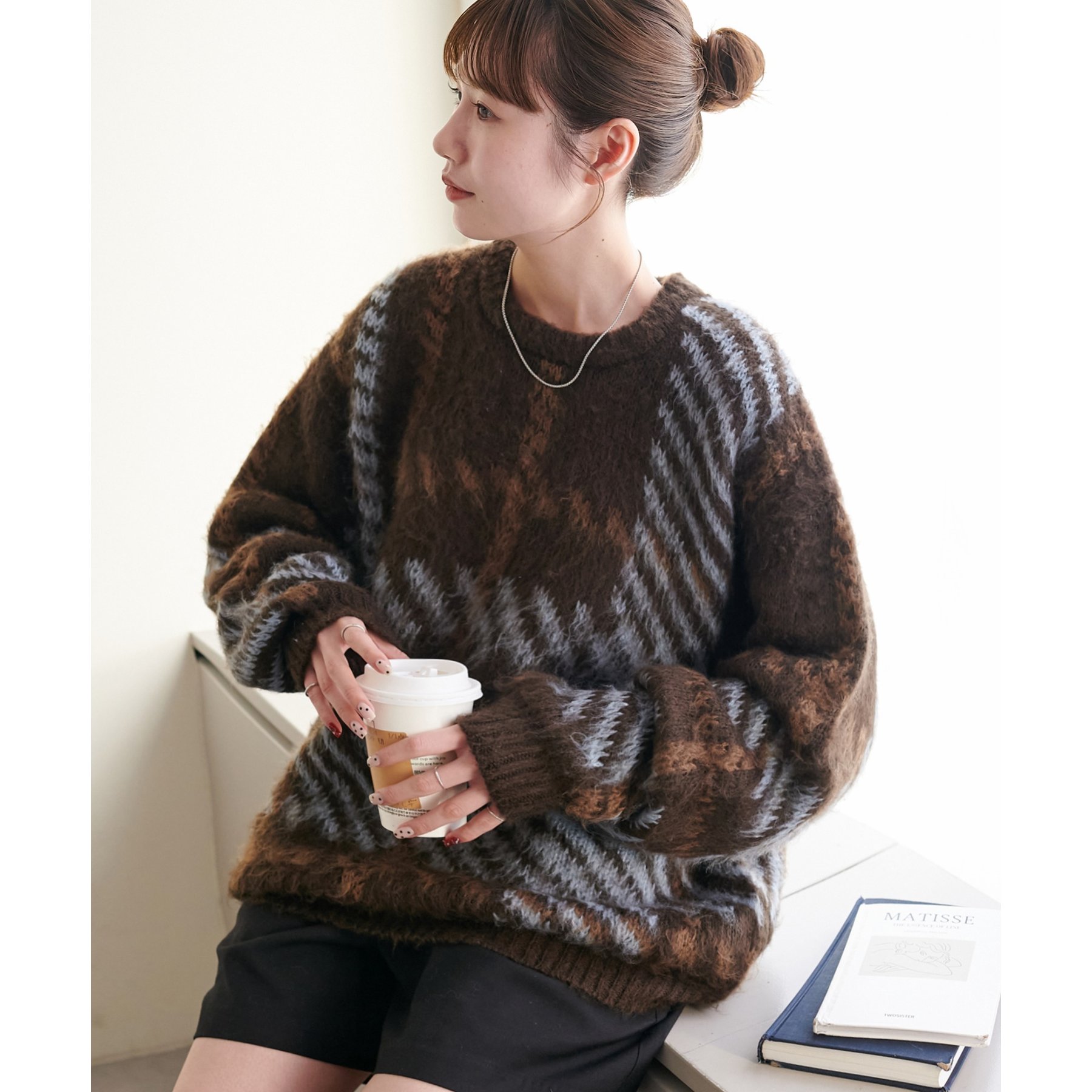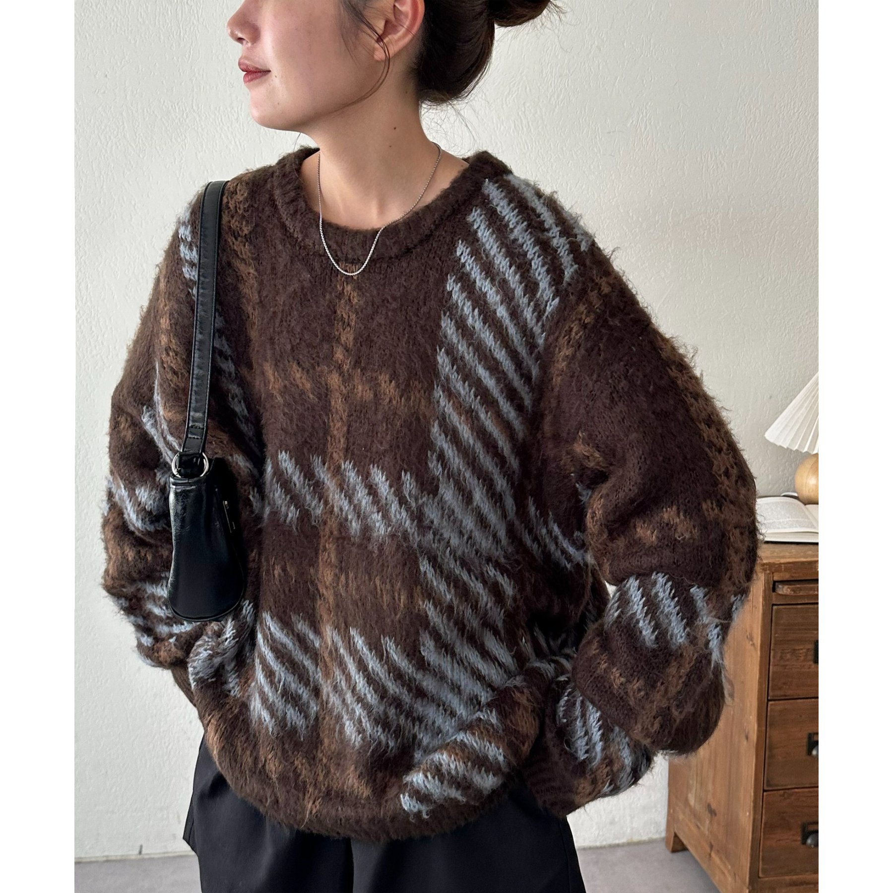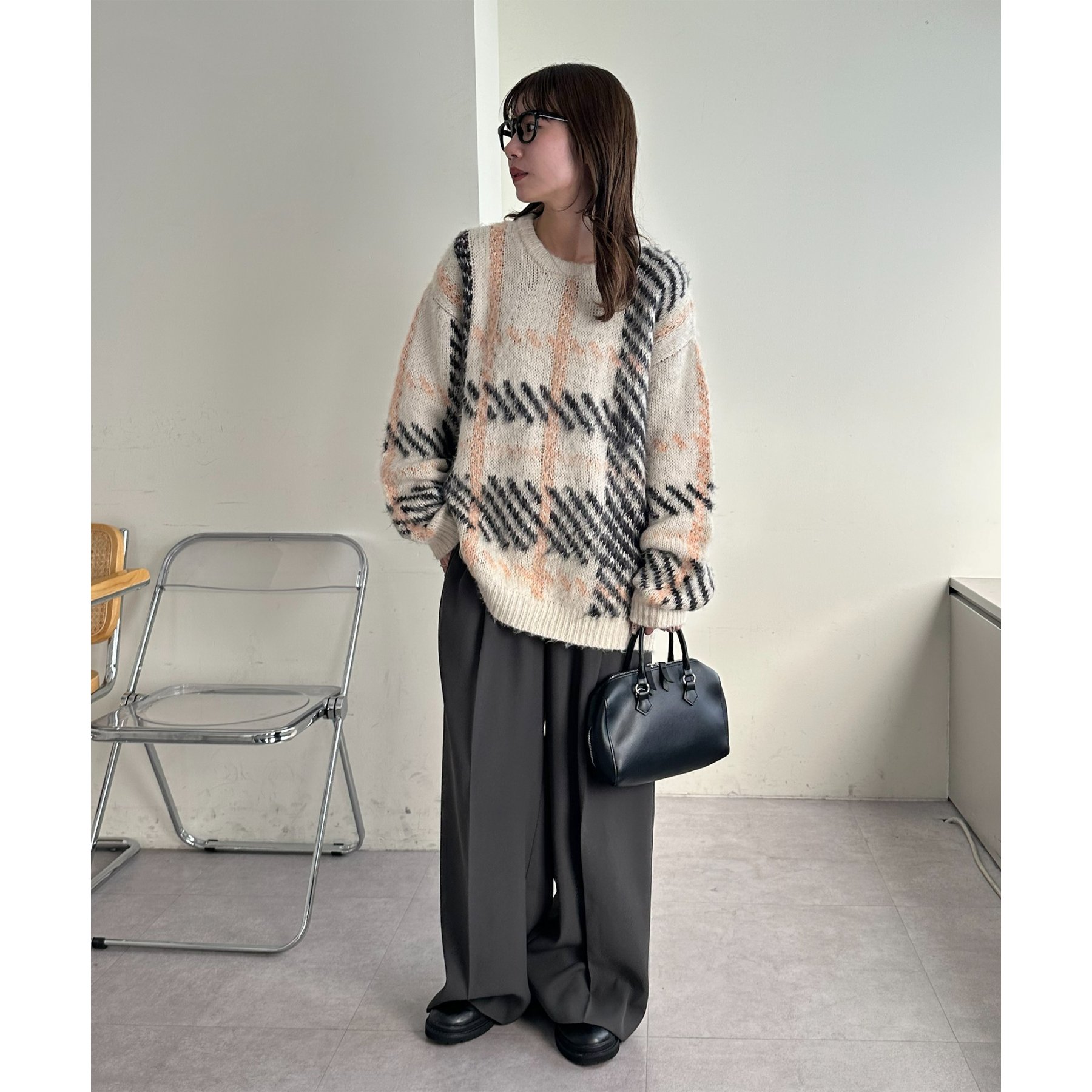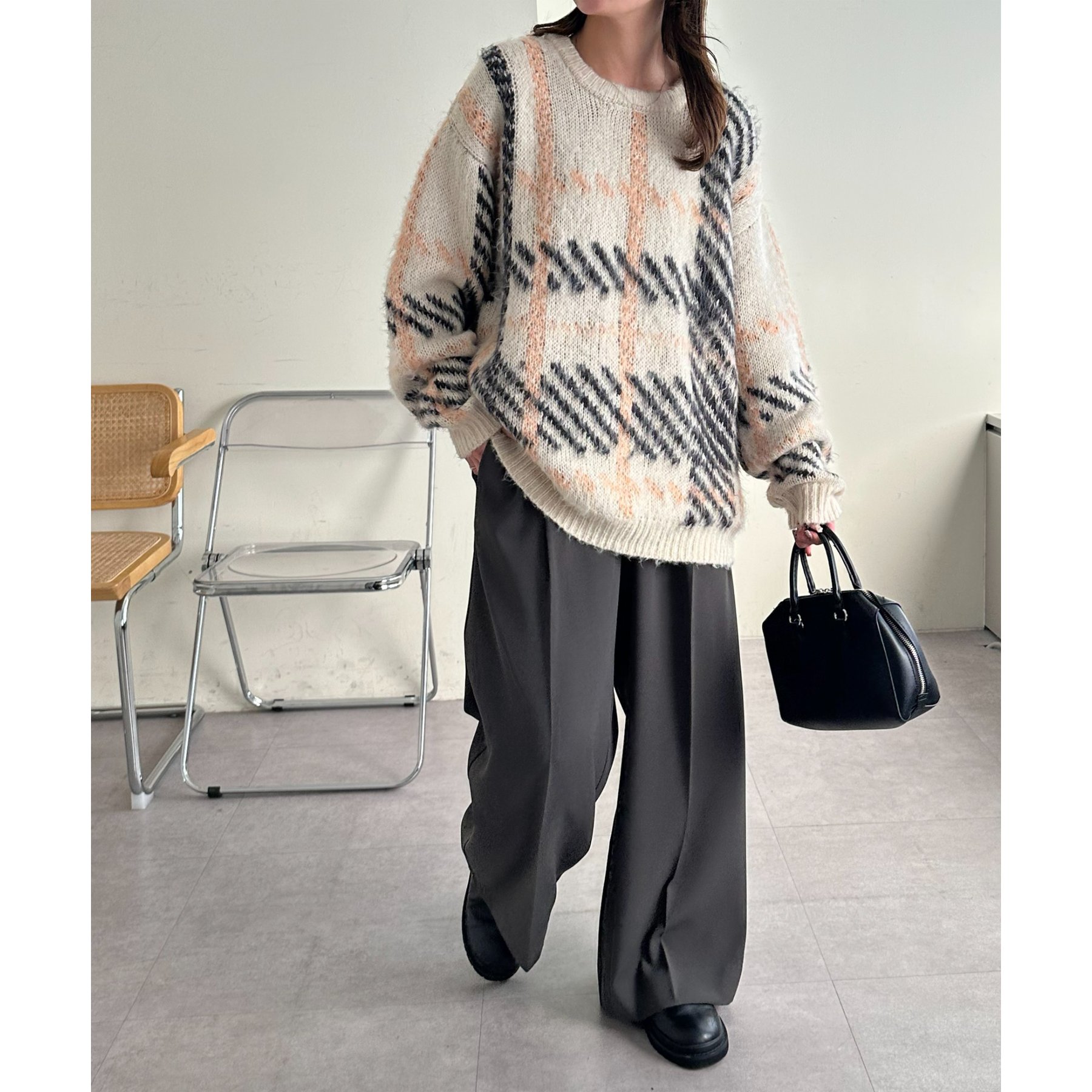 オーバーサイズですが、毛足のある素材とチェック柄が柔らかいイメージになるので、女性も着やすい〇