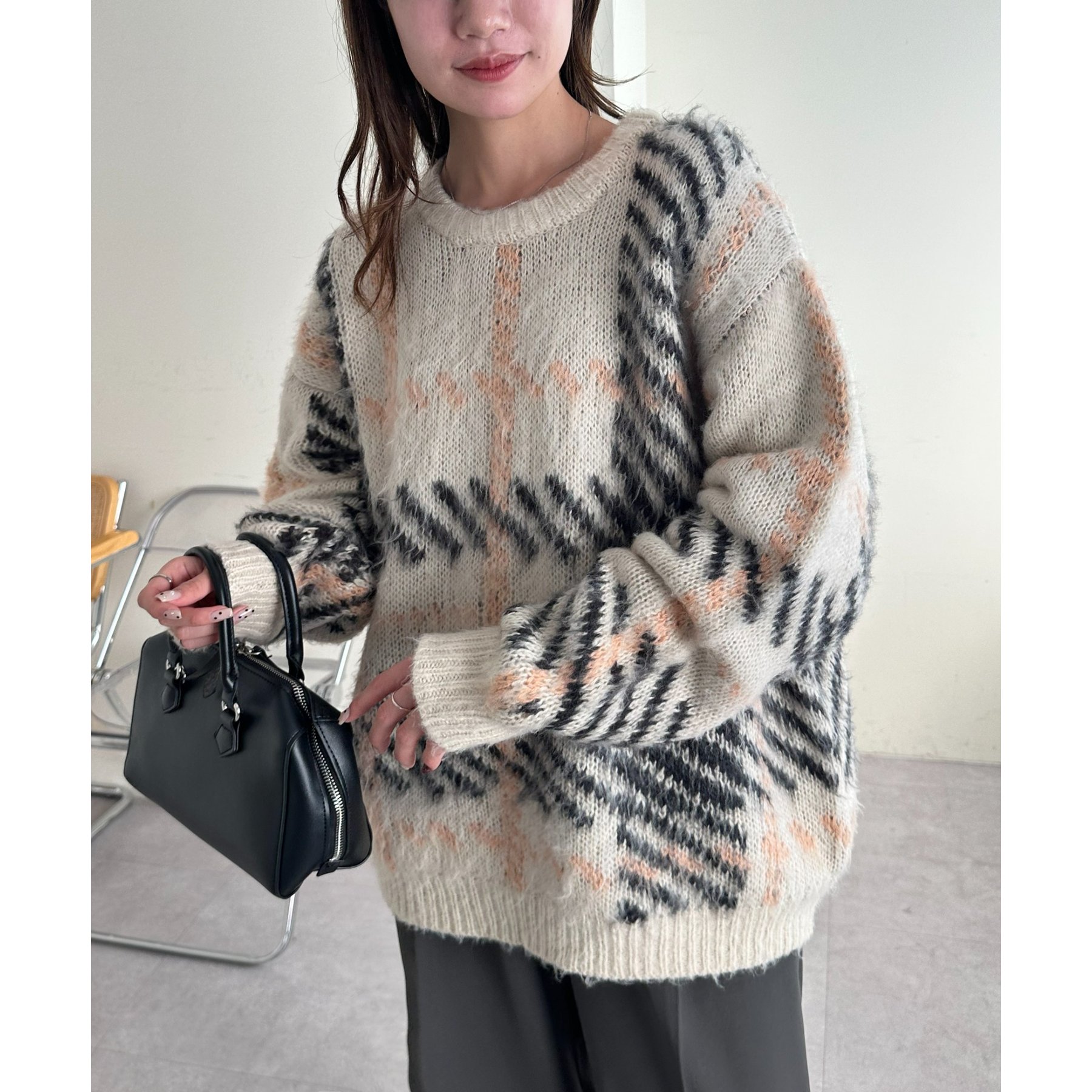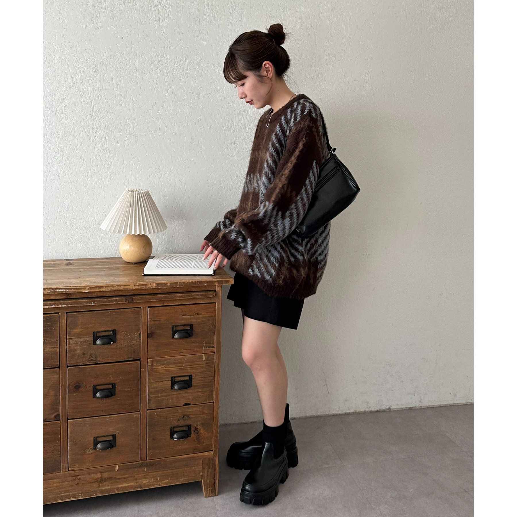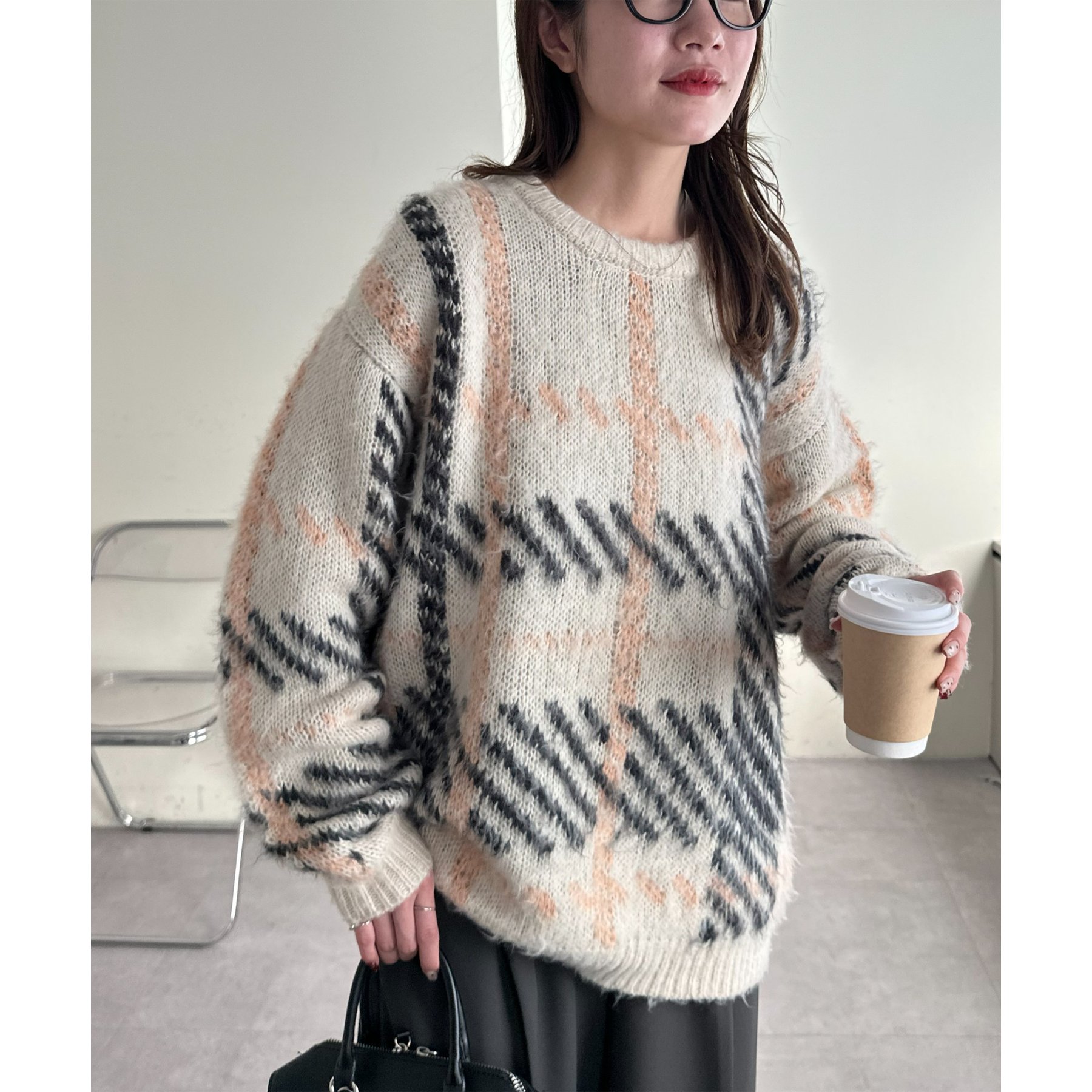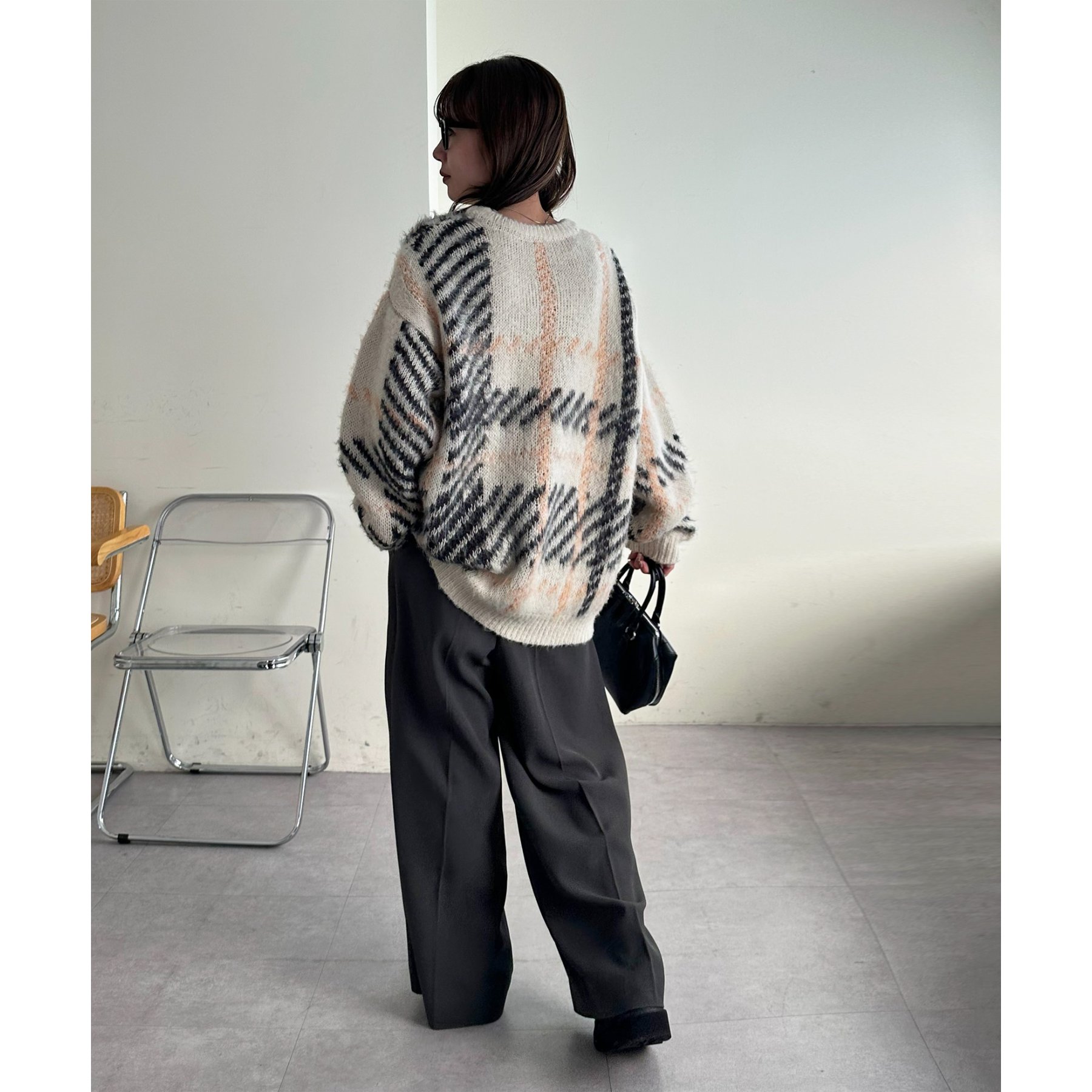 オーバーサイズですが、毛足のある素材とチェック柄が柔らかいイメージになるので、女性も着やすい〇