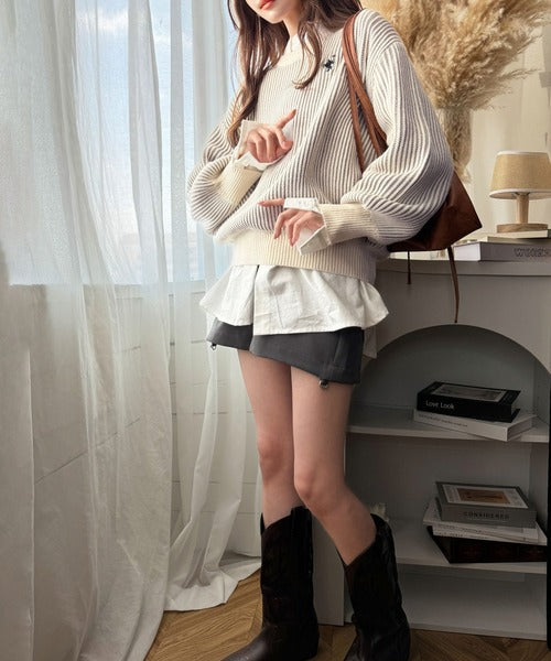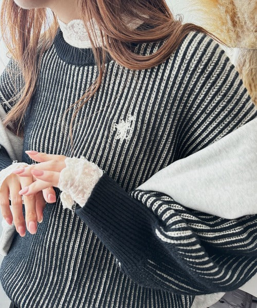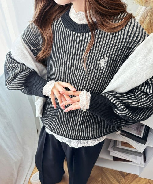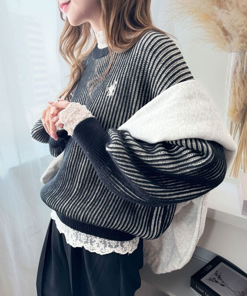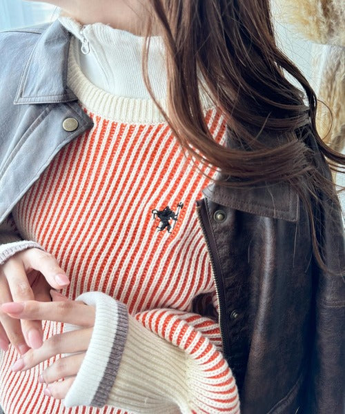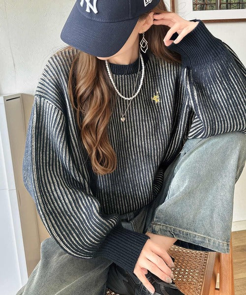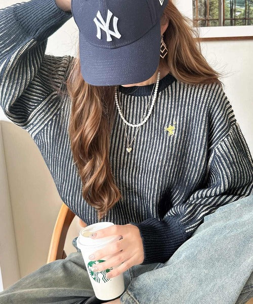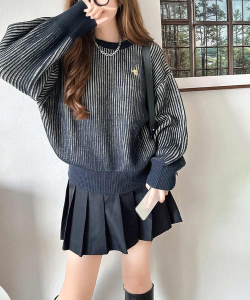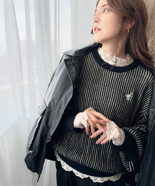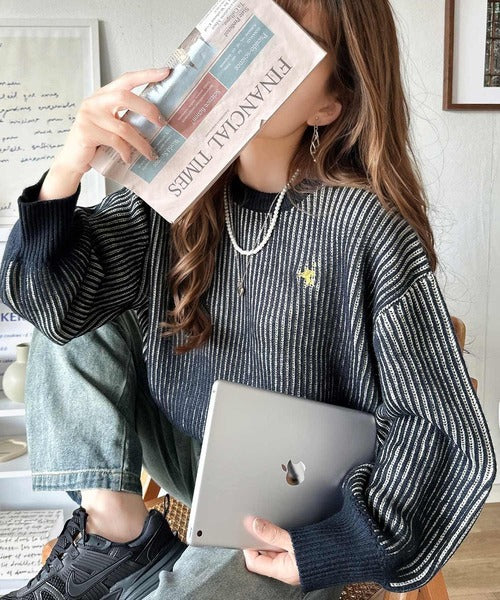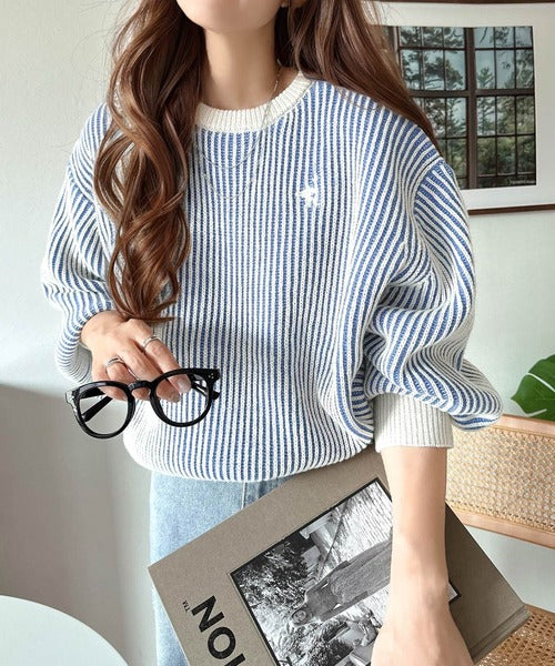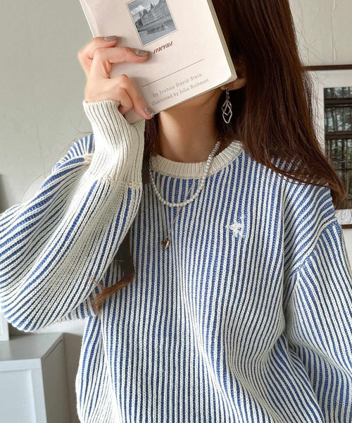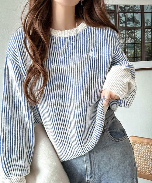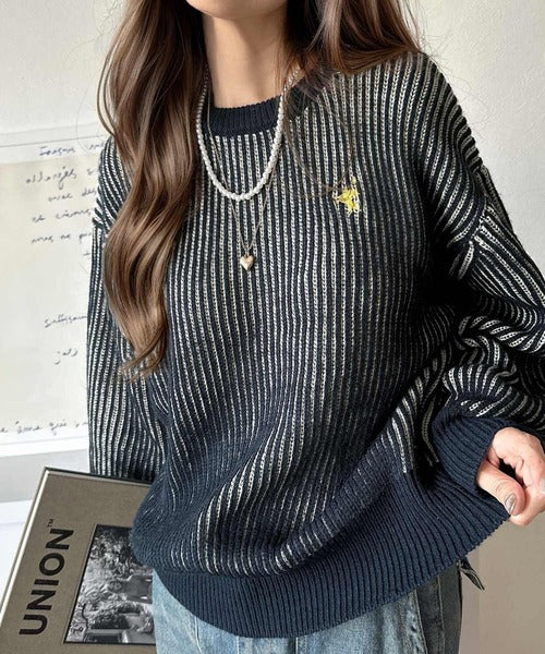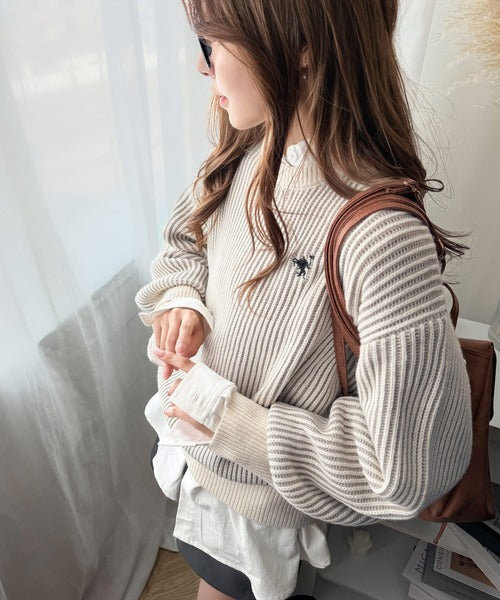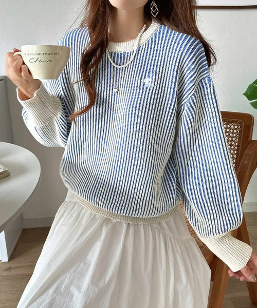 カジュアルコーデをアップデート。胸刺繍バイカラーストライプ調ニットプルオーバー ce1020182