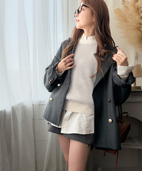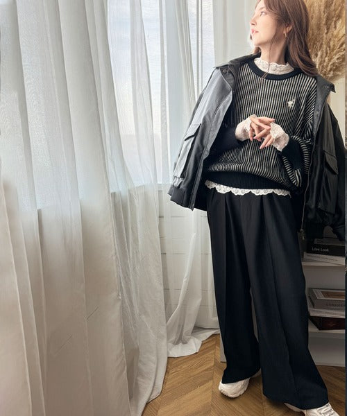 配色の畔編み仕様で他のニットとは違うスタイリングの主役になる一枚。