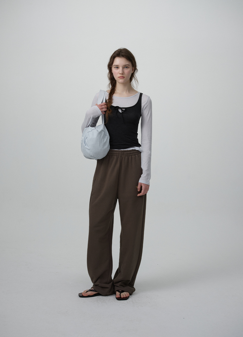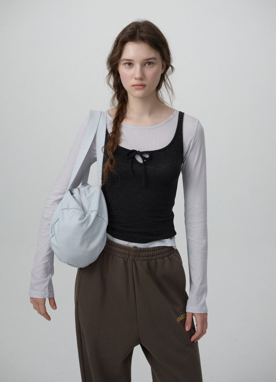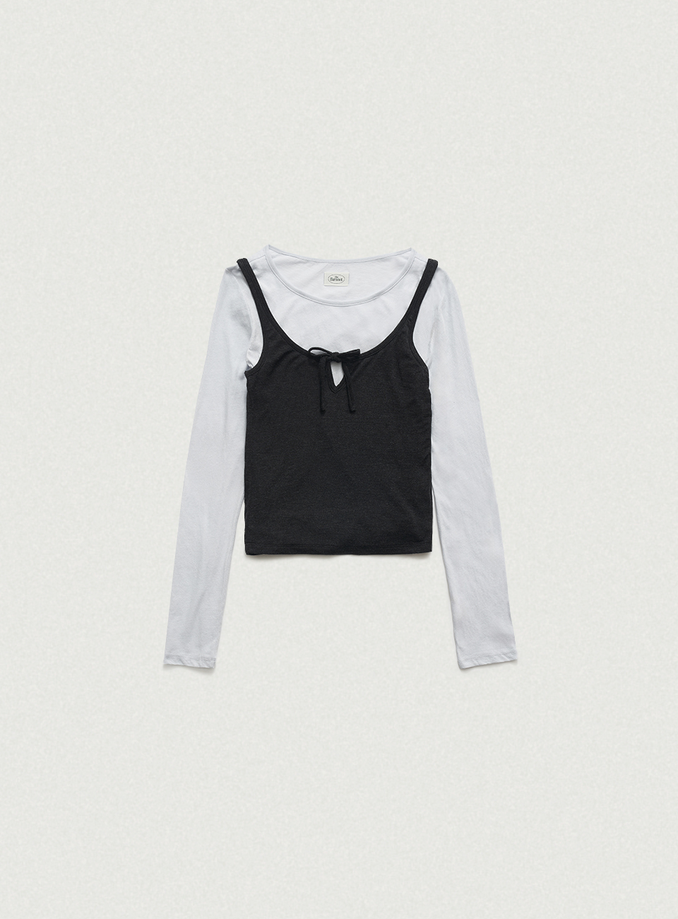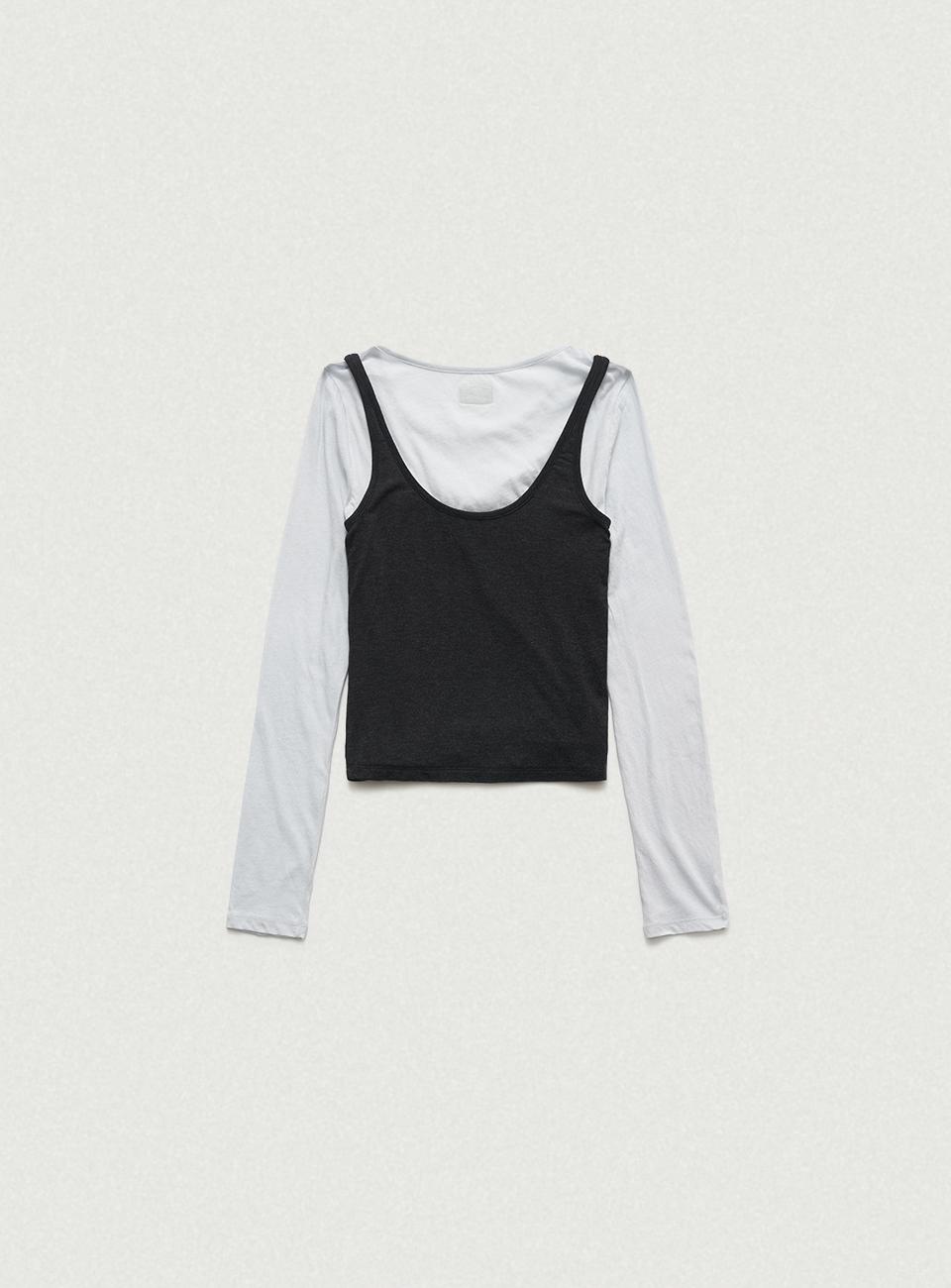 ソフトなブルーと深みのあるチャコールの配色が映えるコットン×テンセル混素材 スリムなロングスリーブTシャツと、リボンディテールがポイントのスリーブレスのセットアップデザイン 2つのアイテムを別々にも、重ね着しても楽しめる2WAY仕様で、 コットン×テンセル混素材で、柔らかな着心地に加え長く快適に着用できるアイテム ※濃色の特性上、淡色との摩擦で色移りする場合がありますので、着用・保管時はご注意ください。 Shell1 - Cotton 100% Shell2 - Tencel 64% Polyester 27% Spandex 9% Light Blue Cotton Charcoal Tencel Blend Ribbon Detail Slim Fit Two-Way Styling