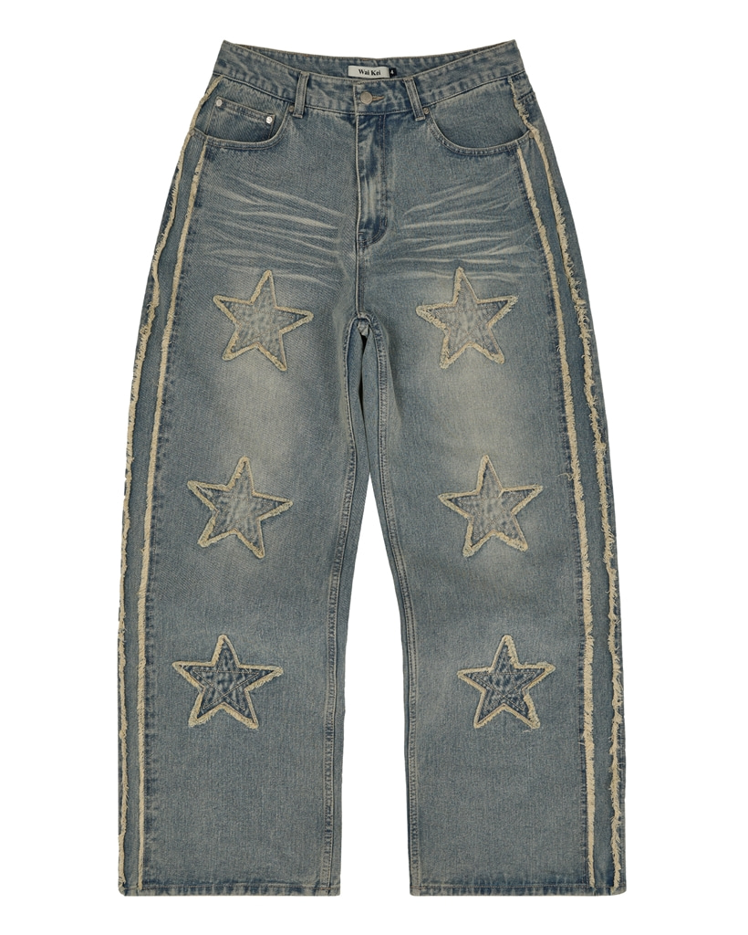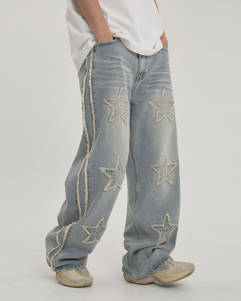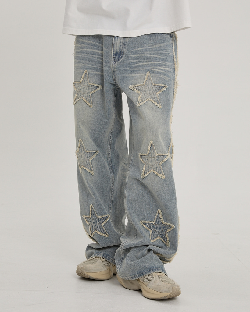 [K-POPアイドル着用] Star Applique Denim Pants Yellow Washed LIGHT BLUE
