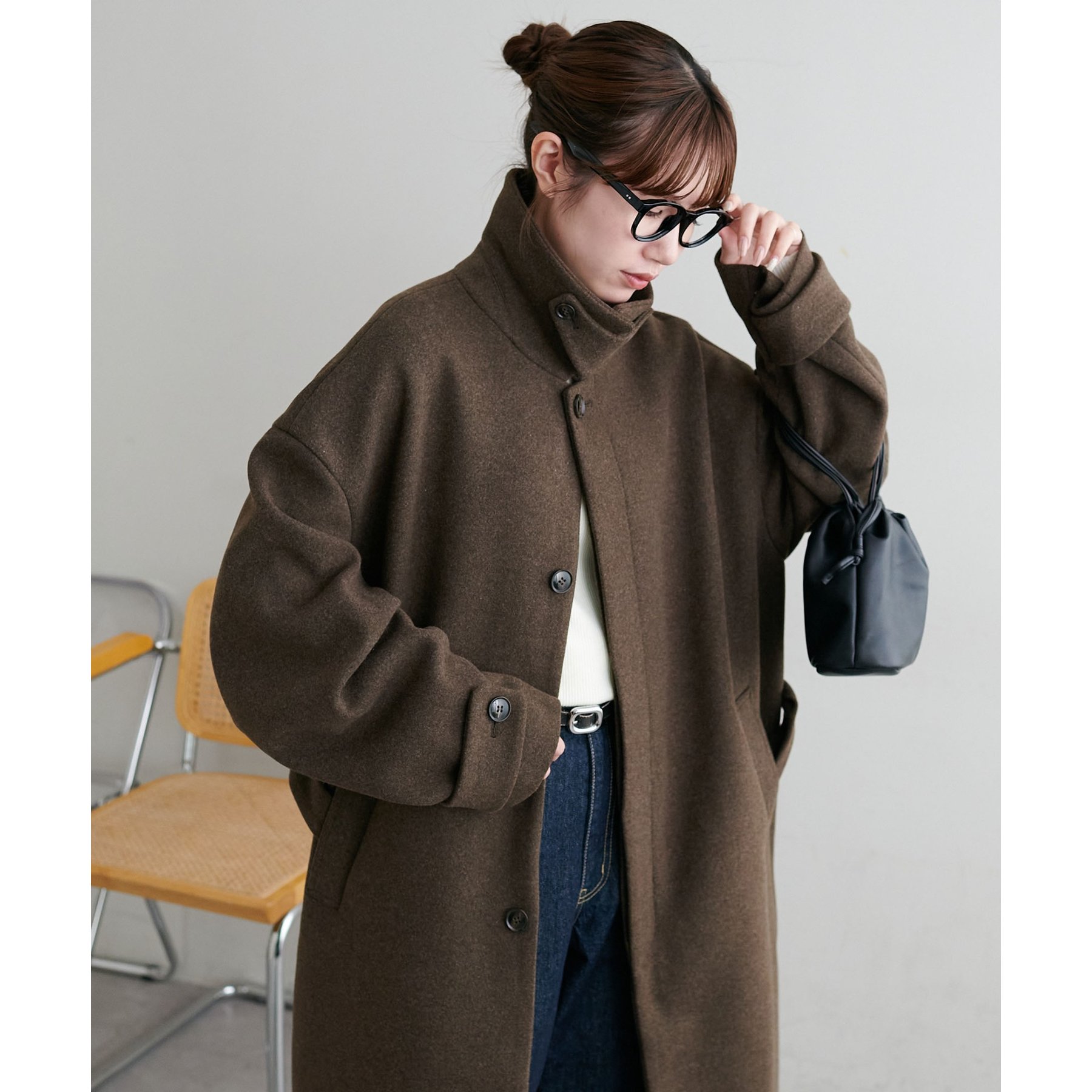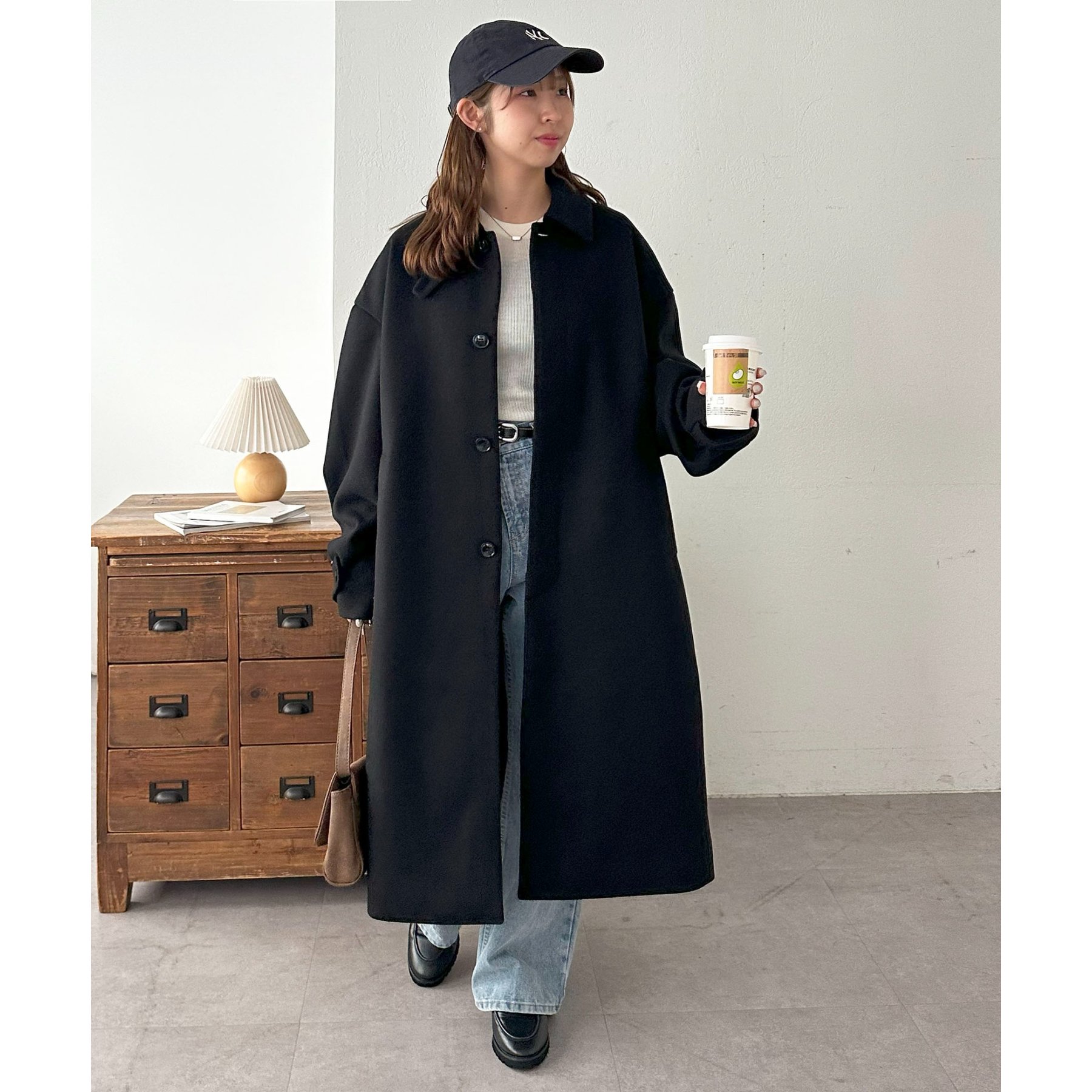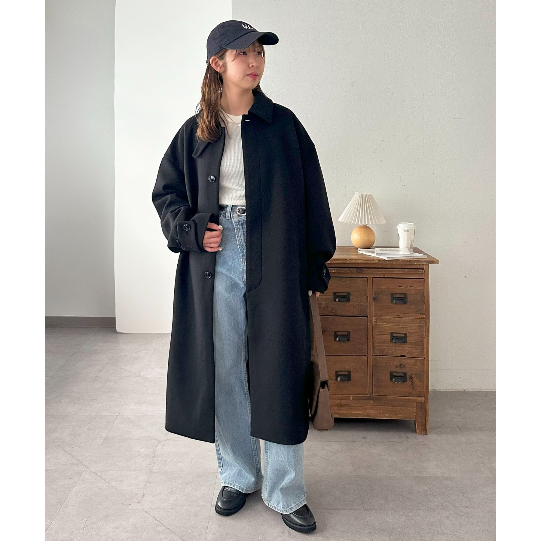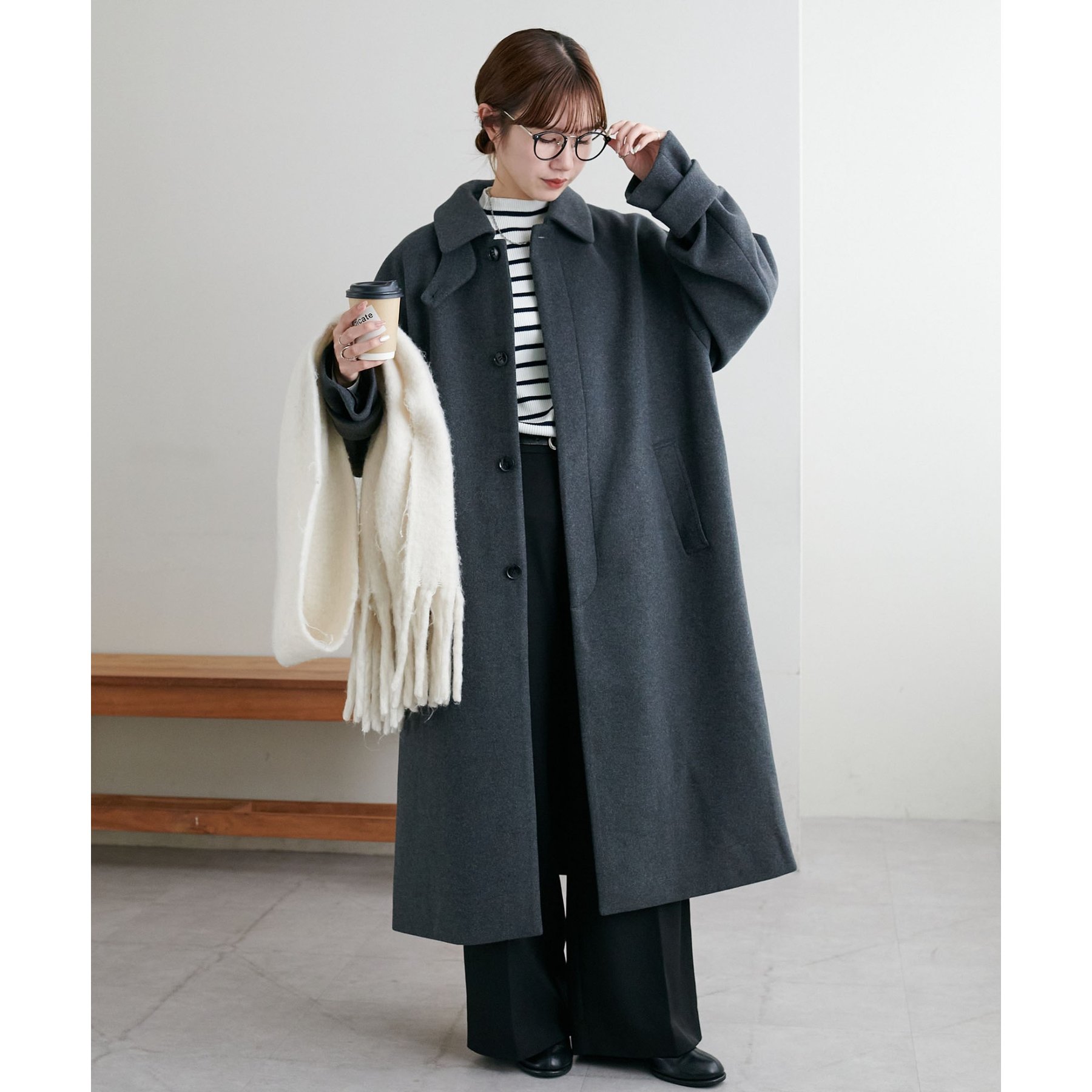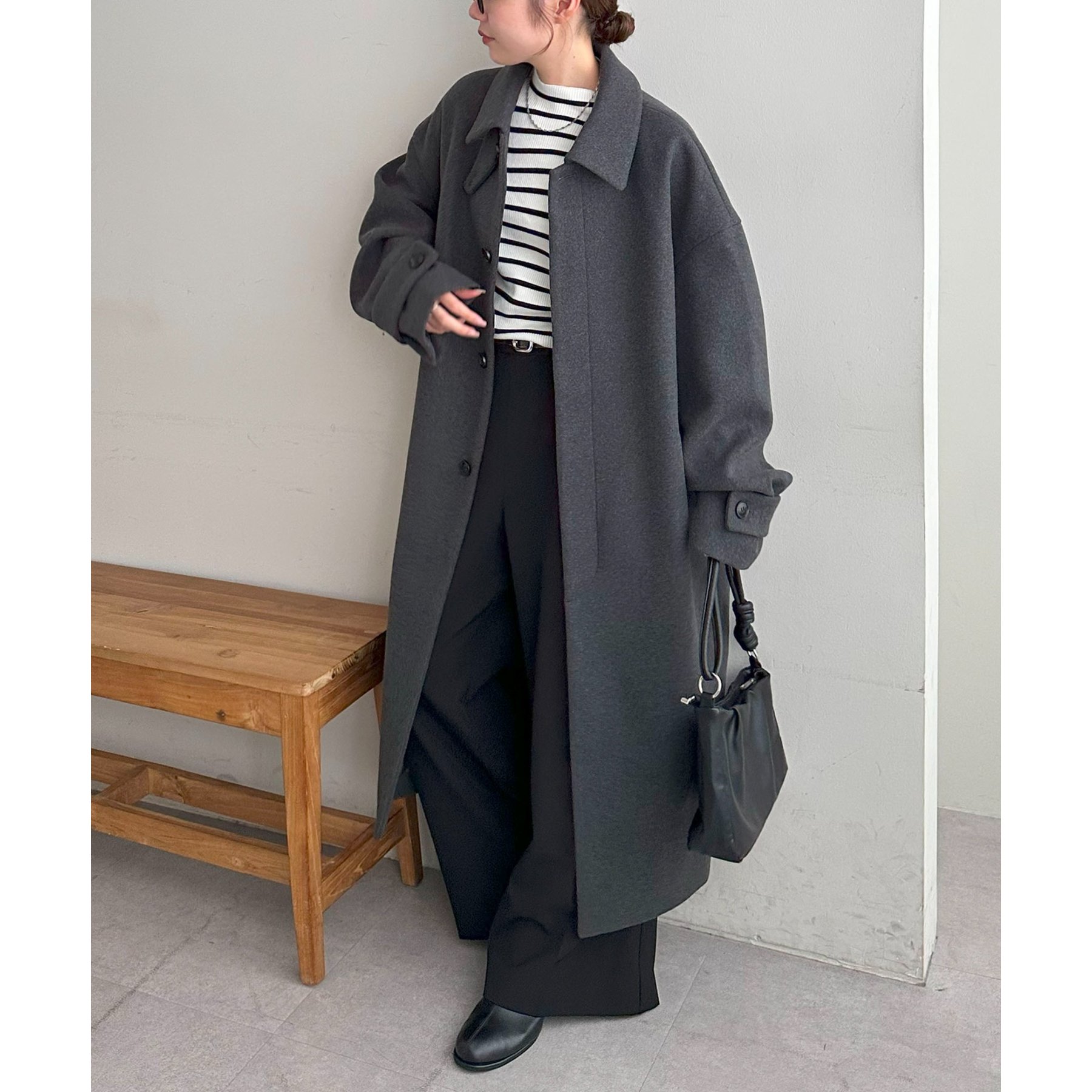 158cmレディーススタッフ(Mサイズ着用):身幅や腕回りがゆったりとしているので、ロングコートですがラフな印象もプラスしながら着ることができます。