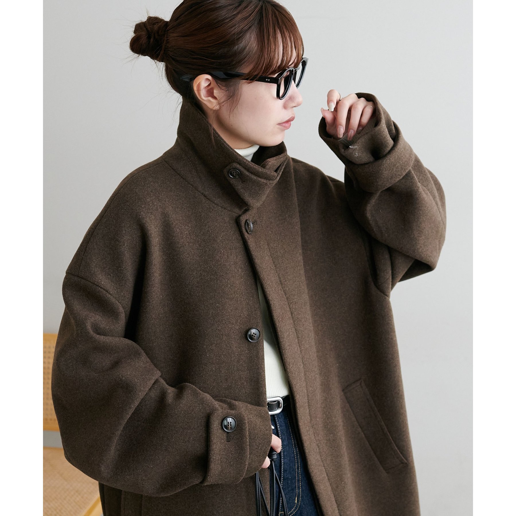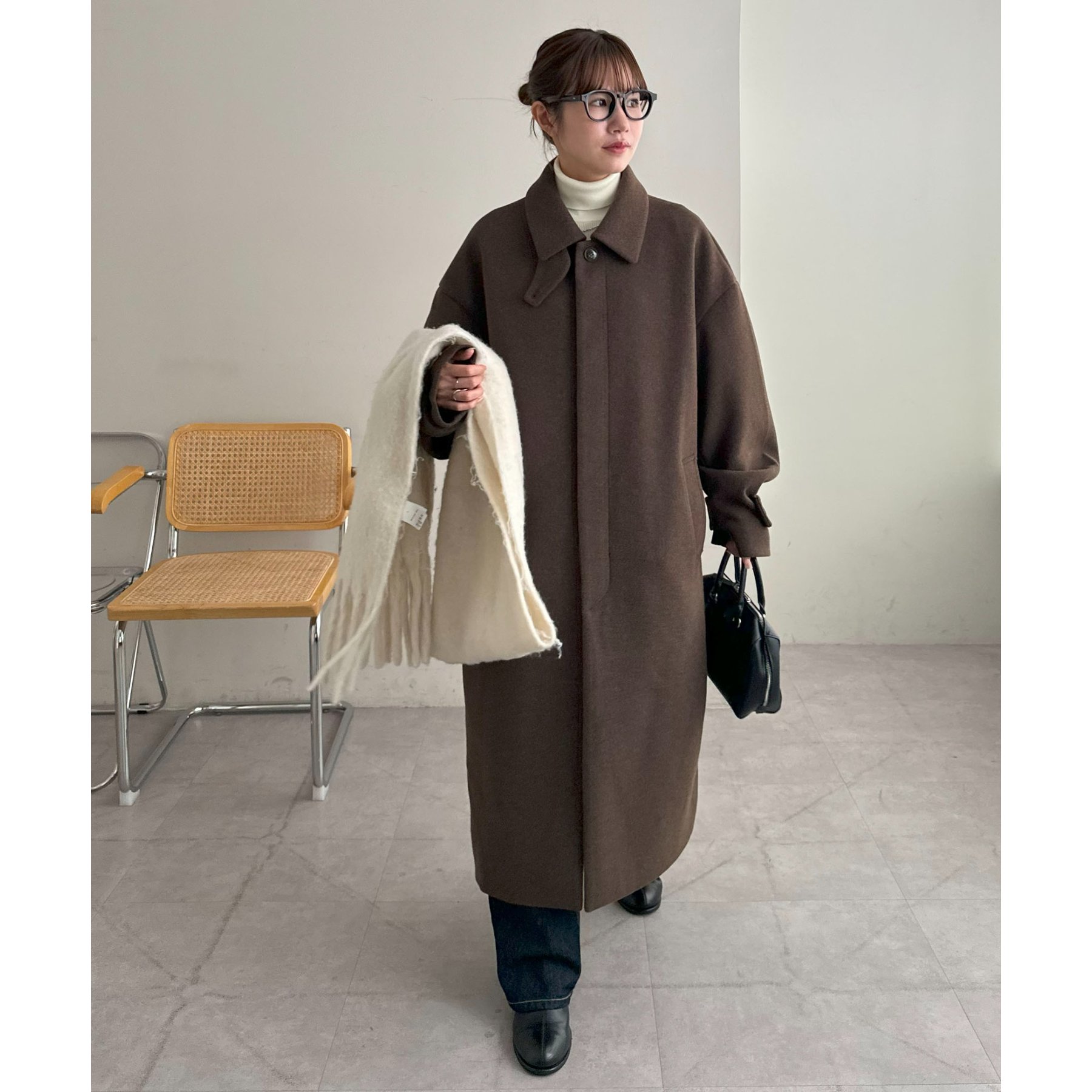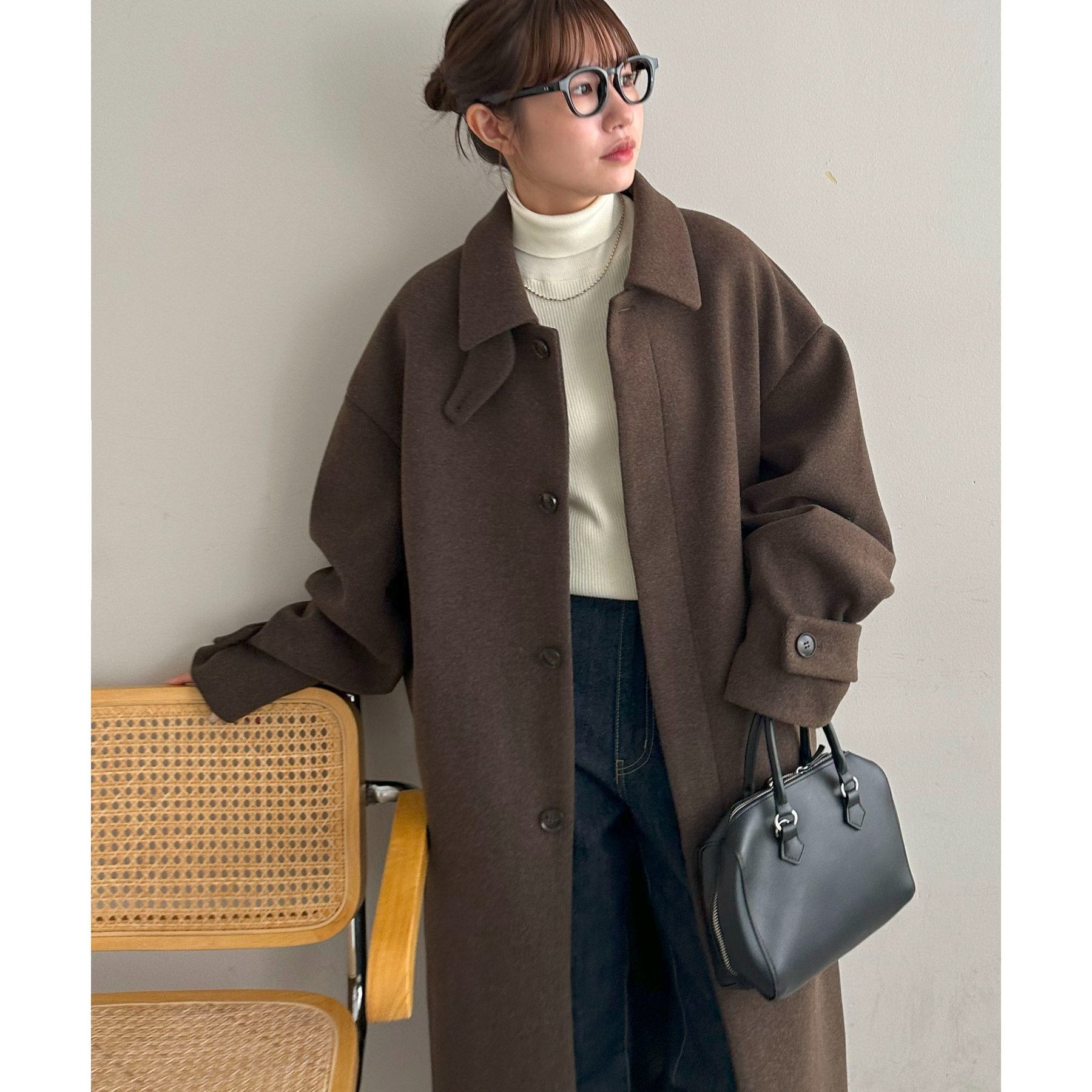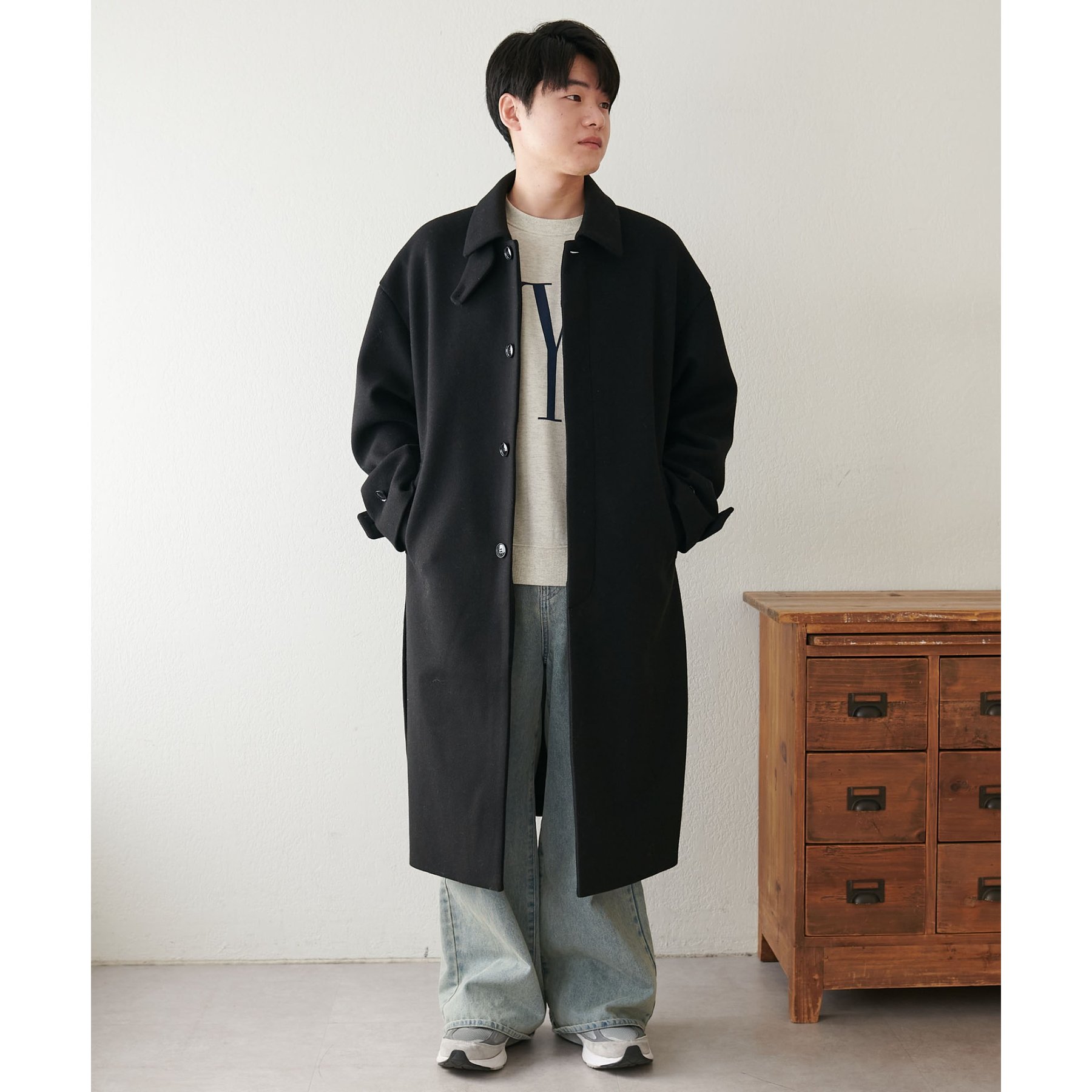 158cmレディーススタッフ(Mサイズ着用):身幅や腕回りがゆったりとしているので、ロングコートですがラフな印象もプラスしながら着ることができます。