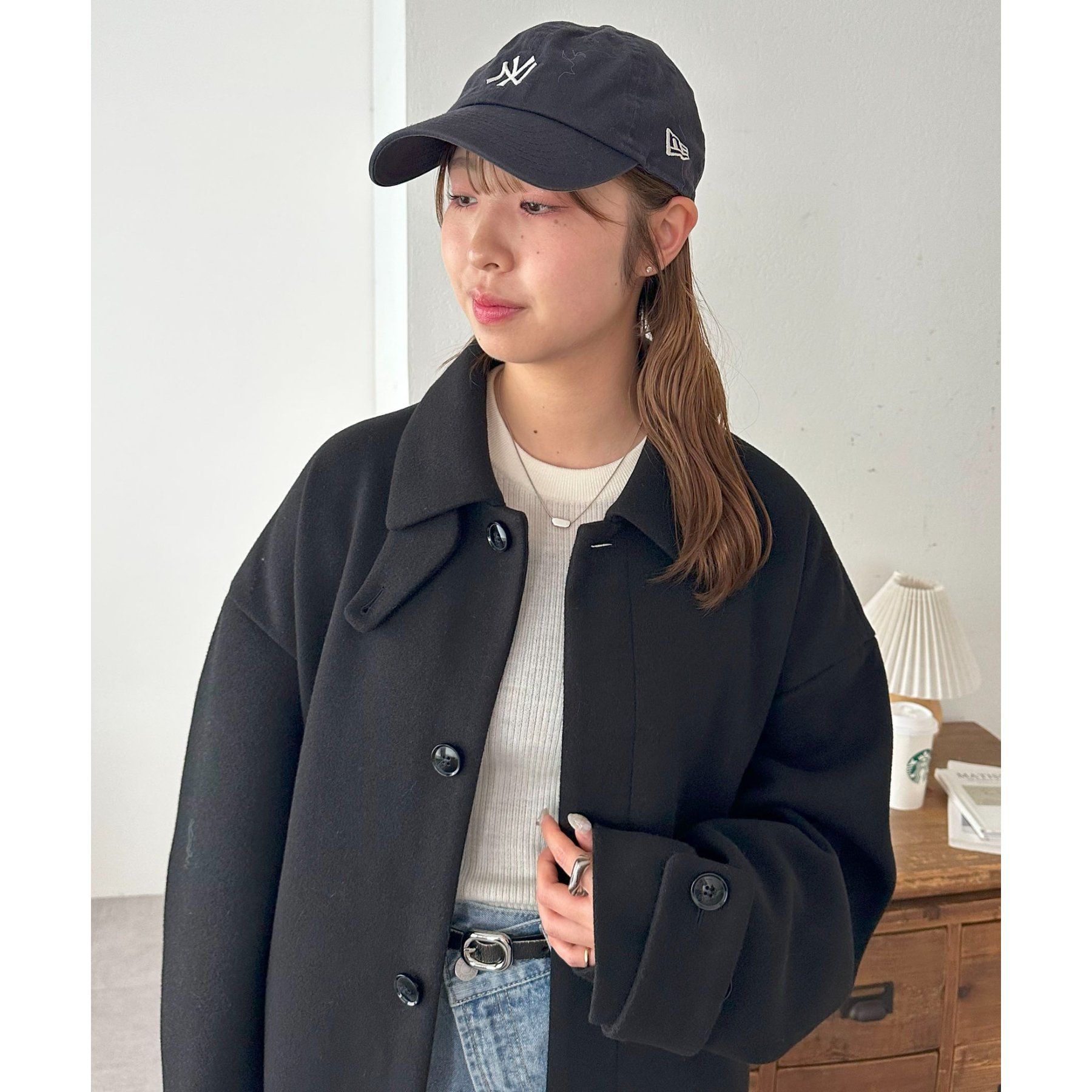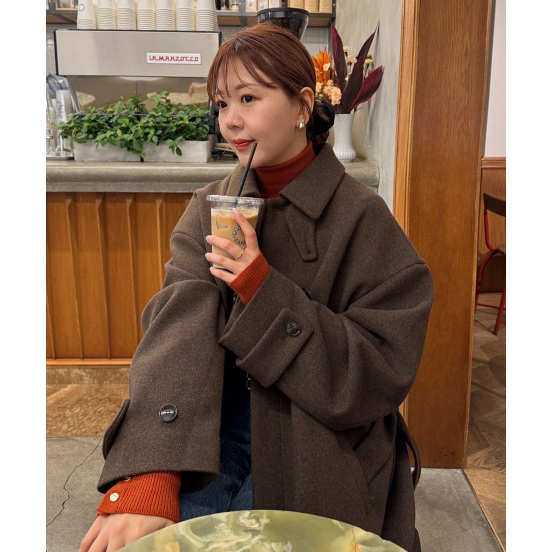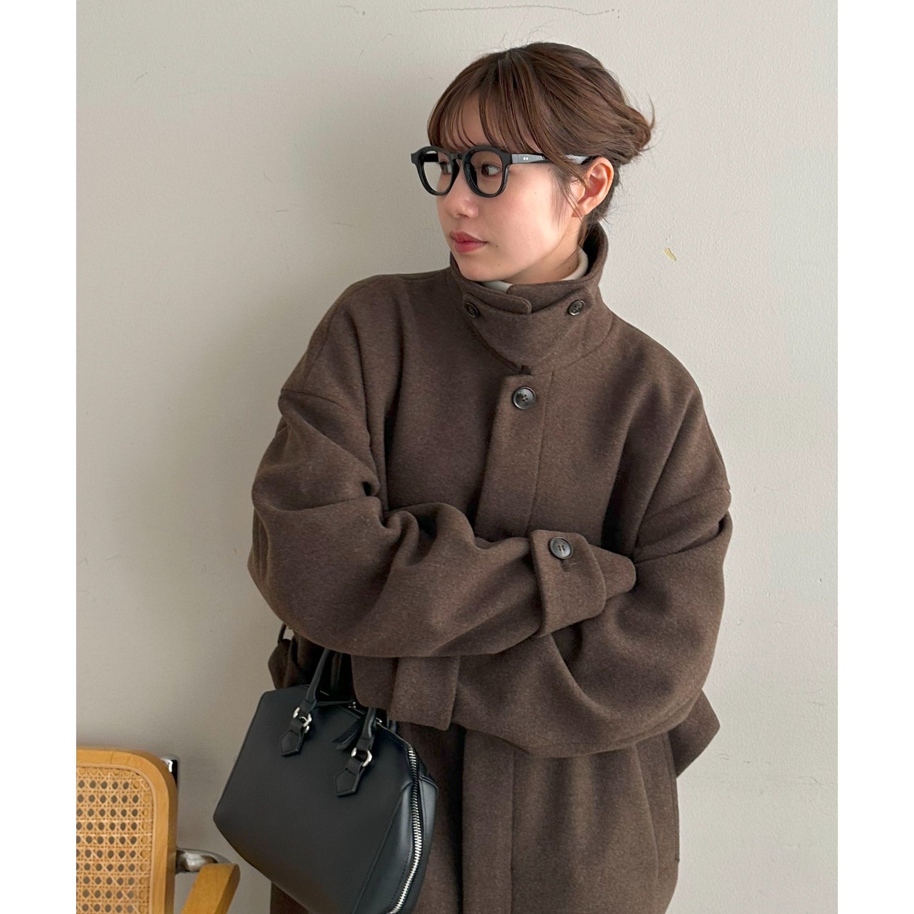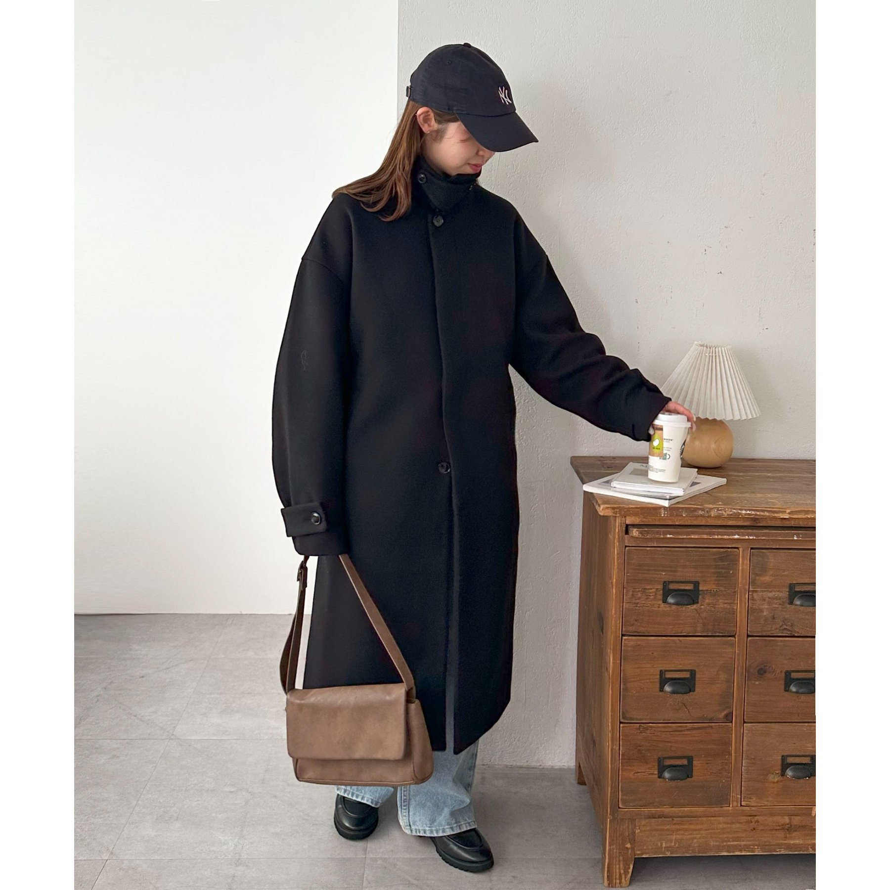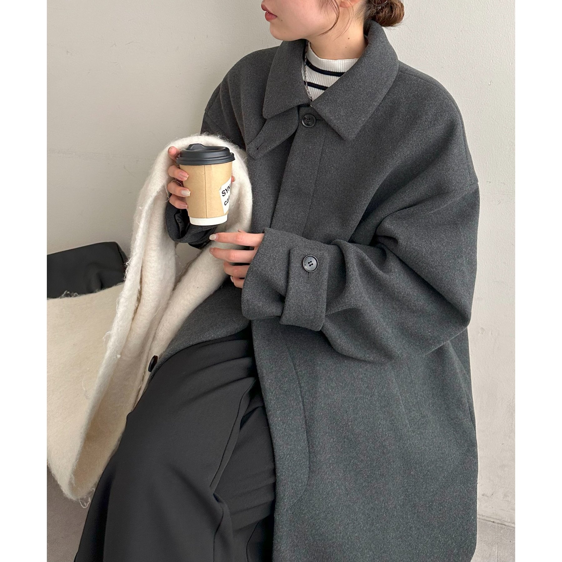 158cmレディーススタッフ(Mサイズ着用):身幅や腕回りがゆったりとしているので、ロングコートですがラフな印象もプラスしながら着ることができます。