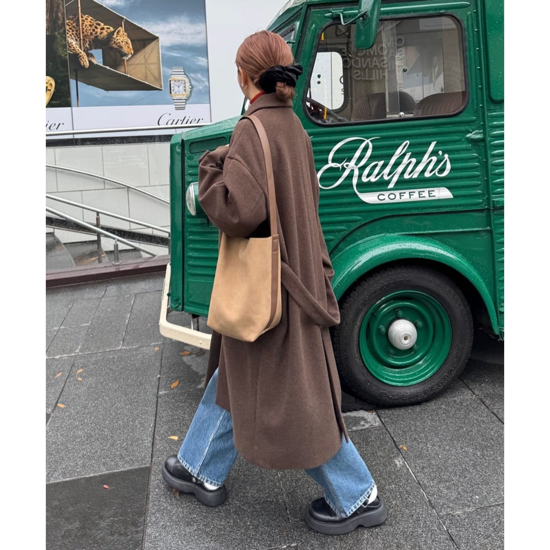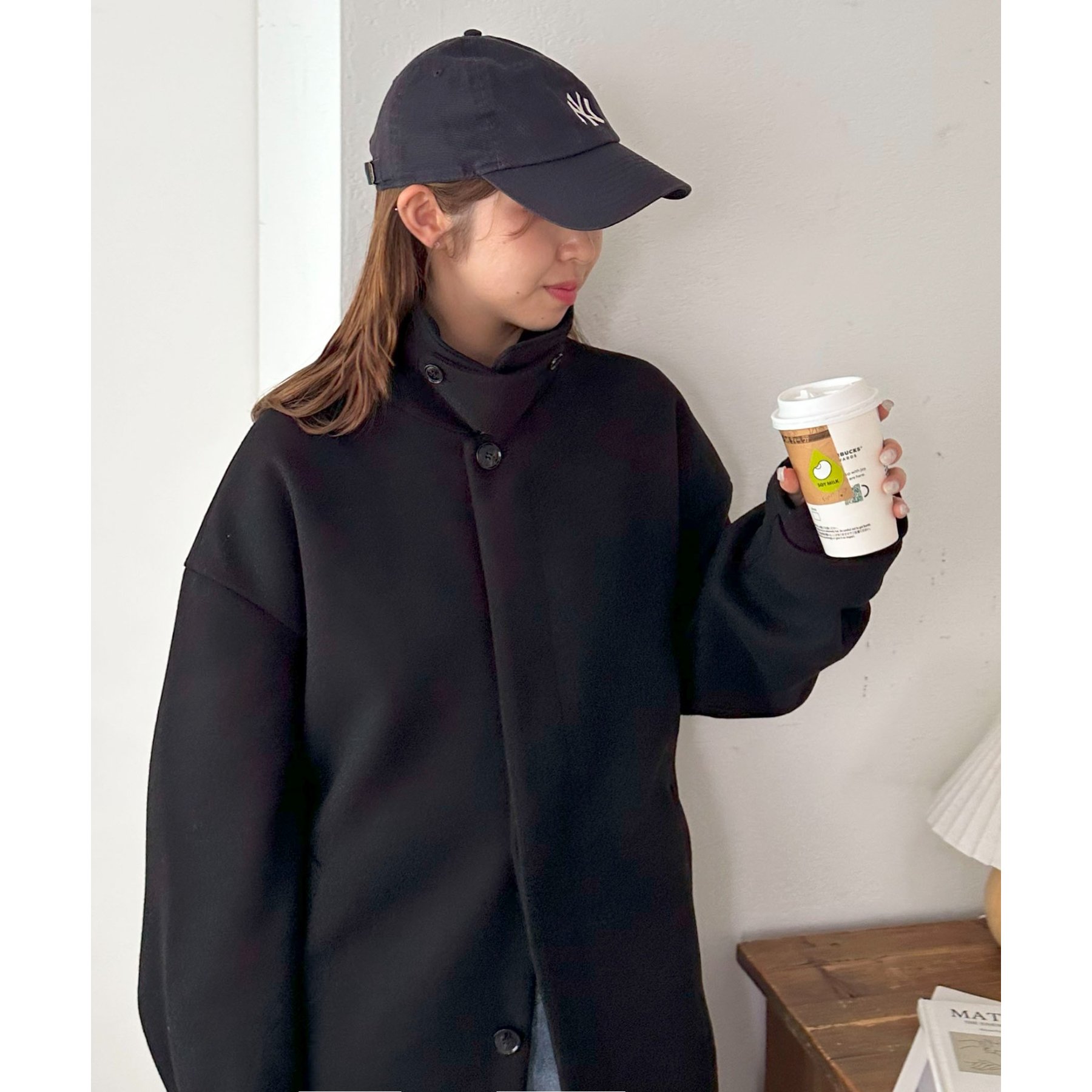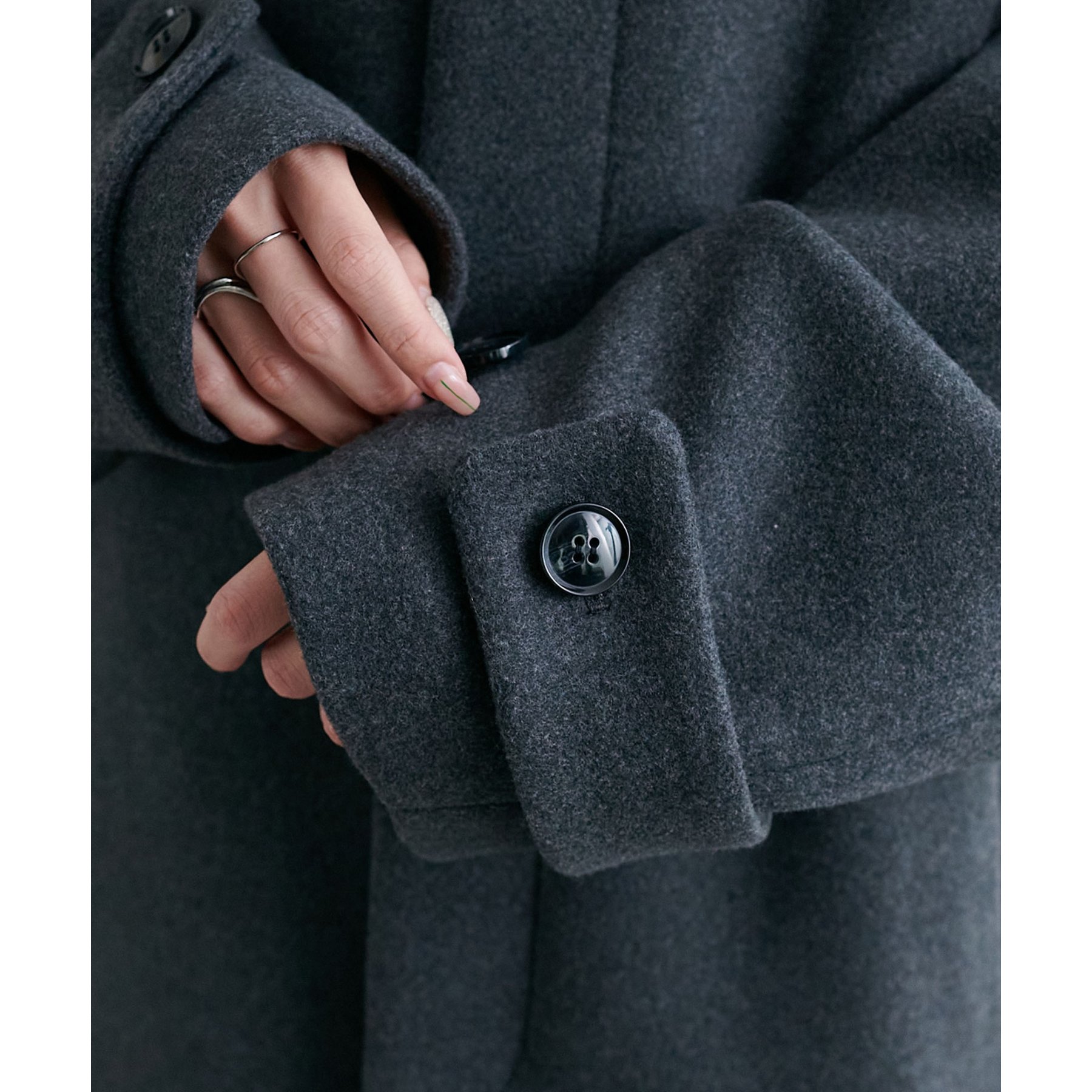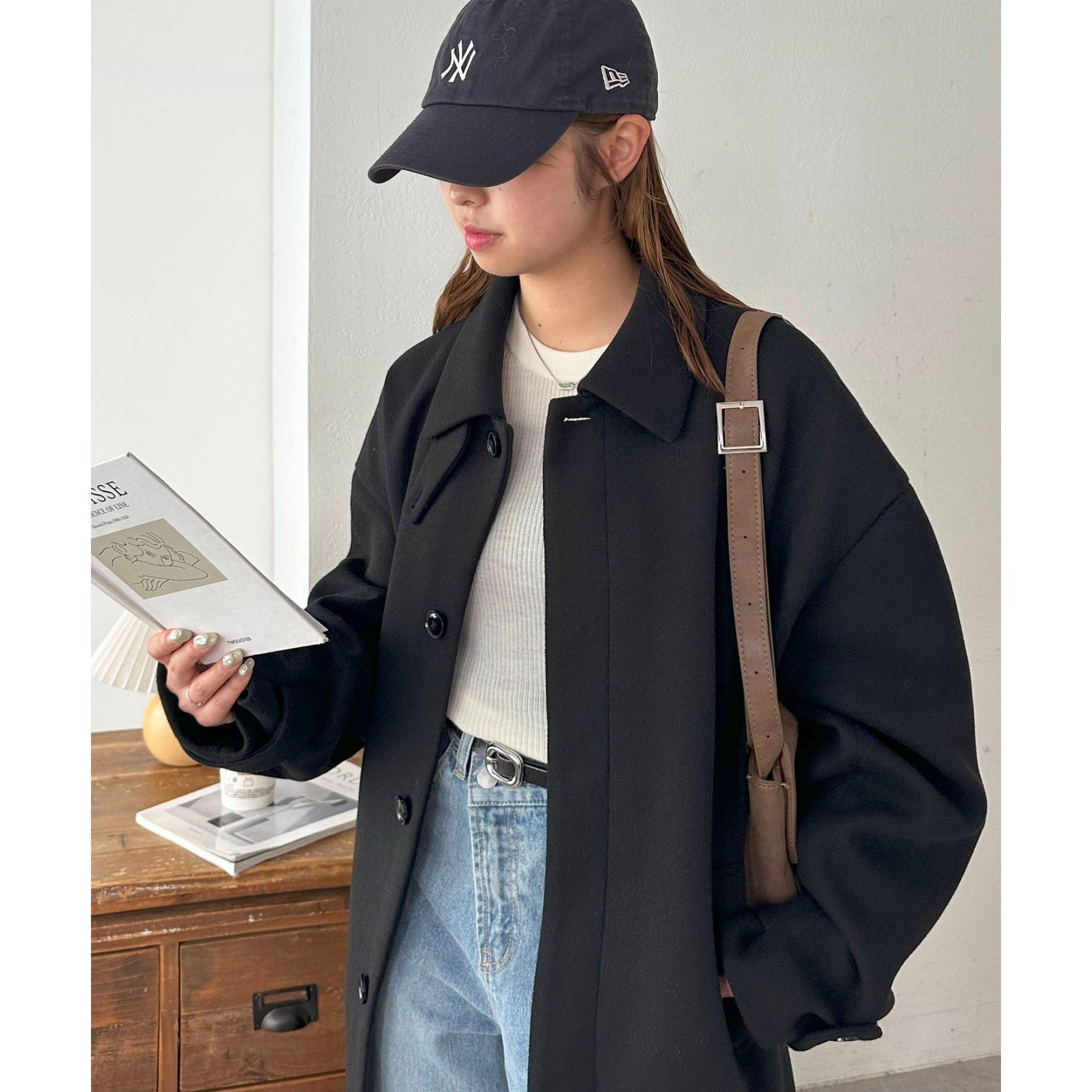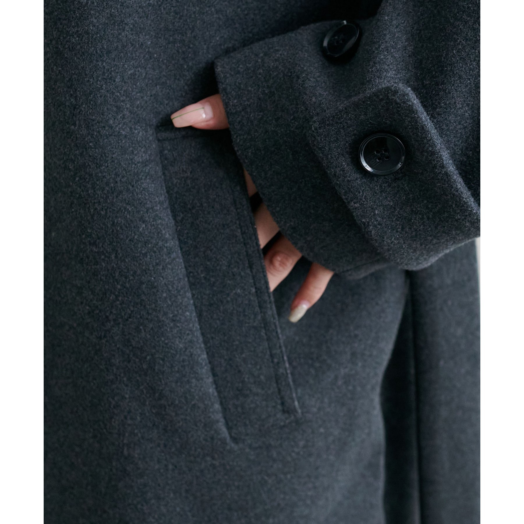 158cmレディーススタッフ(Mサイズ着用):身幅や腕回りがゆったりとしているので、ロングコートですがラフな印象もプラスしながら着ることができます。