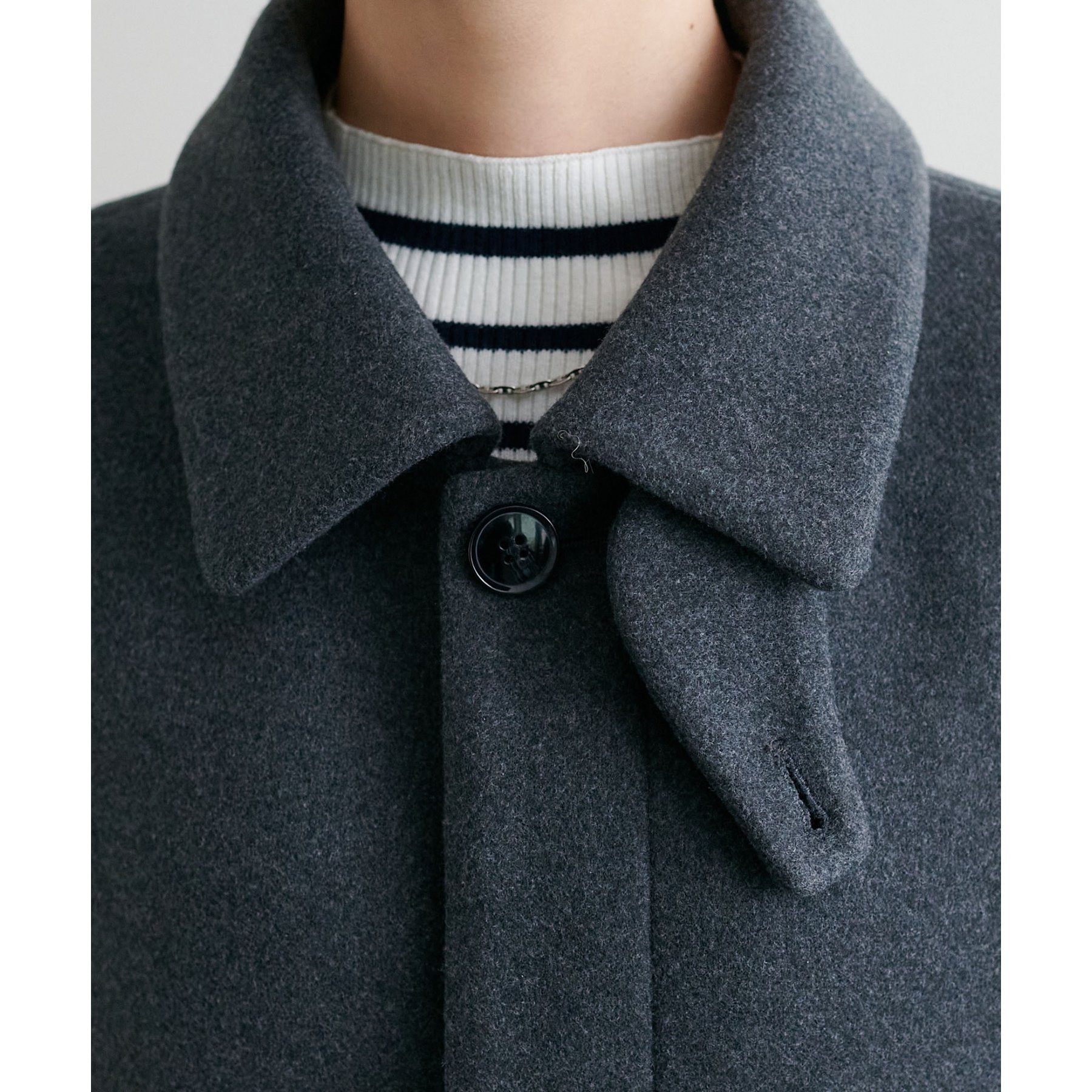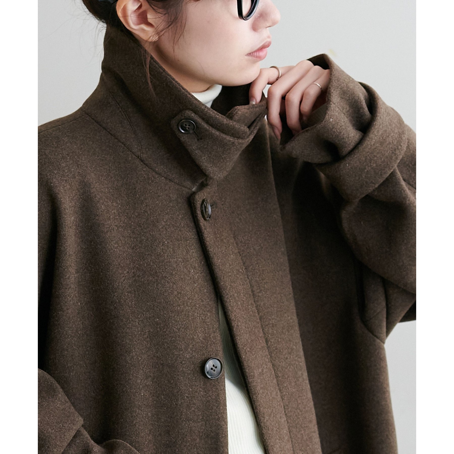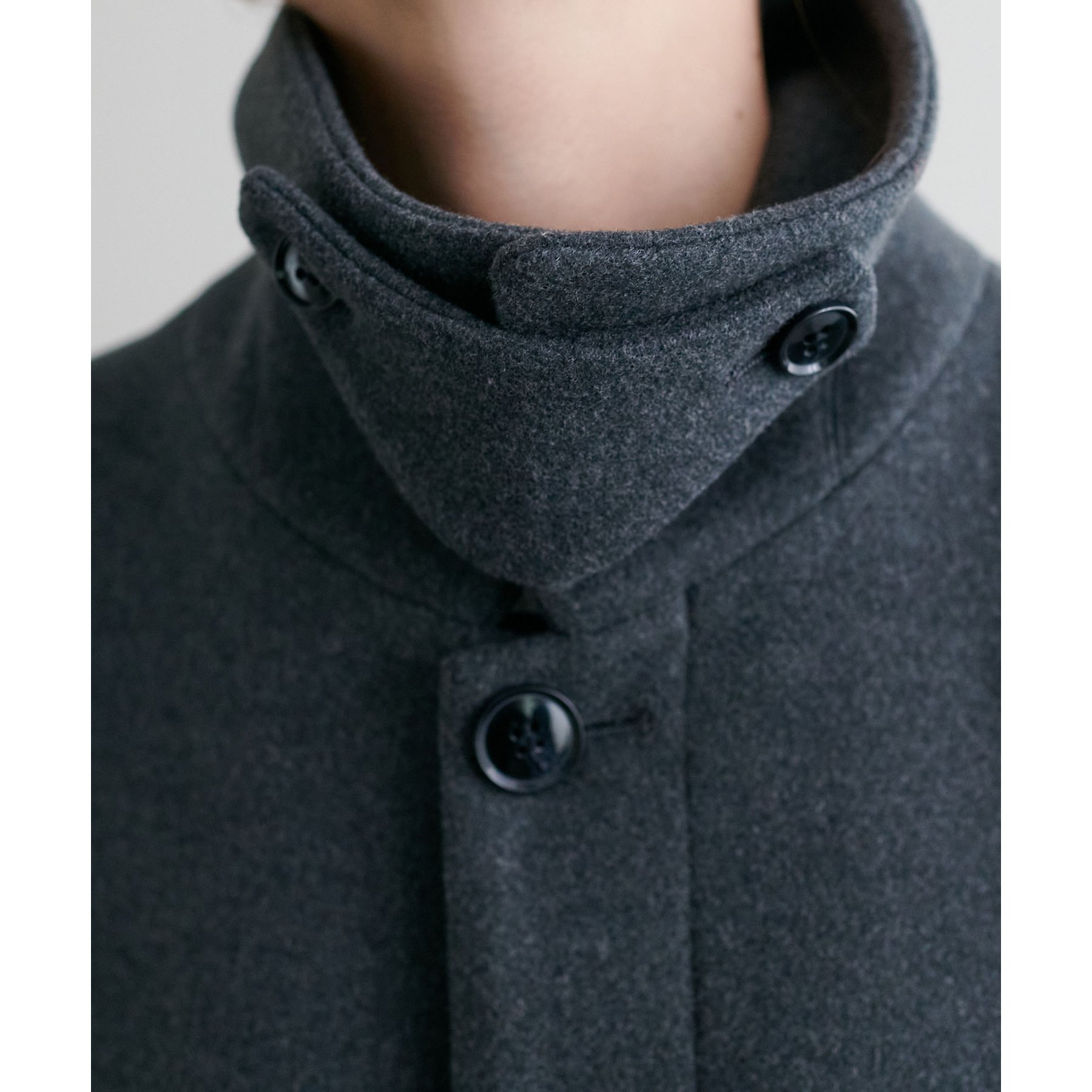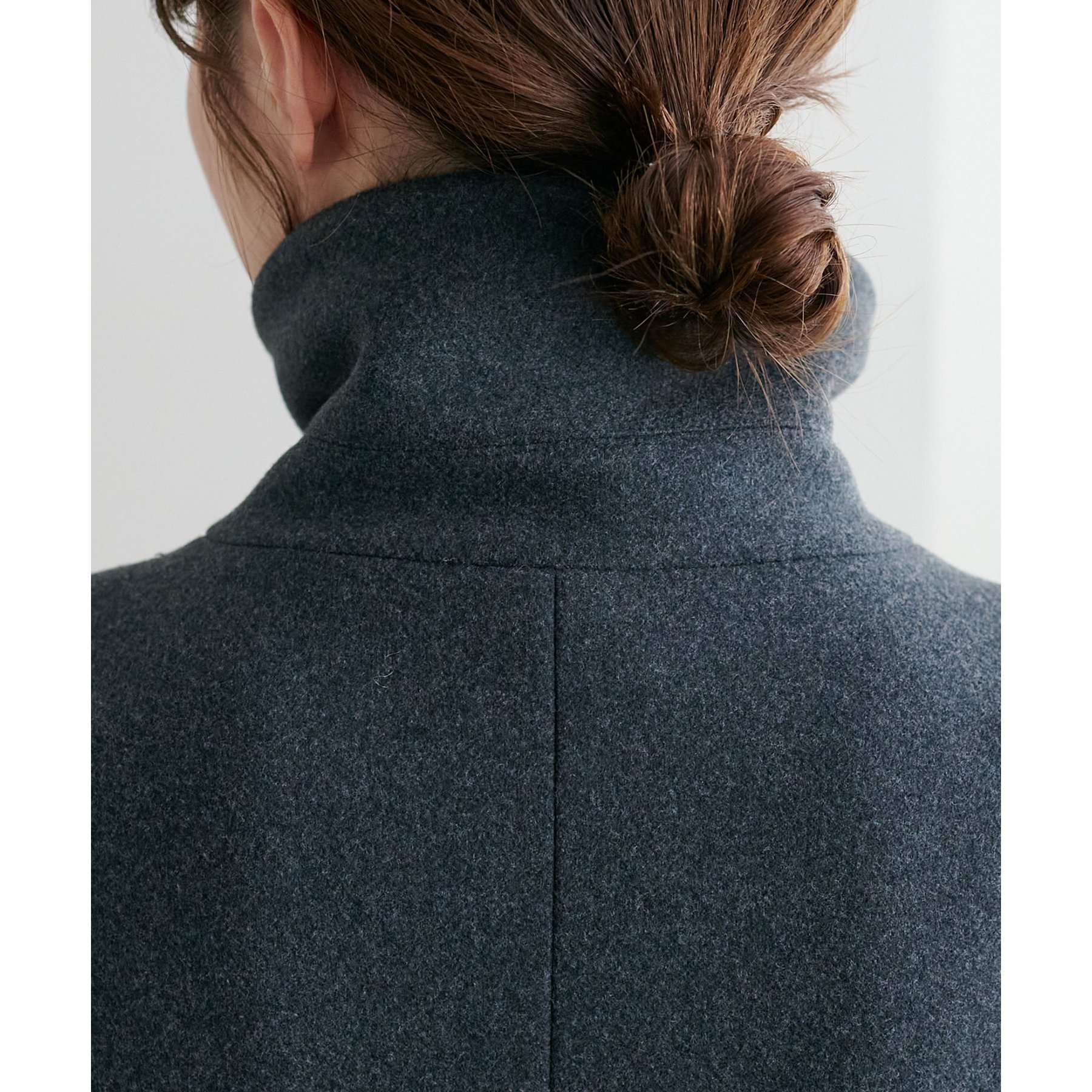 スタンドカラーにもできるので、マフラーが無くても顔回りも暖かく着ていただけます。