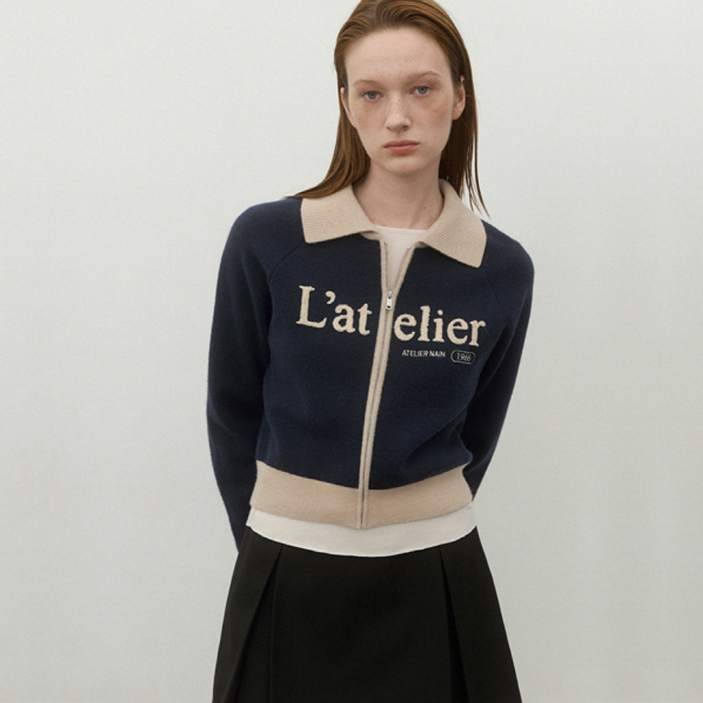 프런트에 배색 레터링 자수가 포인트로 들어간 카라 집업 니트 가디건 입니다.