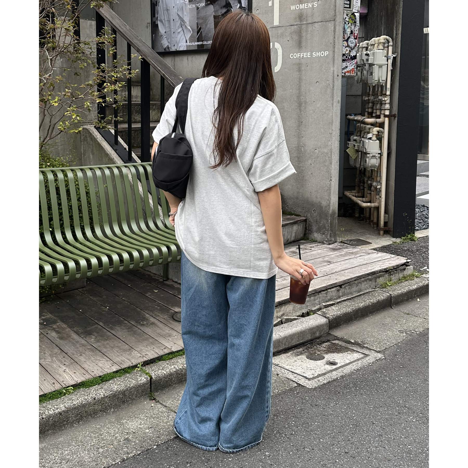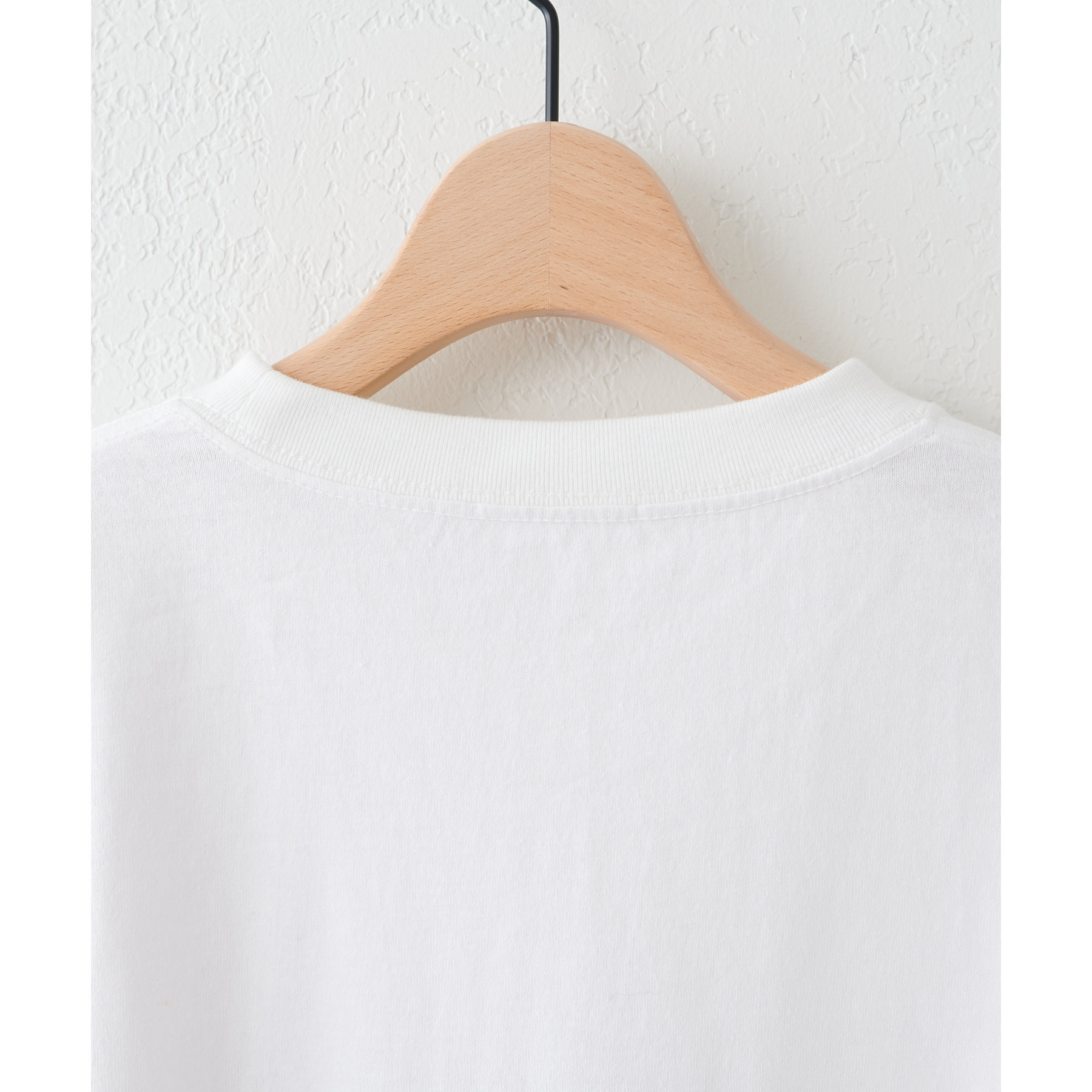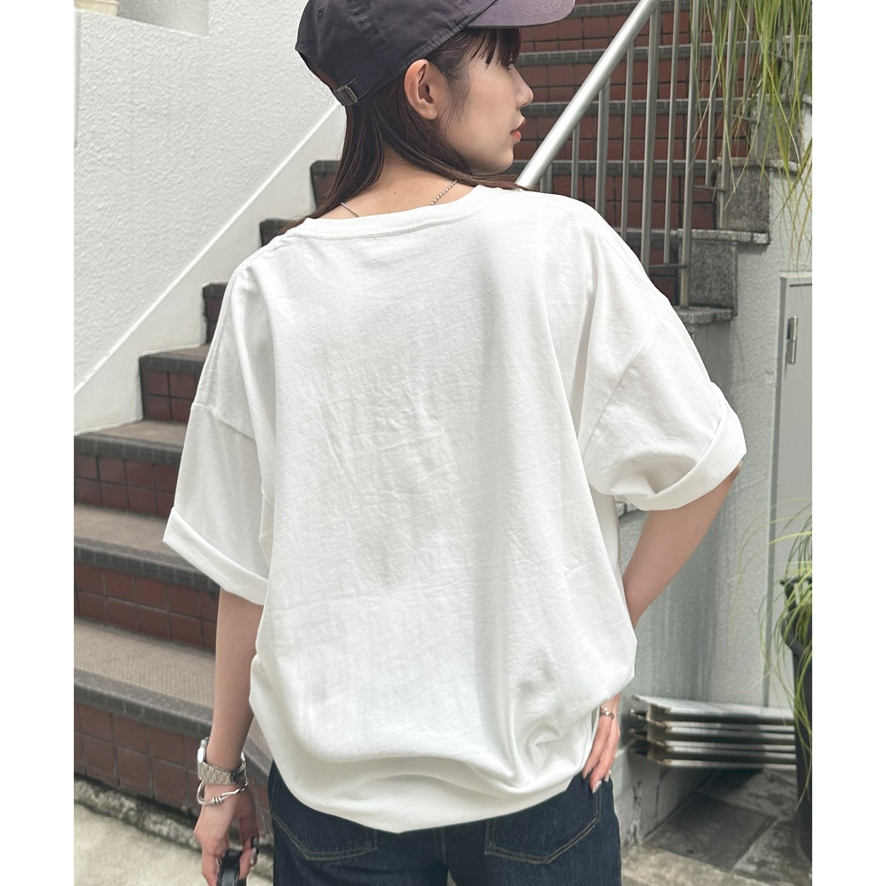 ゆったりとしたシルエットでリラックス感のある仕上がりに。デザインが高めの位置に施されているので、インしても隠れることなく綺麗に着こなせるのもポイントです◎