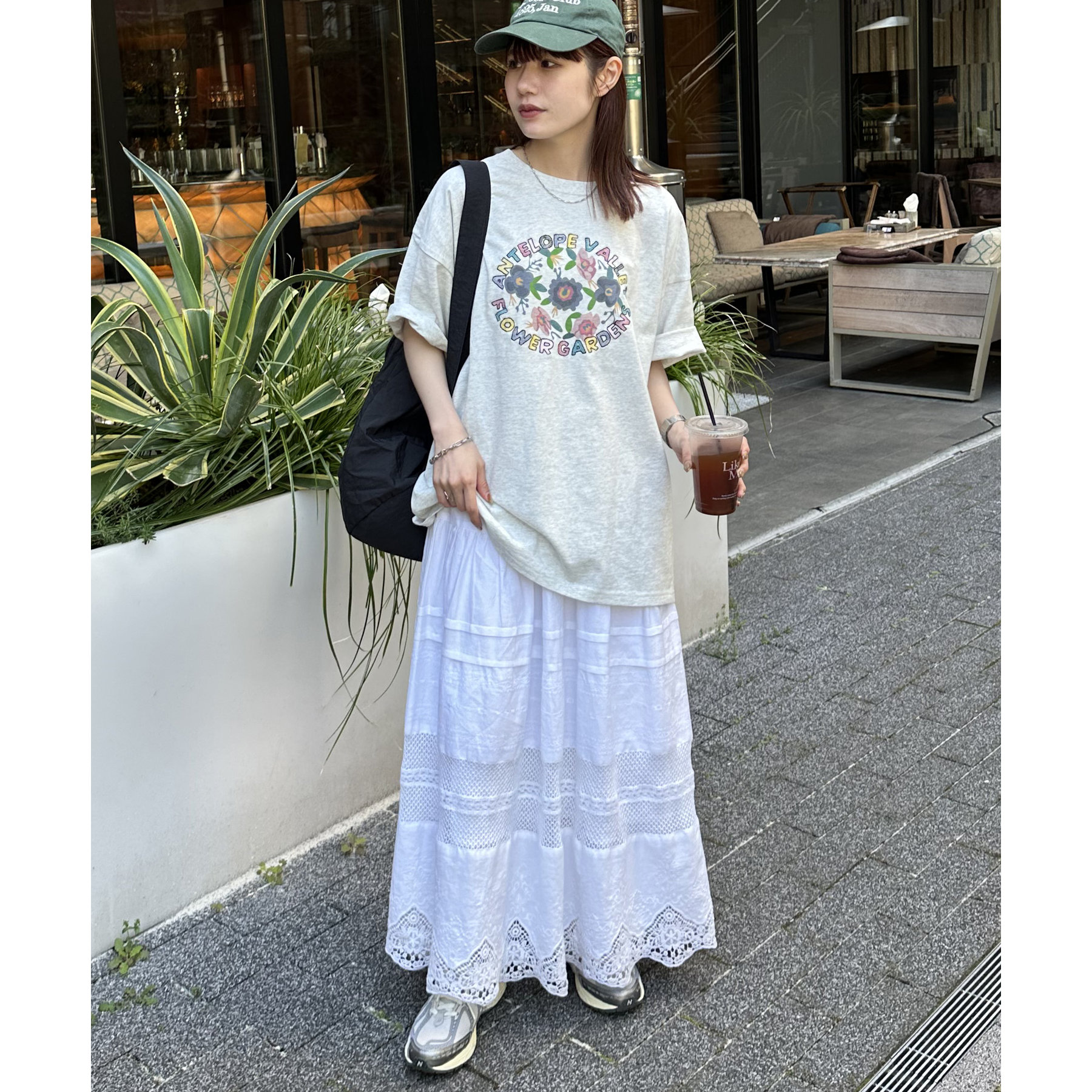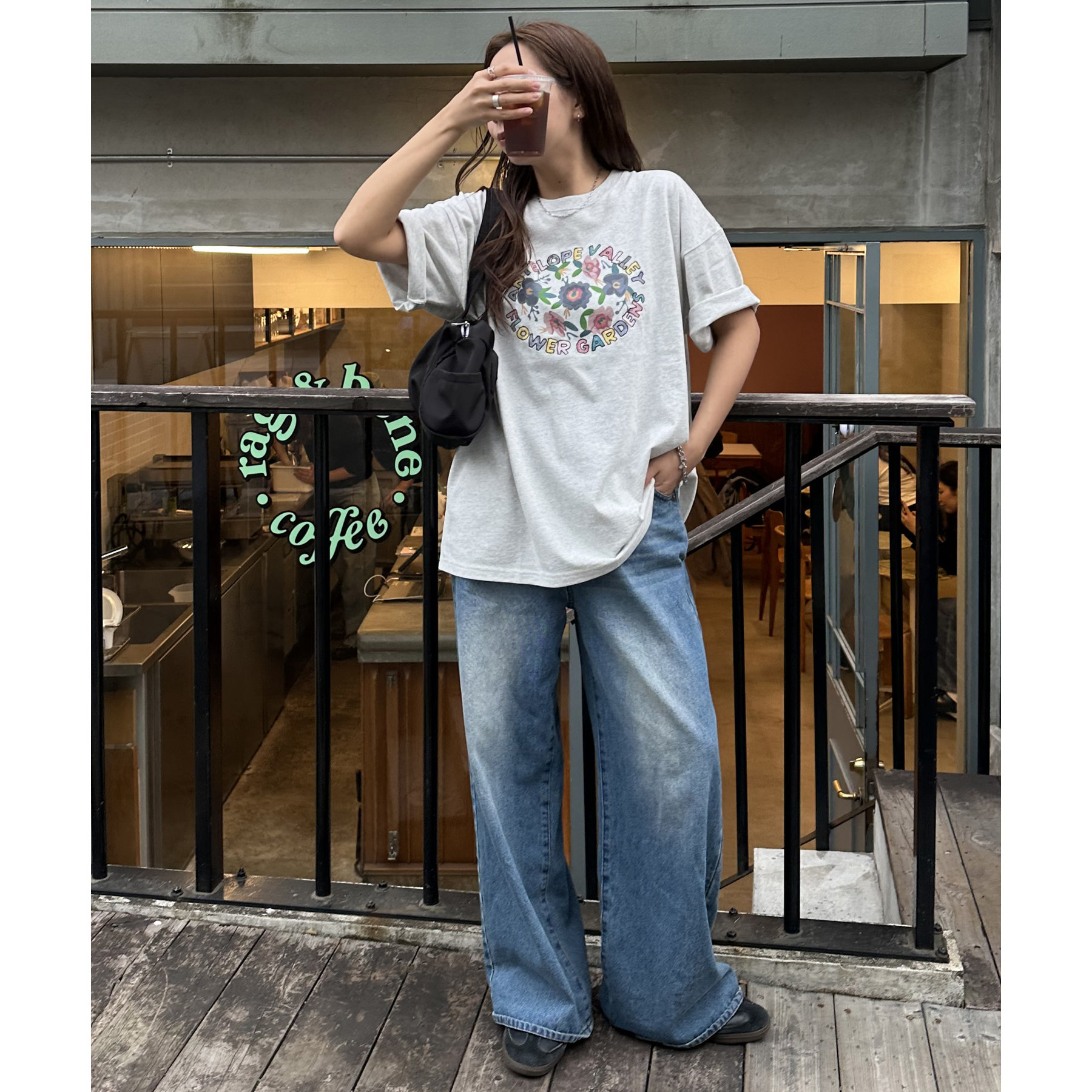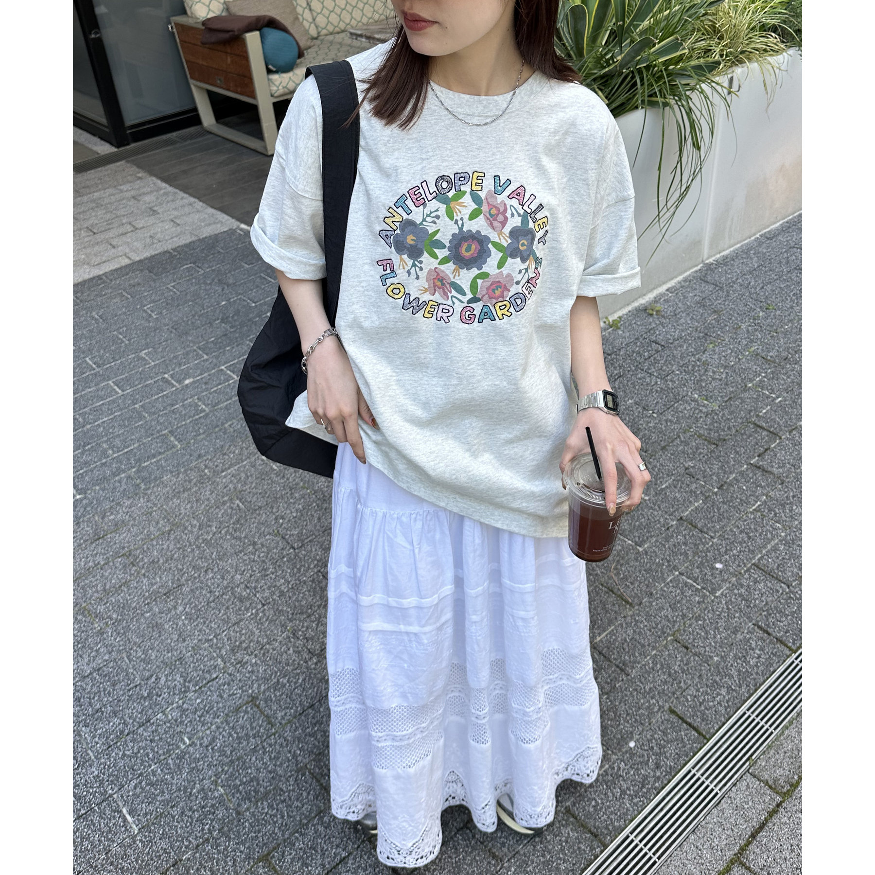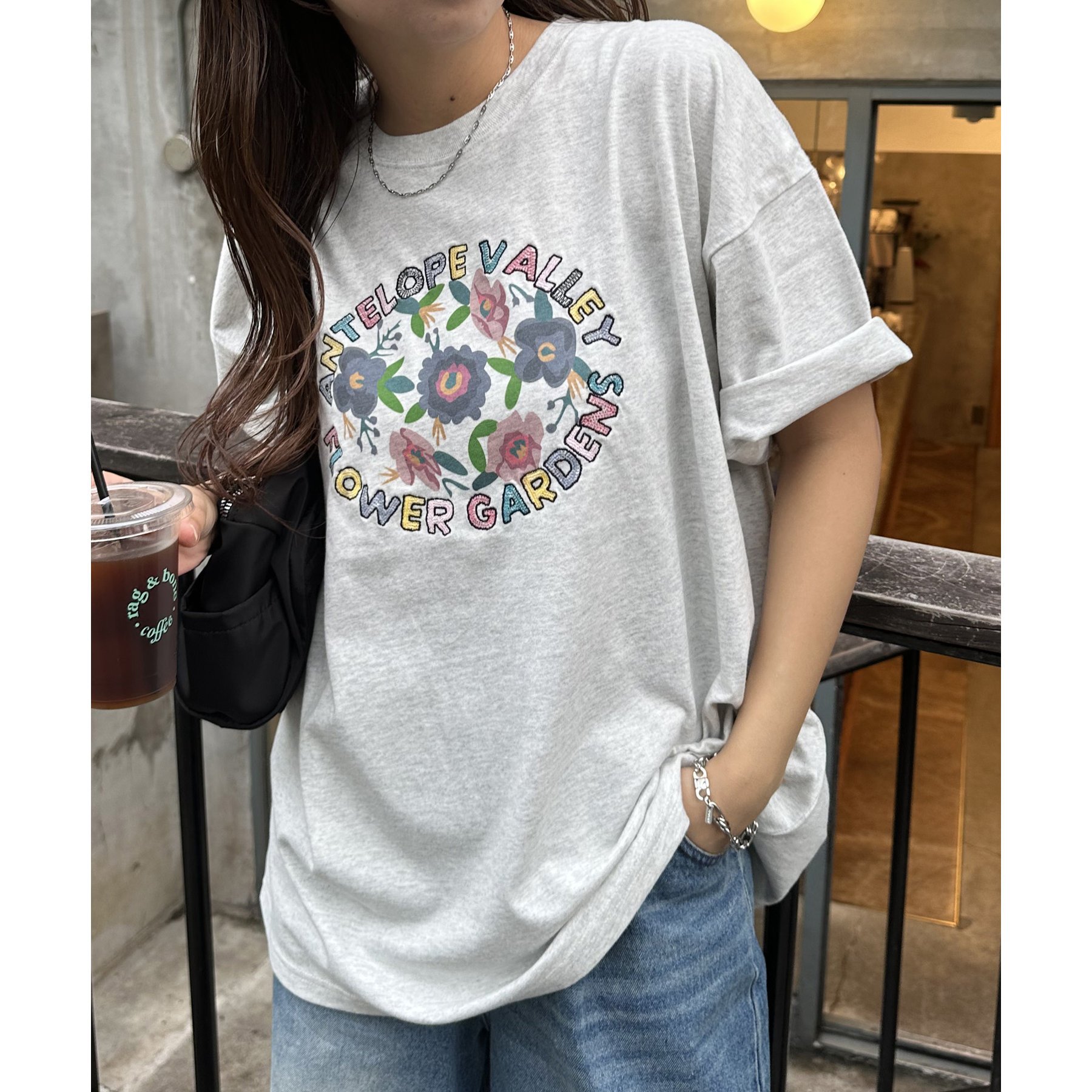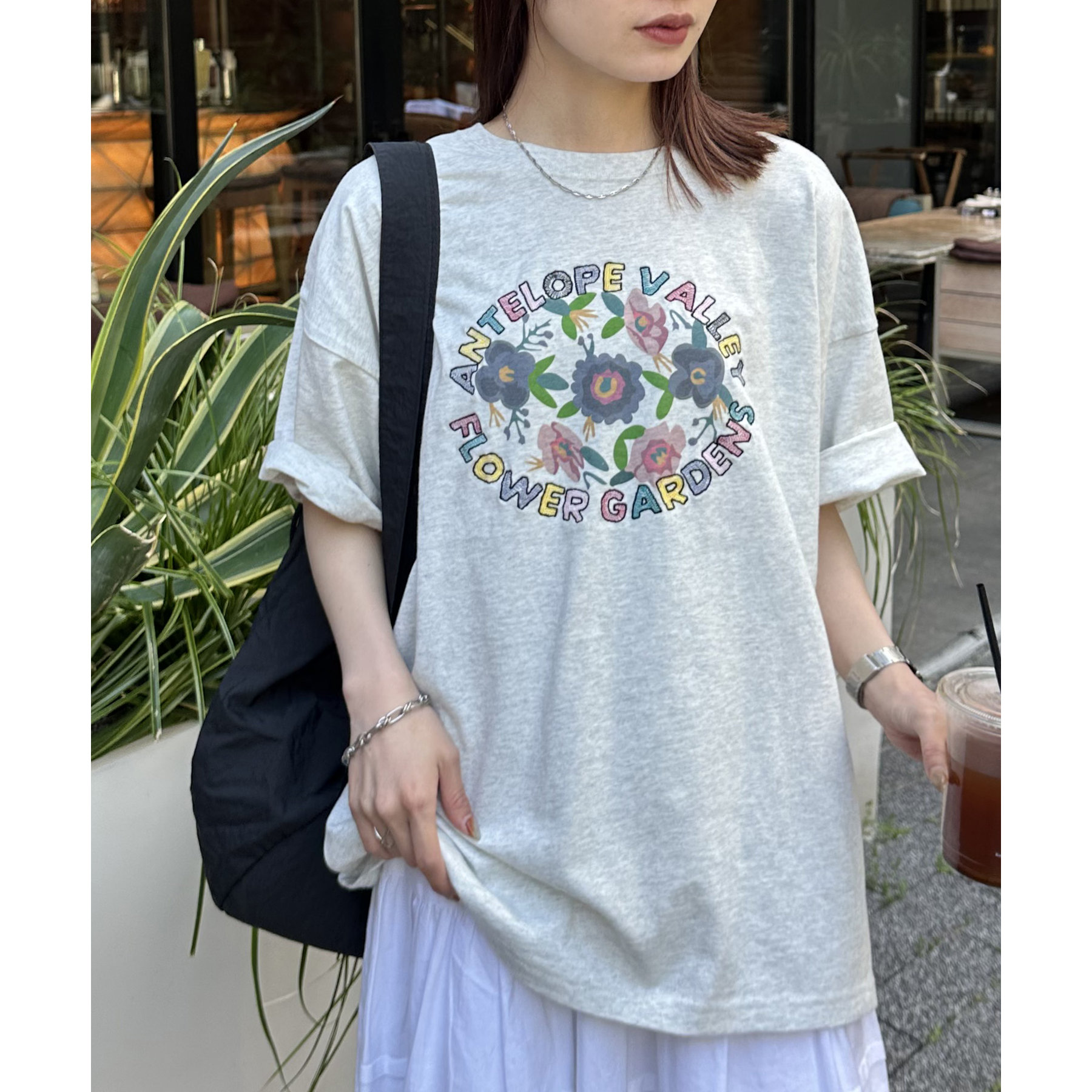 158cmレディーススタッフ:手書き風のフラワーモチーフが可愛い一枚です。袖をロールアップして、こなれ感を演出したり、アクセサリーをプラスして、自分らしいアレンジを楽しめます♩