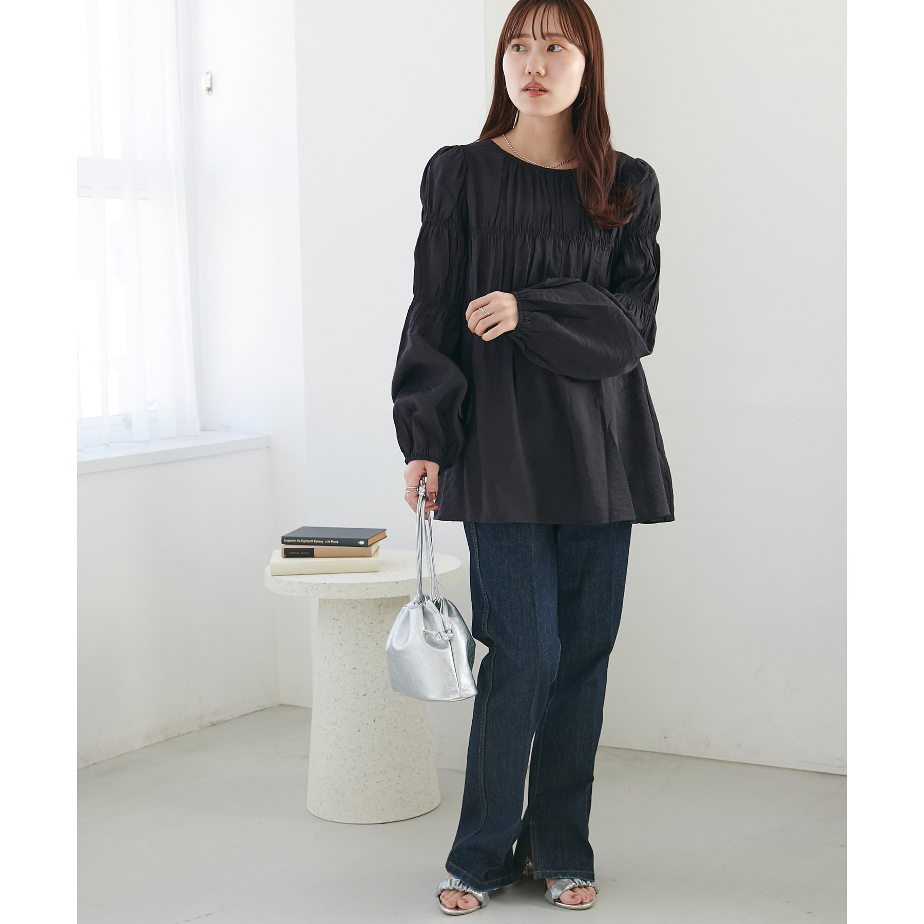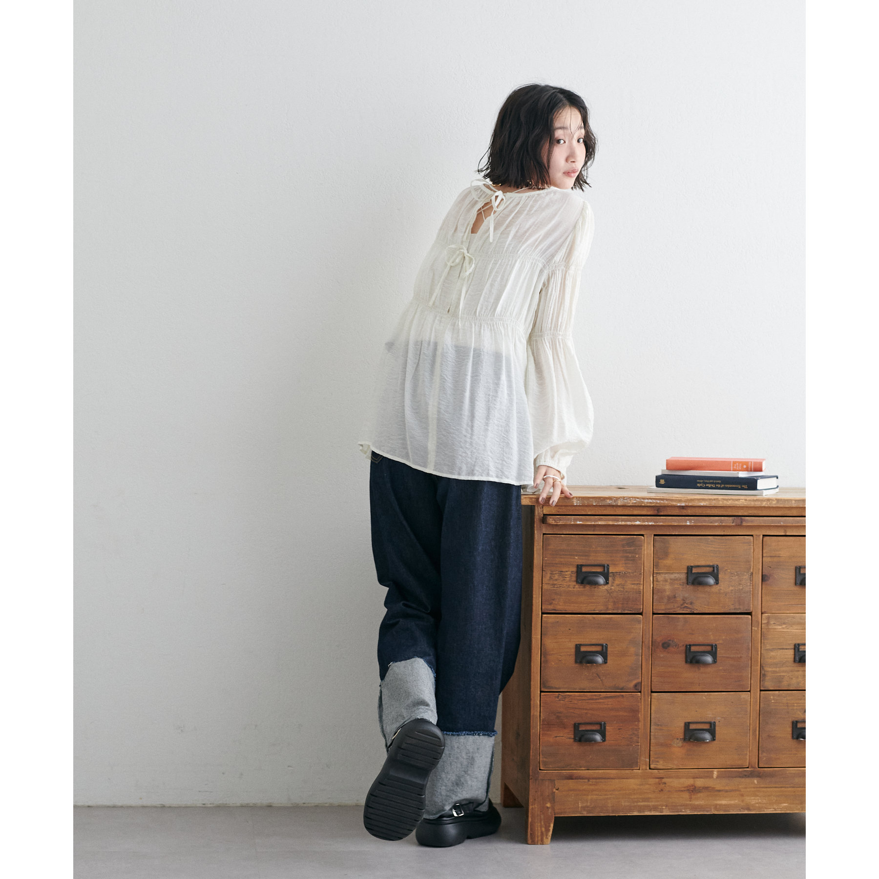 ・ふんわりシルエットのトップスで細身ボトムと好相性