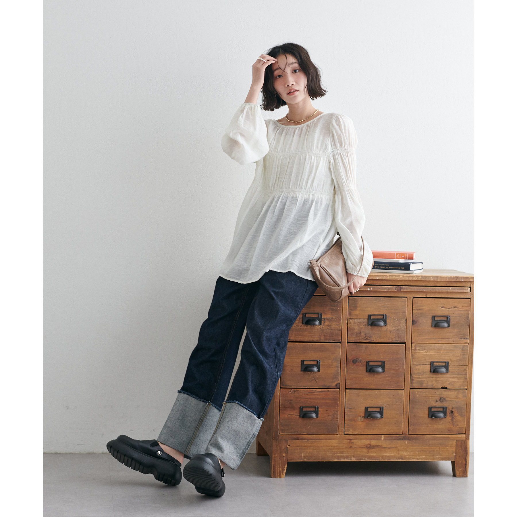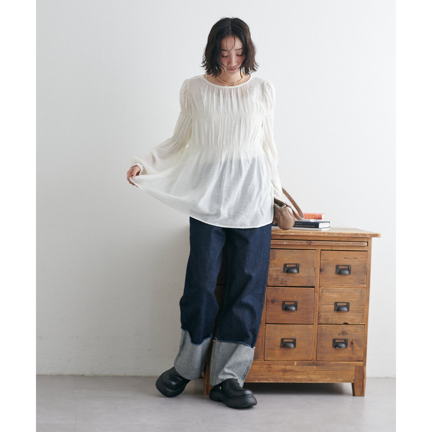 160cmスタッフ:タックパンツと合わせてきれいめにも、デニムでナチュラルにもコーデできるので、オンオフどちらにも使えます!