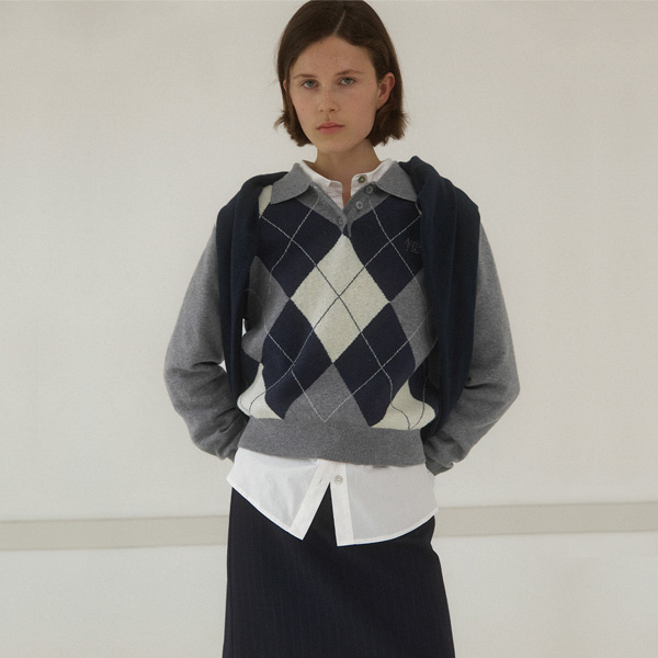 アーガイル柄のジャカードで仕上げたクラシックなニットトップです。
