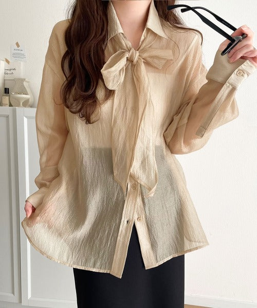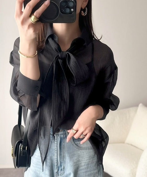 春夏の優雅さを纏う、シアー感が魅力のリボンタイシャツ!