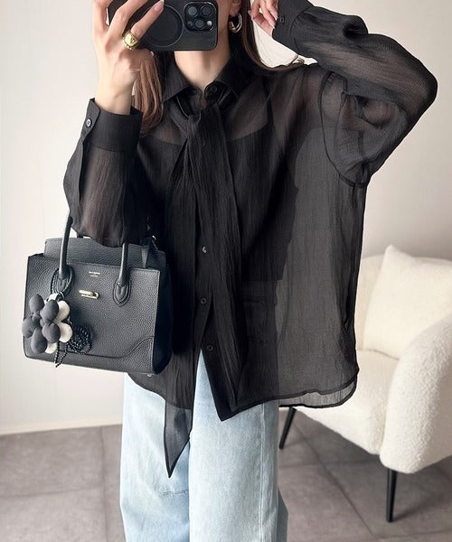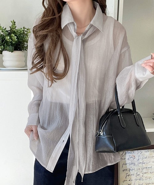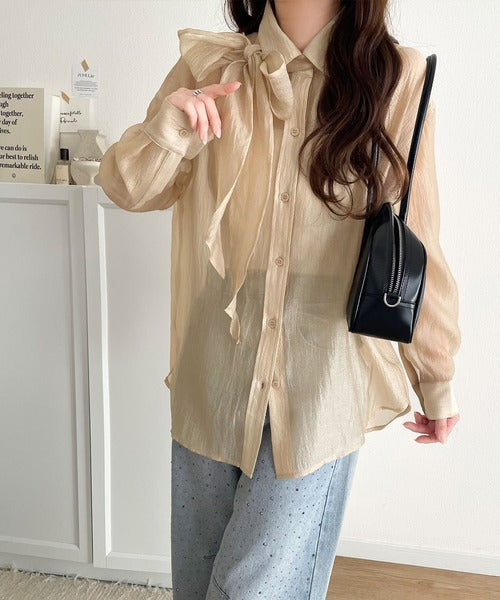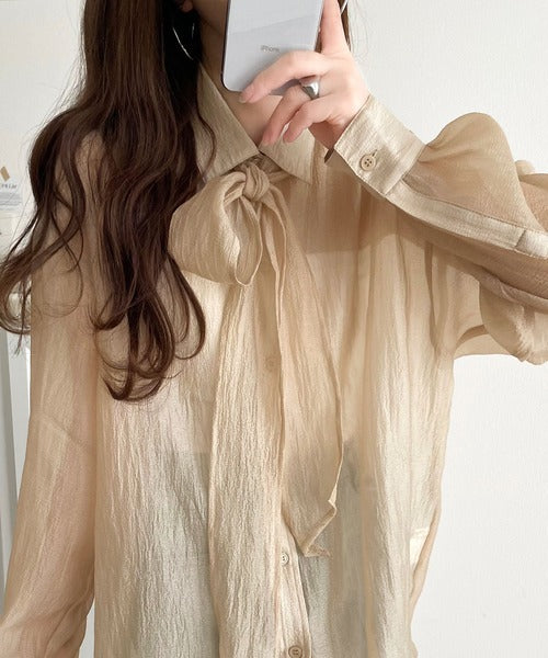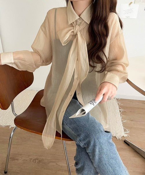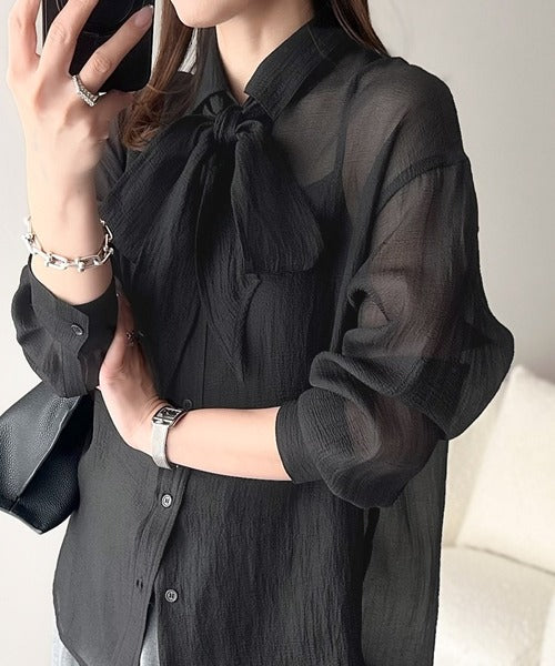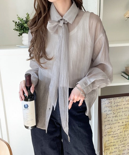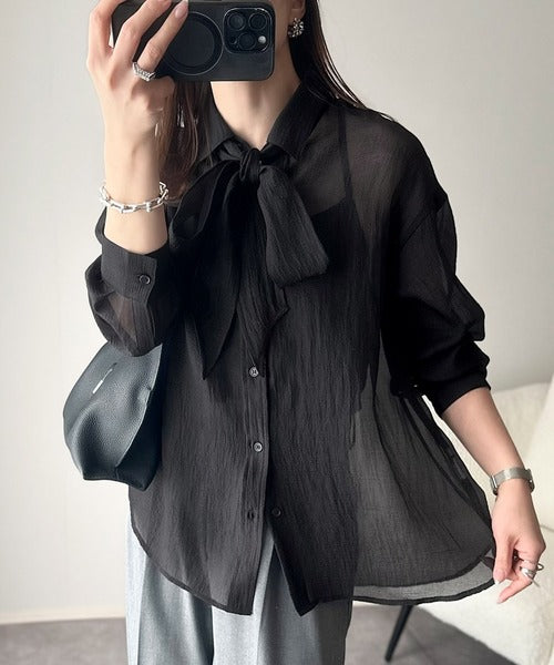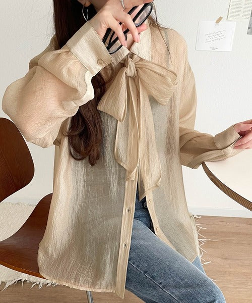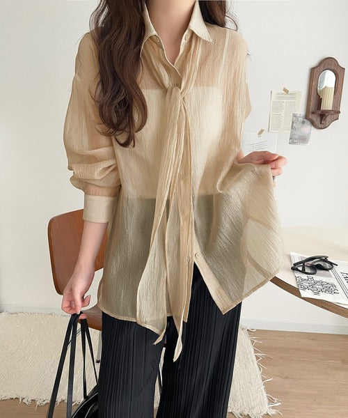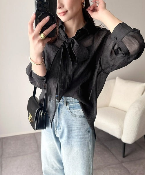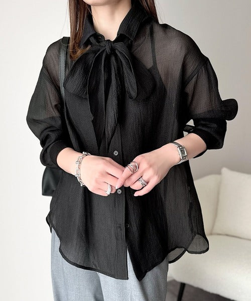 このリボンタイ付きシアーシャツは、まさに春夏を彩る一枚。