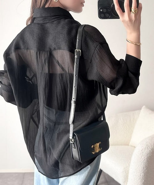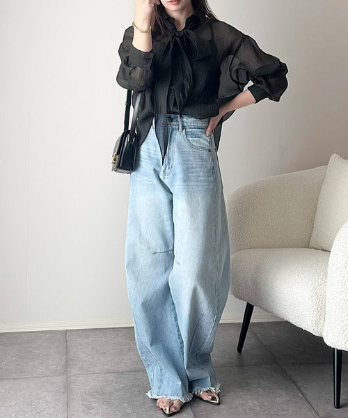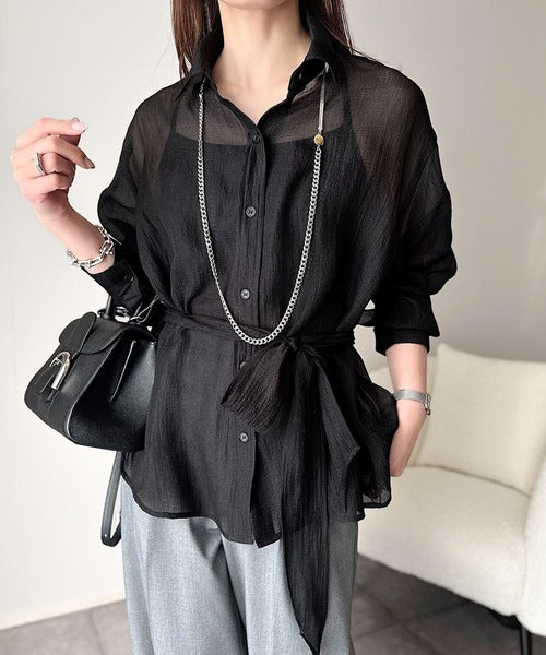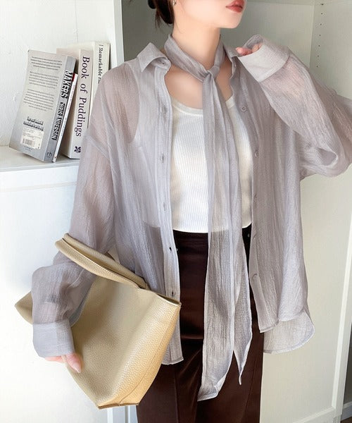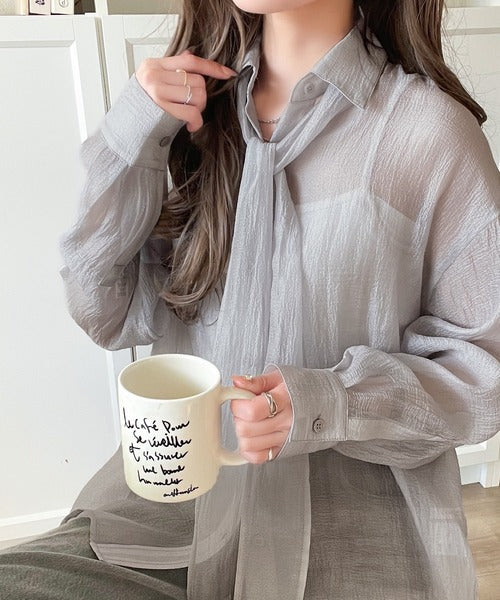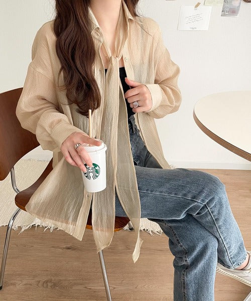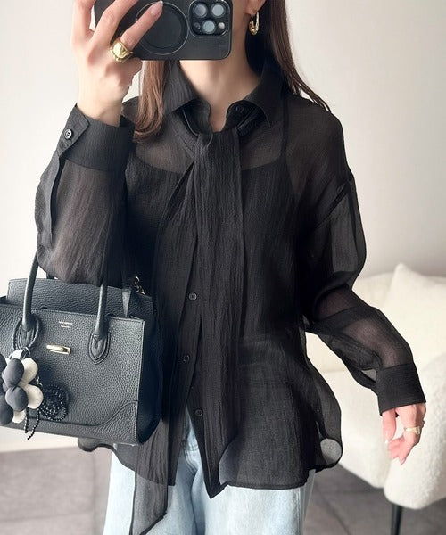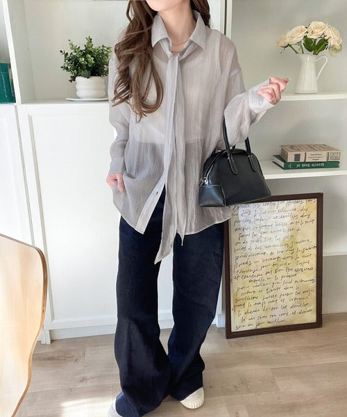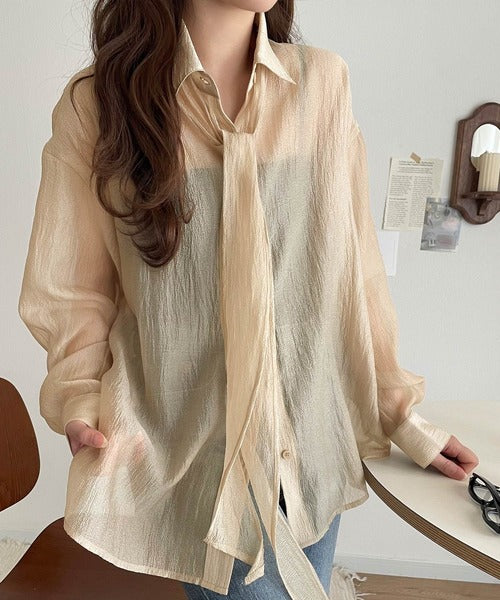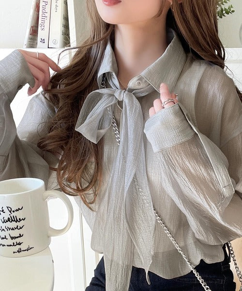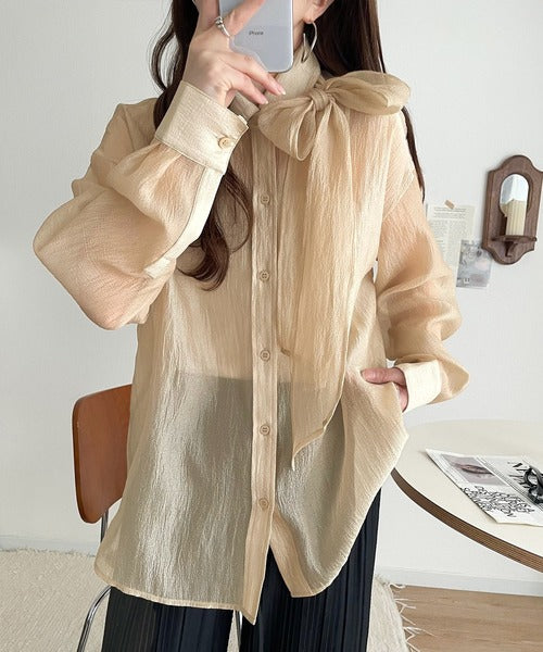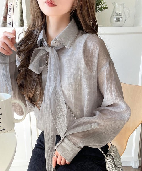 このリボンタイ付きシアーシャツは、まさに春夏を彩る一枚。