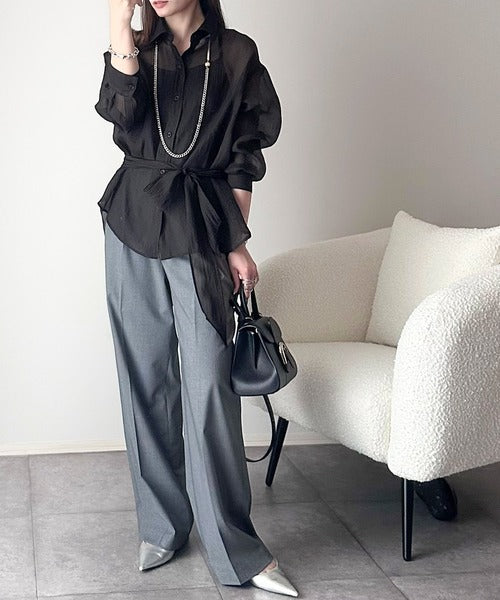 このリボンタイ付きシアーシャツは、カジュアルにもエレガントにもスタイリングが楽しめる優れもの♪