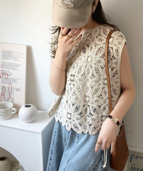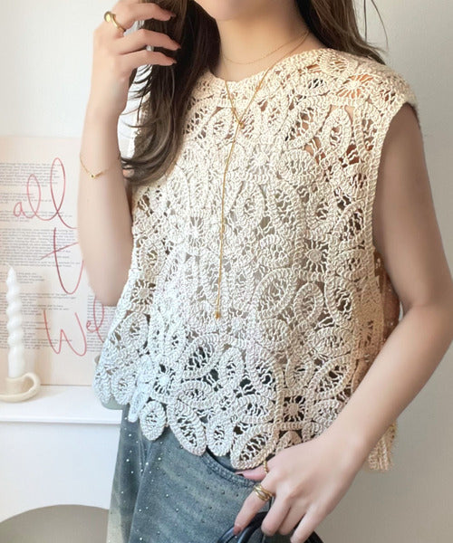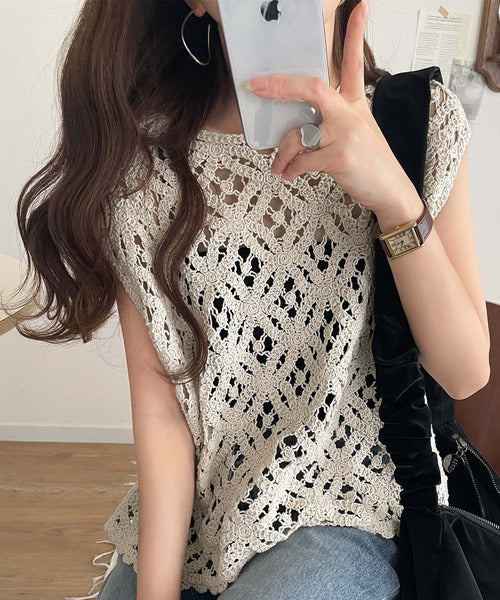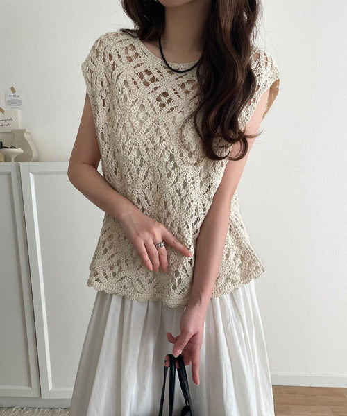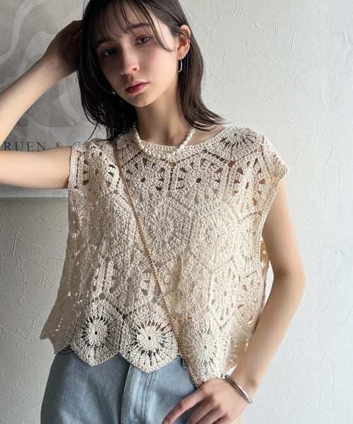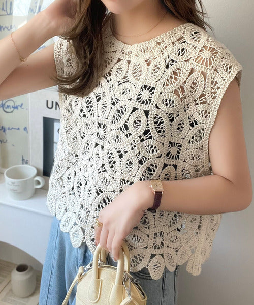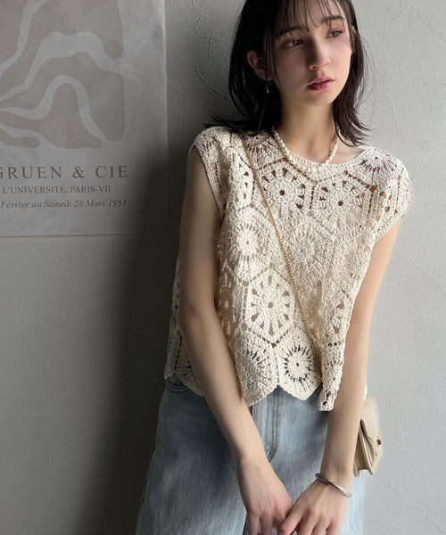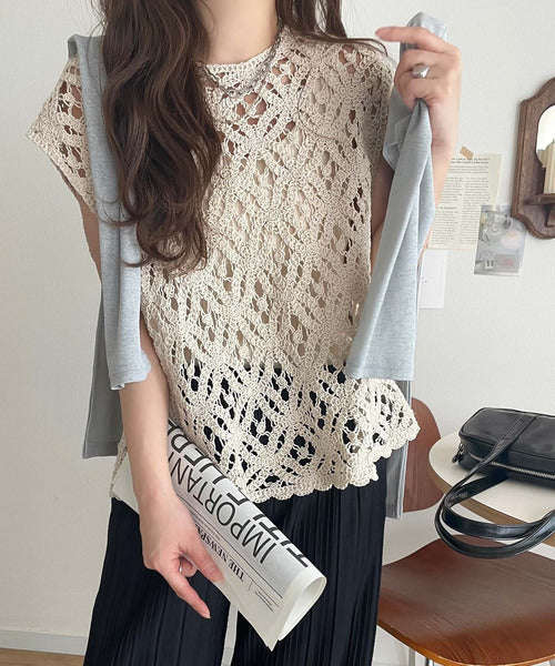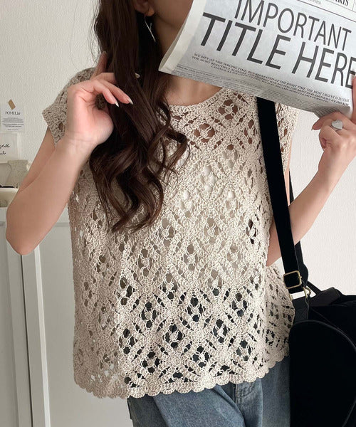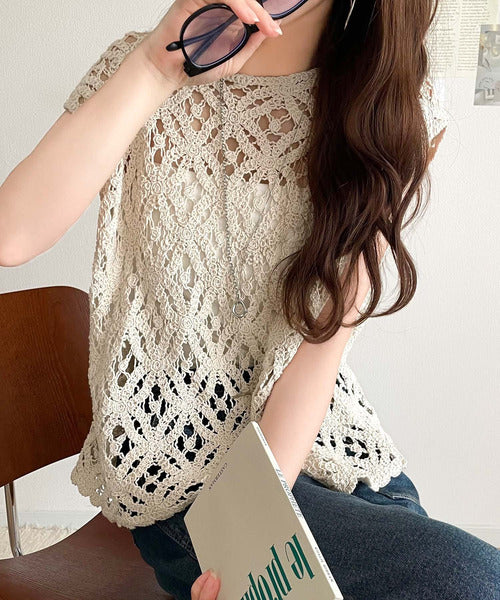 レトロ感漂うトレンド♪前後2WAYクロシェレースフレンチスリーブカットソー ce1110114