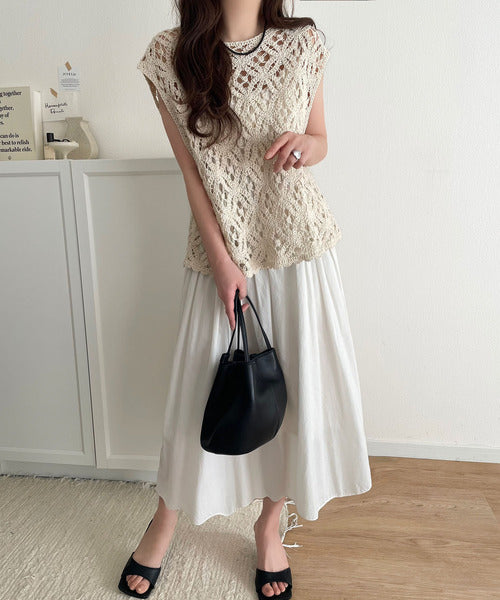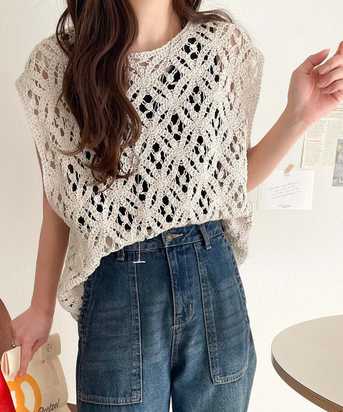 このアイテムは、見え過ぎない程よい透け感の編みデザインが