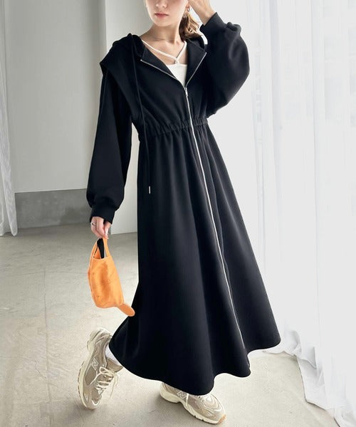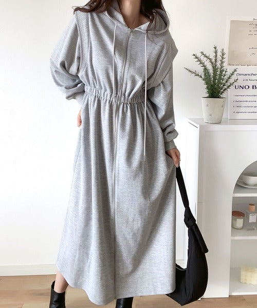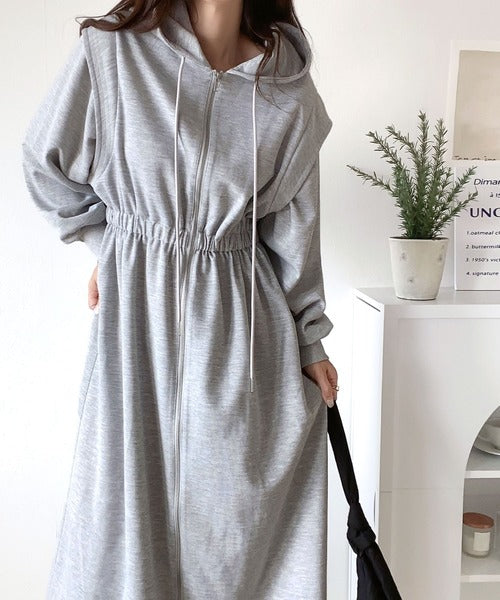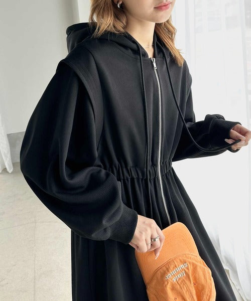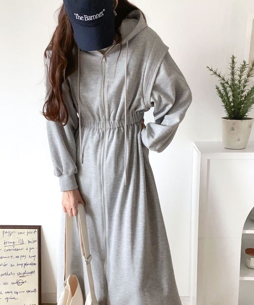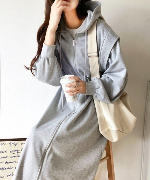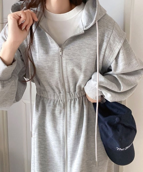 ワンピースとして着用して、ゆるっと羽織って、気軽にこなれ感を演出できる2wayのジップパーカーワンピ。