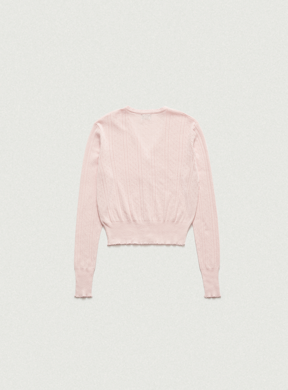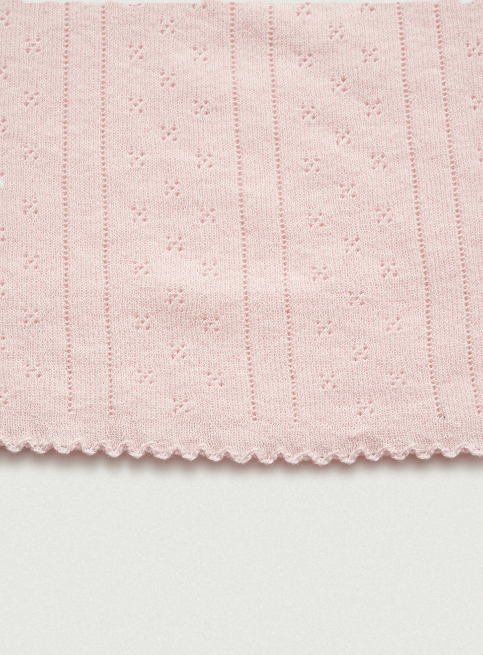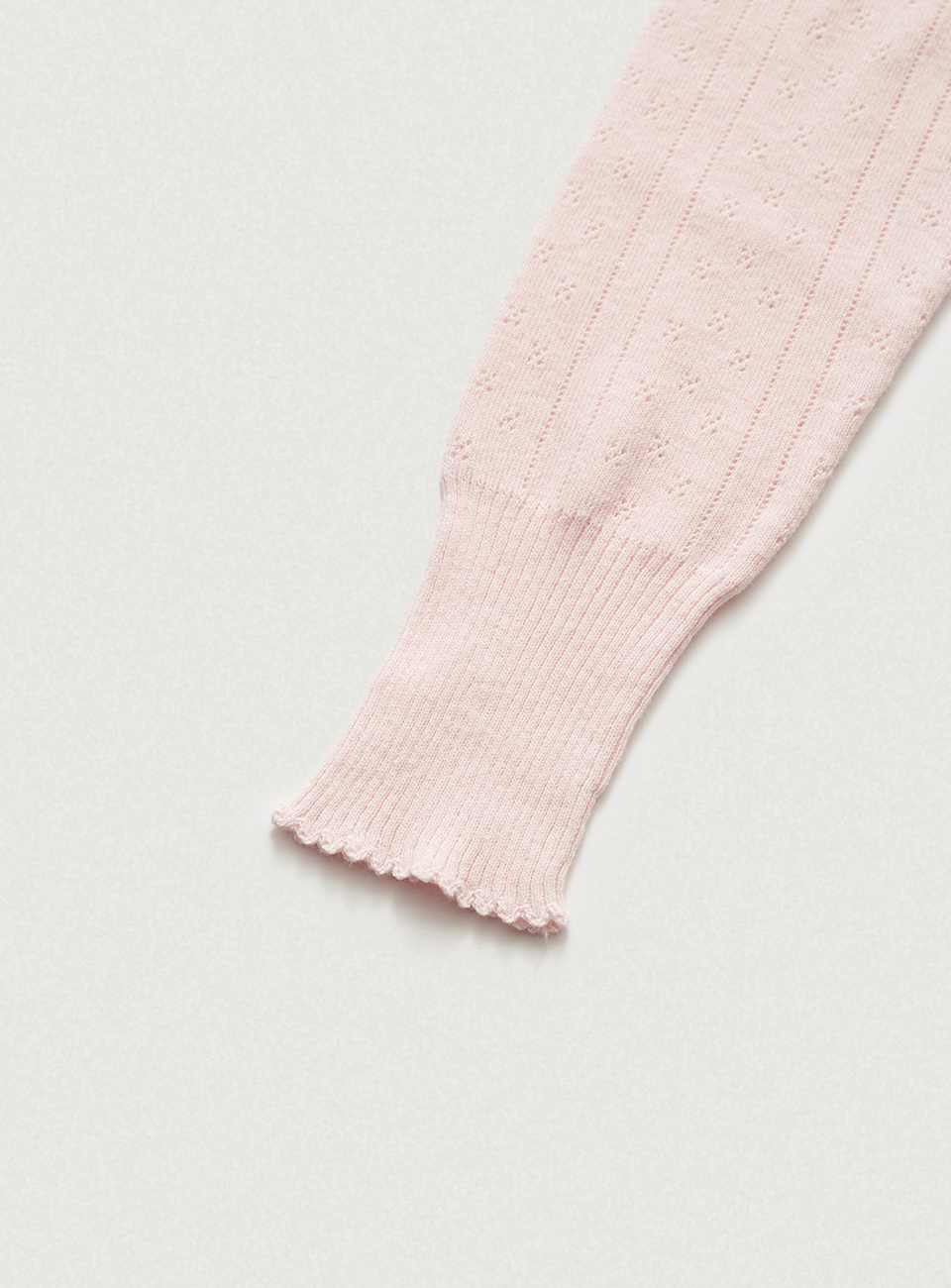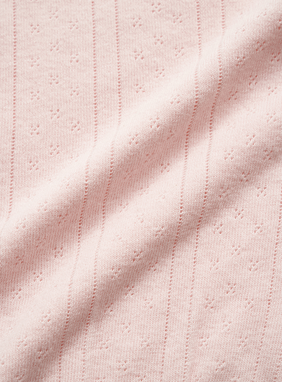 ほんのりとしたライトピンクカラーと、ポワンテル編み、なめらかなテクスチャーが際立つコットンニット