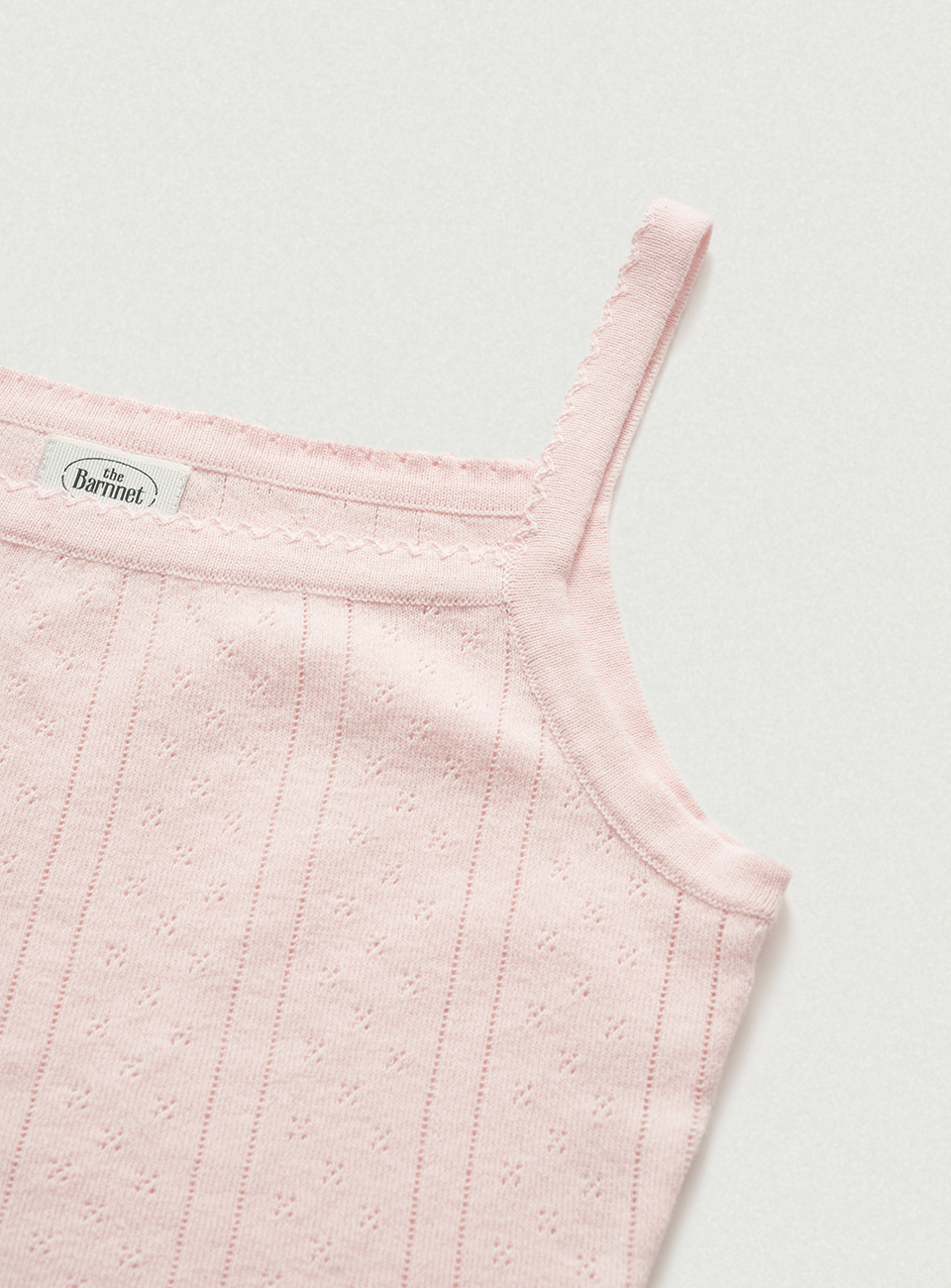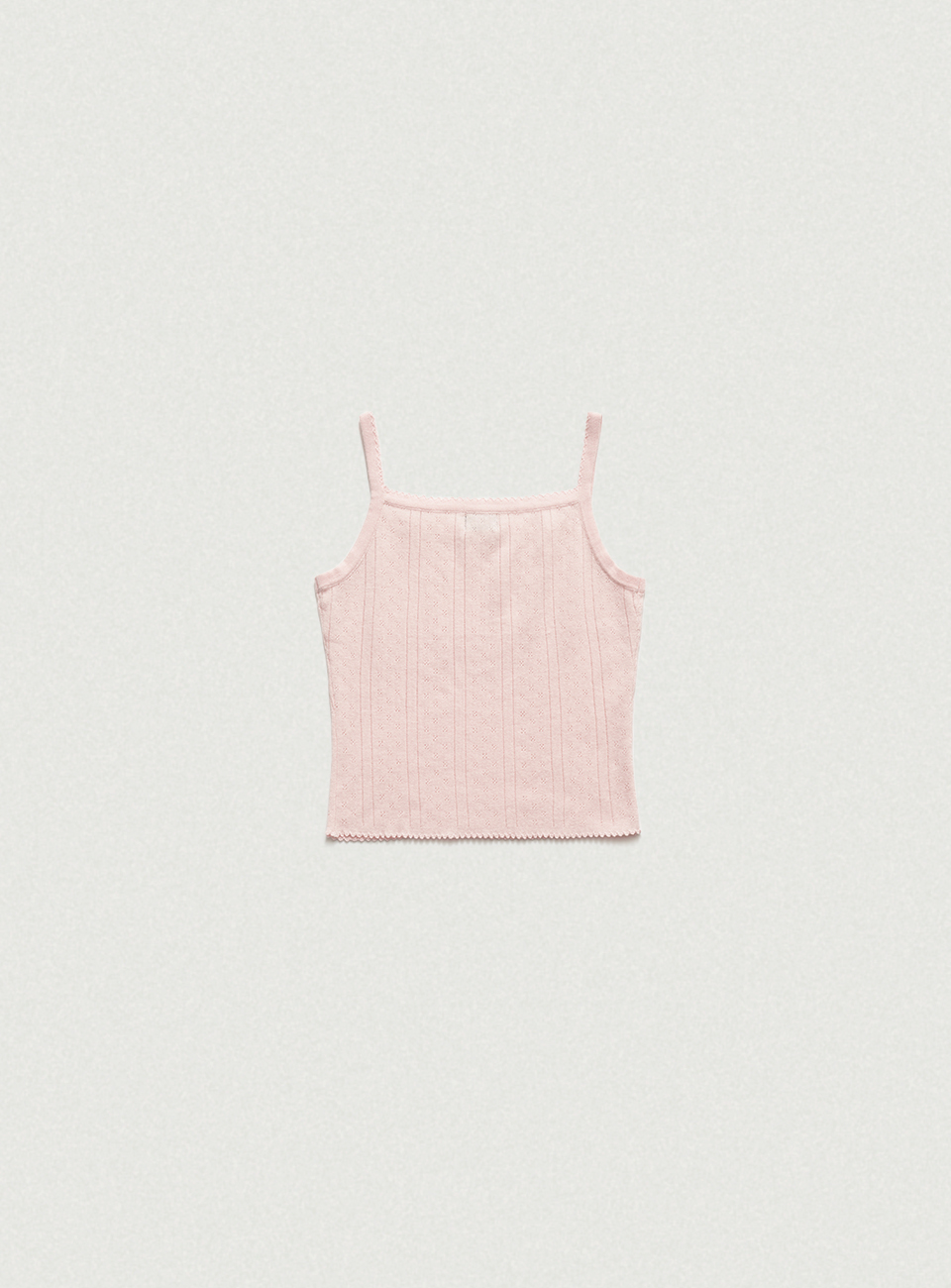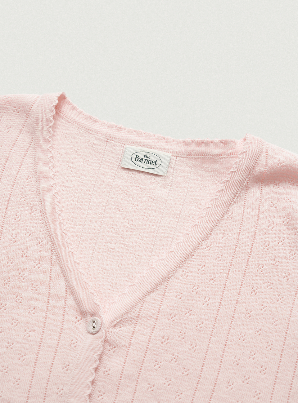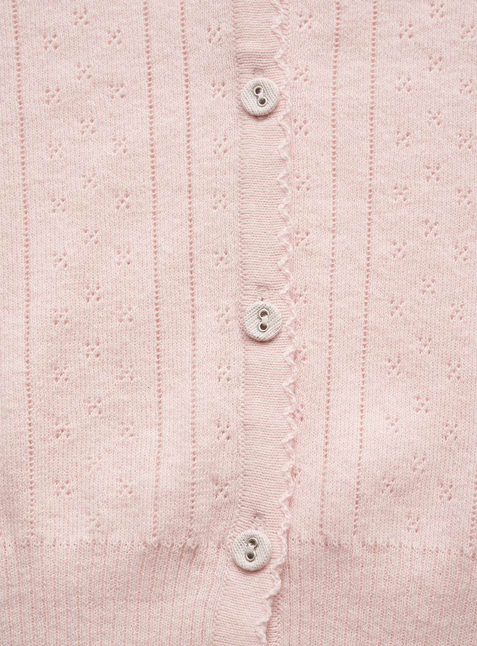 ほんのりとしたライトピンクカラーと、ポワンテル編み、なめらかなテクスチャーが際立つコットンニット