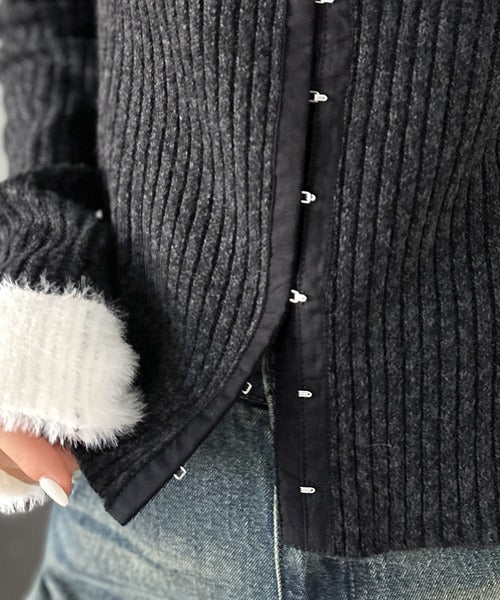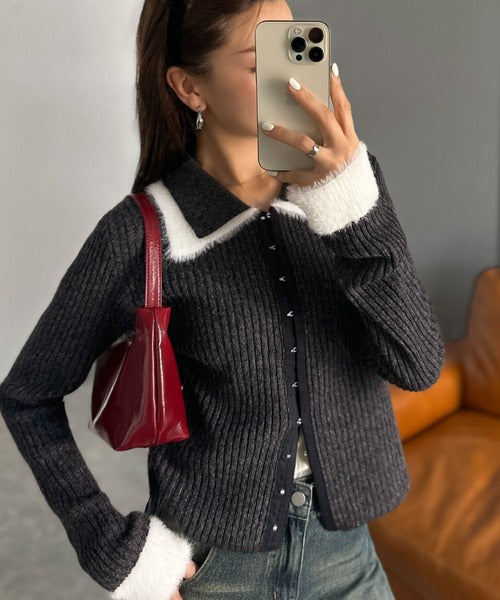 【mily bilet】レイヤード風で魅せる。異素材ダブル襟デザインリブニット素材フロントフックカーディガン(長袖) mi1029174