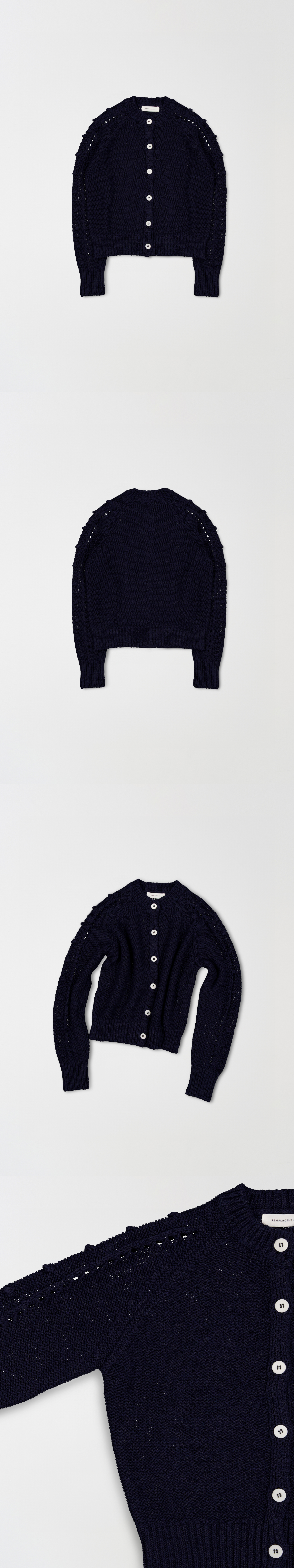 程よく厚みのある3ゲージ編みをベースに、袖部分にはクロシェ編みとドットのディテールをあしらい、ざっくりと立体的なテクスチャーに仕上げました。