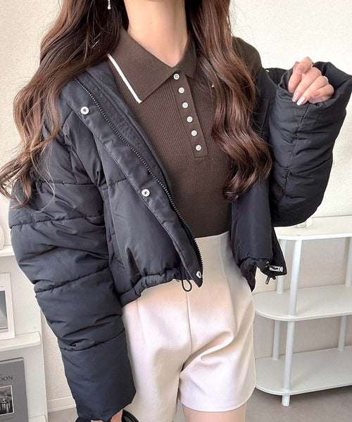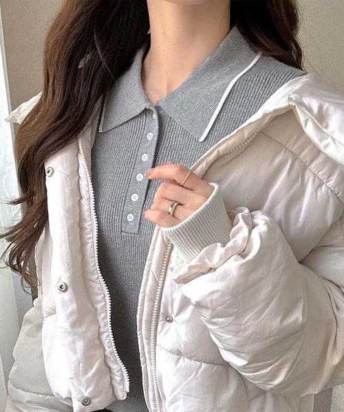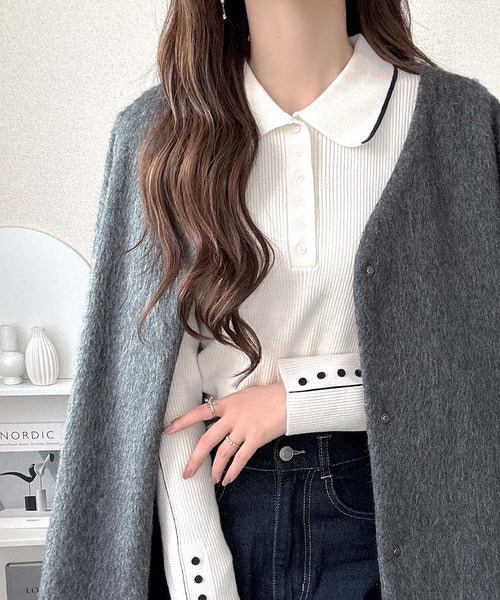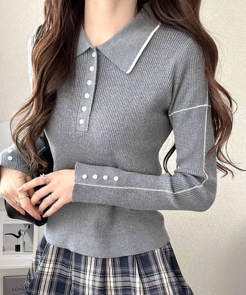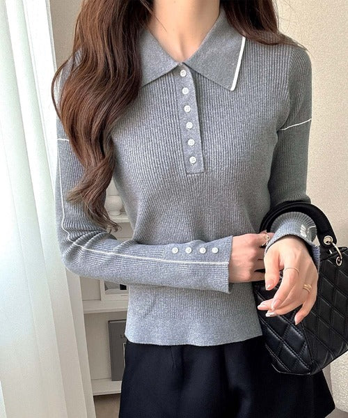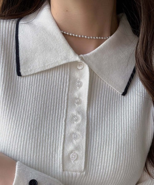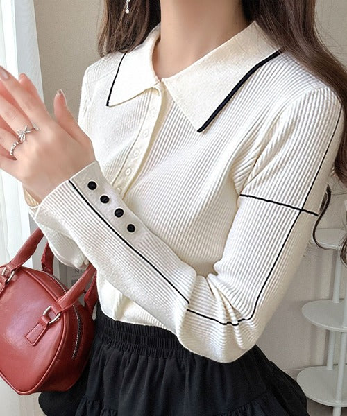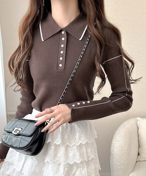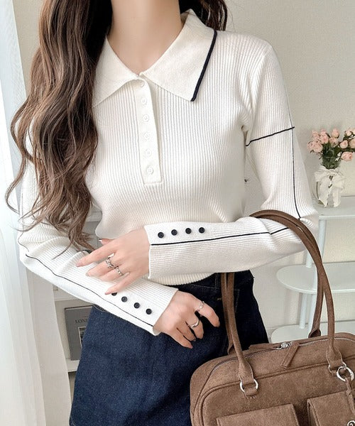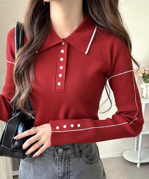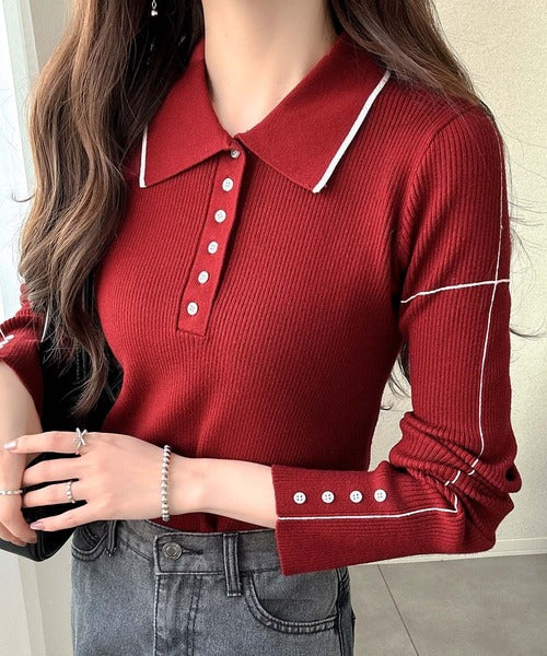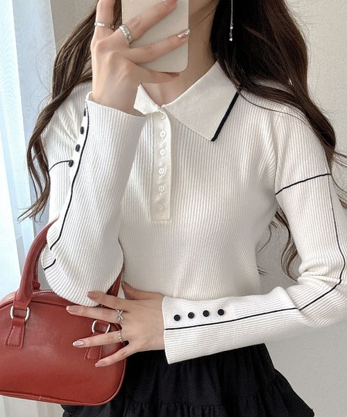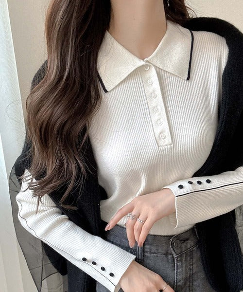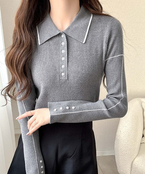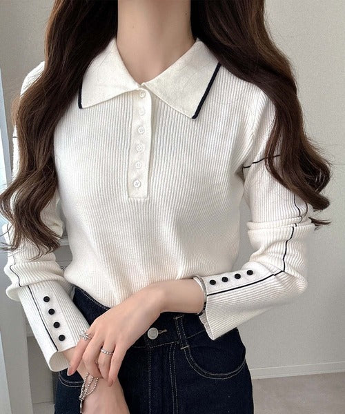 シンプルながらも女性らしいデザインのポロシャツ風のリブニット♪