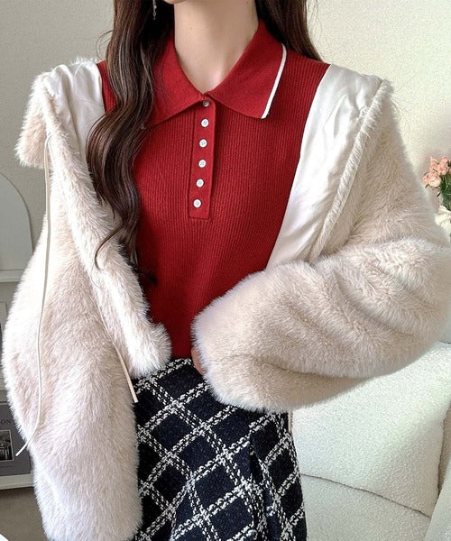 クラシカルなムード漂う配色切り替えのポロリブニット♪
