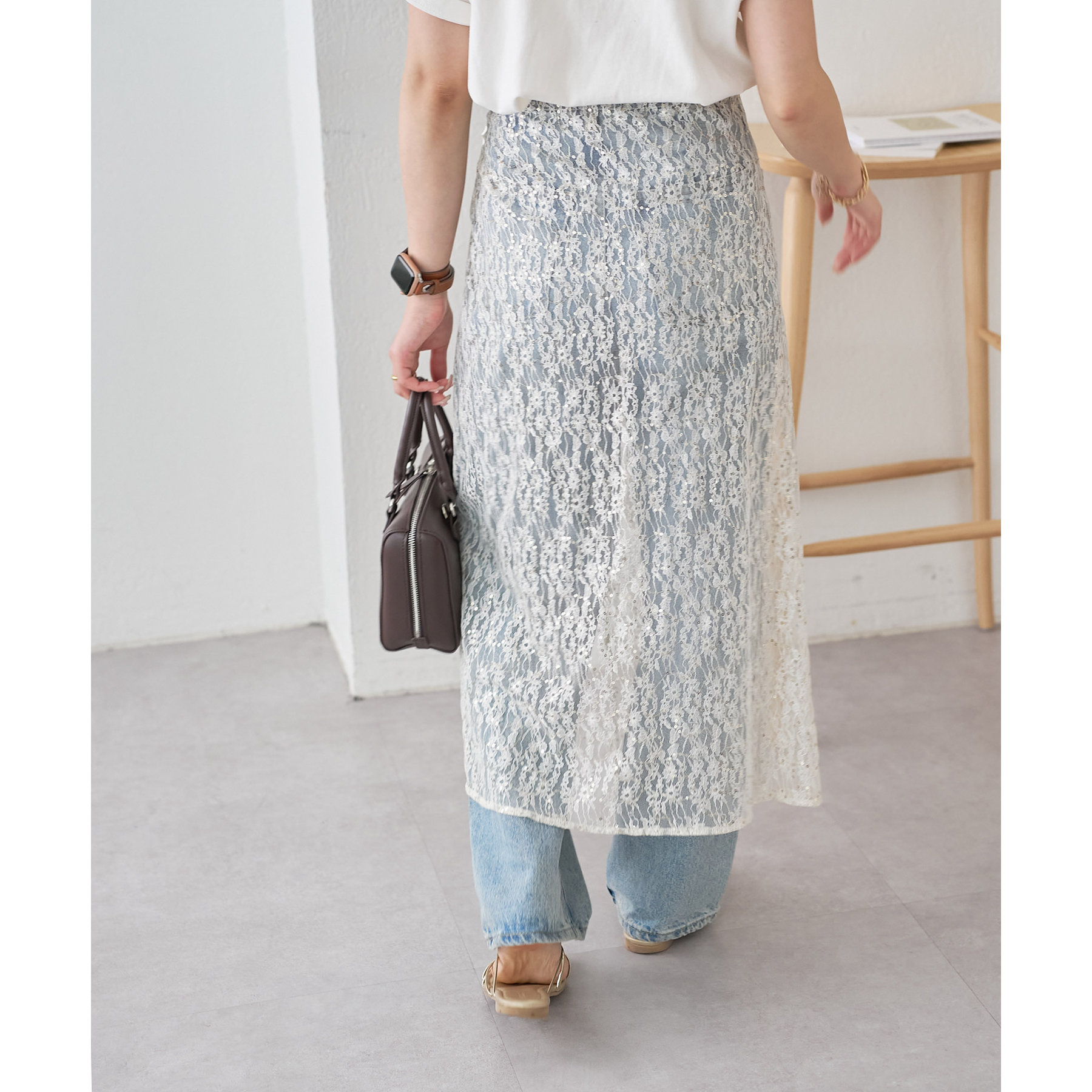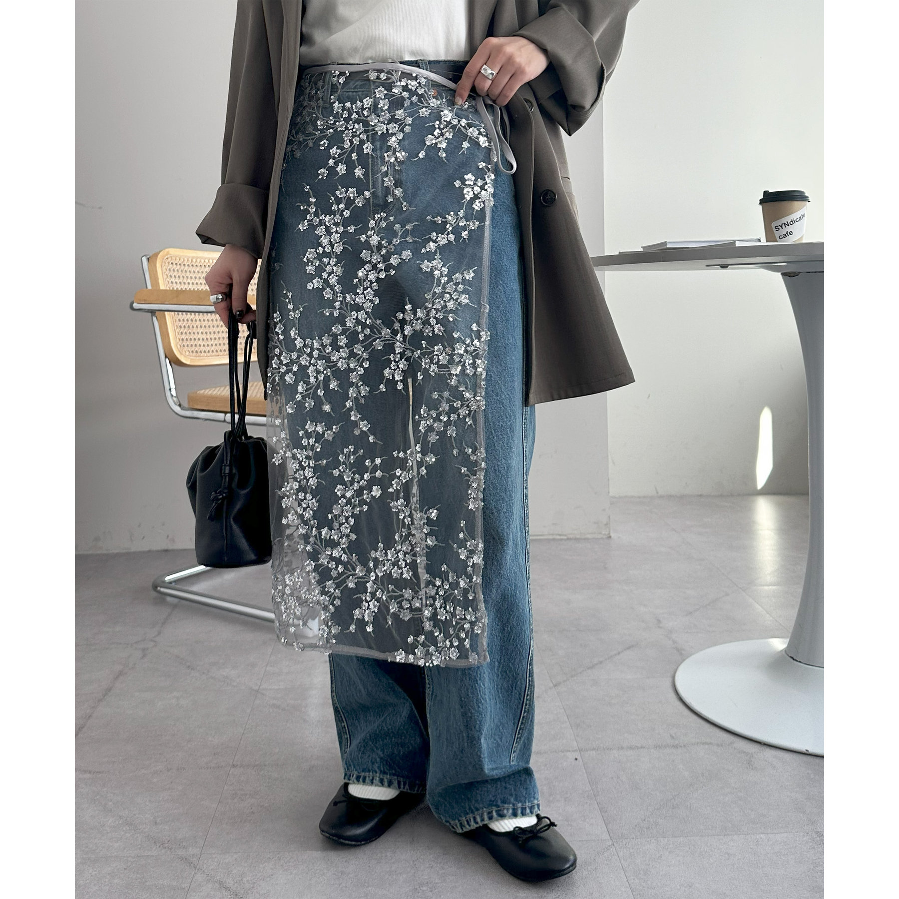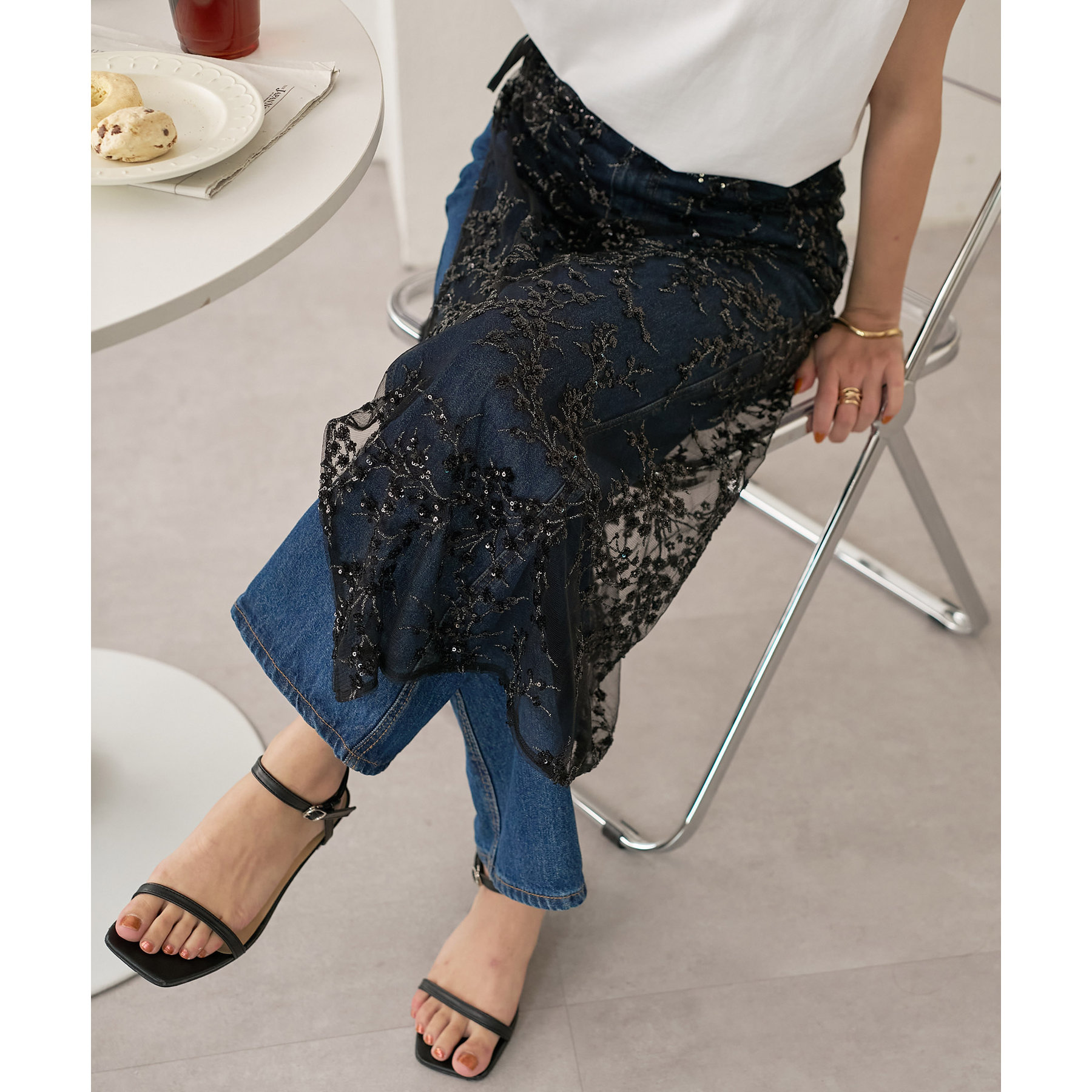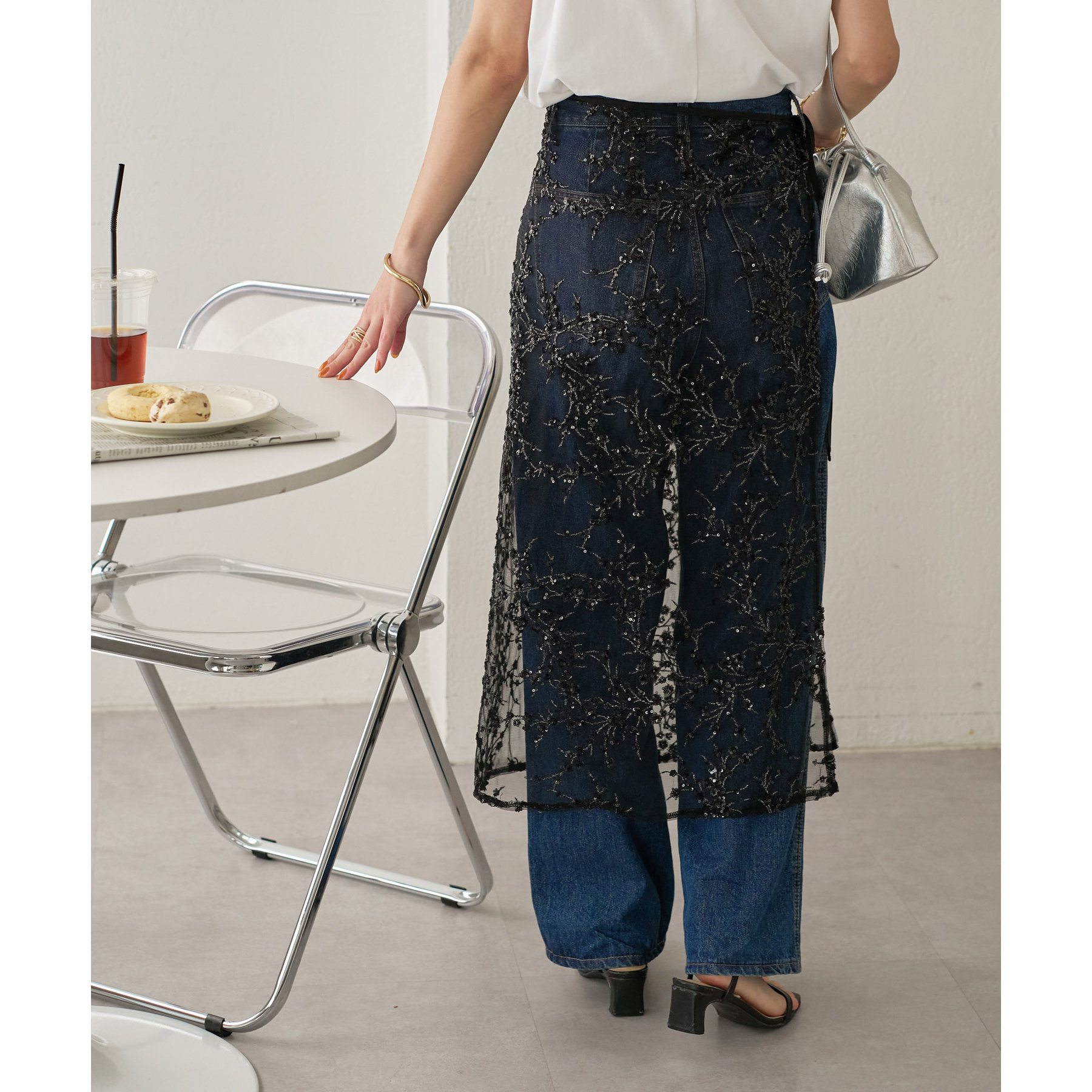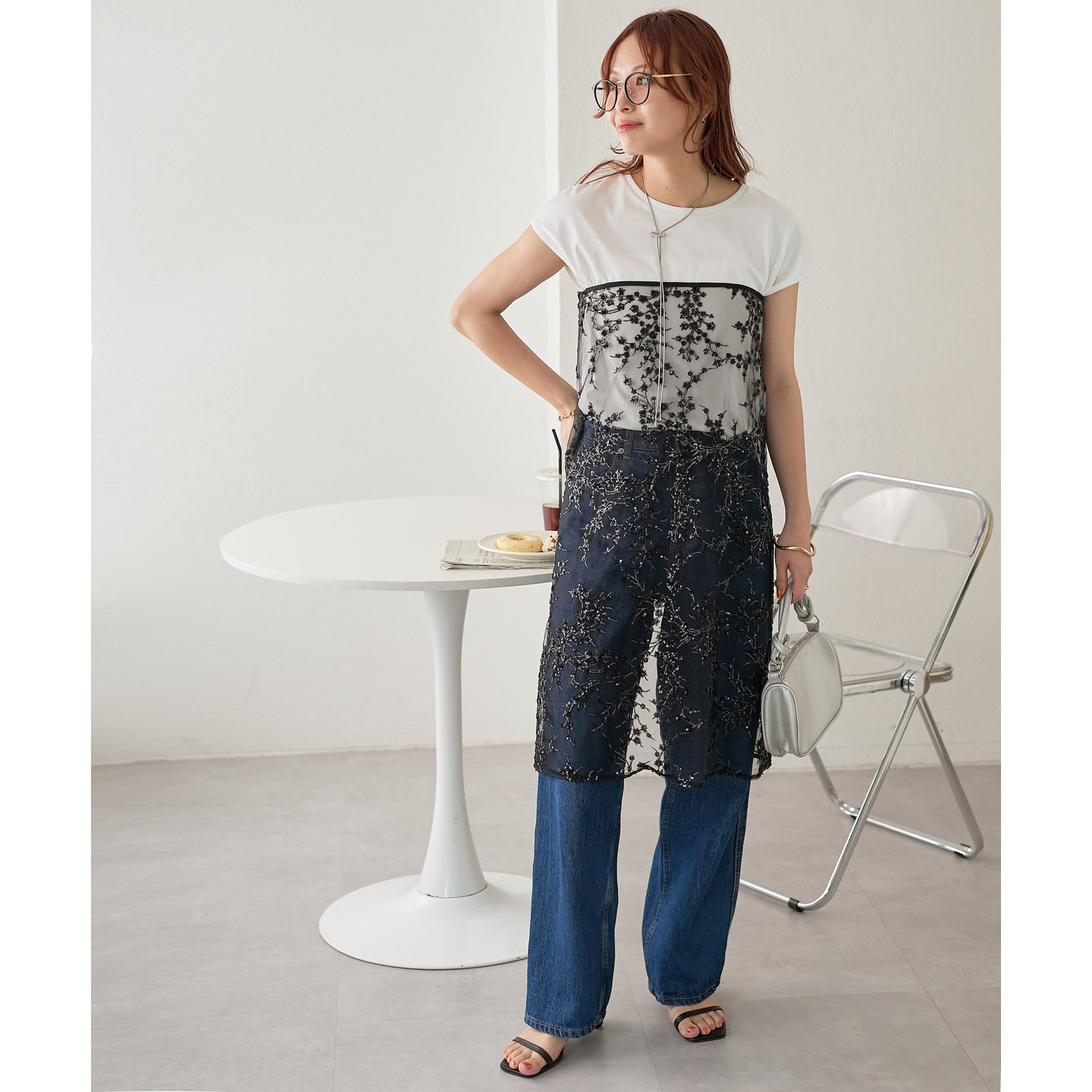 スパンコールのきらめきと透け感がレイヤードしても重たく見えにくく今年らしいトレンド感のあるコーデを楽しめます!