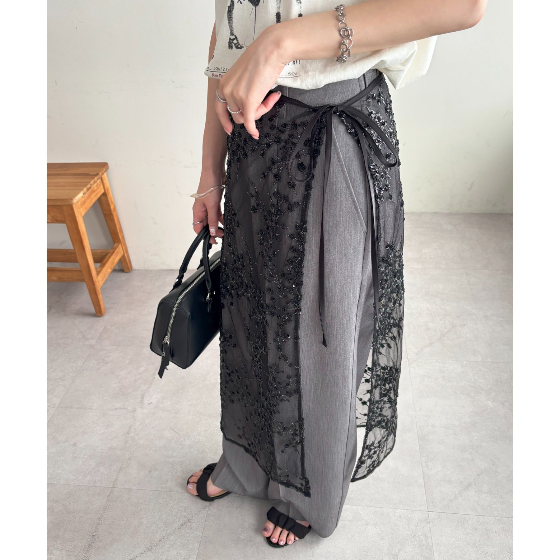 巻くだけでトレンドライクなコーデに仕上がるラップスカート。スパンコールが散りばめられたデザインで華やかな印象をプラスします〇